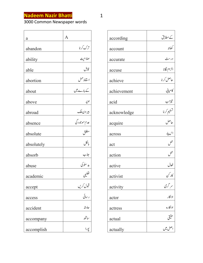 Nadeem Nazir Bhatti 1 3000 Common Newspaper words a A according ےکاطمقب abandon ترکرکنا account اھکہت ability الصحا accurate درسا able اقبا accuse ازلاماگلنا abortion ااقسطلمح achieve احلصرکنا about ےکنرےںیم above اورپ abroad achievement اکایمیب acid زیتاب ریبونکلم acknowledge میلسترکنا absence دعموموجدیگ acquire احلص absolute قلطم across اسنر absolutely نلکل act لمع absorb جذب action لمع abuse دبولسیک active اعفل academic یمیلعت activist اکرنک accept وبقلرکںی activity رسرگیم access راسیئ actor ادااکر accident احدہث actress ادااکرہ accompany اسھت actual یقیقح accomplish وپرا actually الصںیم Nadeem Nazir Bhatti 2 3000 Common Newspaper words ad ااہتشر advantage افدئہ adapt وماتقف adventure مہموجیئ add شلمرکںی advertising ااہتشر addition ااضہف advice وشمرہ additional ااضیف advise وشمرہ address ہتپ adviser ریشم adequate اکیف advocate ولیک ایذٹسجرکںی affair اعمہلم adjustment ایذٹنمٹسج affect اترادناز administration ااظتنہیم afford لمحتم administrator مظتنم afraid ڈرنا African افریقی adjust admire رعتفیرکنا admission داہلخ African-American admit میلست after ےکدعب adolescent ونرمع afternoon دورہپ adopt اانپےن again دونرہ adult نغل against الخف advance یگشیپ age advanced تریقنہتف agency افریقیارمیکی رمع ایسنجی Nadeem Nazir Bhatti 3 3000 Common Newspaper words agenda اڈنجیا alive زدنہ agent اٹنجی all امتم aggressive اجراحہن alliance ااحتد ago ےلہپ allow ااجز دںی agree قفتم ally ااحتدی agreement اعمدہہ almost رقتابی agricultural زریع alone اےلیک ah آہ along اسھت ahead آےگ already ےلہپےس aid ادماد also یھب aide اعمون alter دبتلی AIDS ایذز alternative ابتمدل aim دصقم although ارگہچ air وہا always ہشیمہ aircraft وہایئاہجز AM AM airline ارئیالنئ amazing ریح ازیگن airport وہایئاڈہ American ارمیکی album امبل among درایمن alcohol رشاب amount رمق Nadeem Nazir Bhatti 4 3000 Common Newspaper words analysis زجتہی anyone وکیئیھب analyst زجتہیاکر anything ھچکیھب analyze زجتہی anyway وےسییھب ancient دقمی anywhere ںیہکیھب and اور apart anger ہصغ apartment انرٹنمٹ angle زاوہی apparent اظہر ا angry نراض apparently اظبہر animal اجونر appeal الیپ anniversary اسرگلہ appear اظہروہنا announce االعن appearance وہظر annual اسالہن apple سا another ایاور application answer وجاب apply anticipate وتمعق appoint رقتری anxiety ےبینیچ appointment رقتری any وکیئیھب appreciate یکرعتفی anybody وکیئیھب approach ہطقنرظن anymore مریذ appropriate انمسا اگل دروخاسا دروخاسدںی Nadeem Nazir Bhatti 5 3000 Common Newspaper words approval وظنمری article ومضمن approve وظنمررکنا artist اکنفر approximately ابیا رقت ا artistic اکنفراہن Arab رعب as ےکوطررپ architect امعمر Asian اایشییئ area رہبق aside ایرطف argue ثحب ask وپانھچ argument دلیل asleep وسرےہںیہ arise اانھٹ aspect ولہپ arm نزو assault ہلمح armed حلسم assert دوعی army وفج assess around اردرگد assessment ادنازہاگلن تشخ یصےک arrange دنبوتسب asset انہث arrangement ااظتنم assign وفتضی arrest رگاتفری assignment وفتضی arrival آدم assist دمد arrive انچنہپ assistance دمد art نف assistant اٹنٹسس Nadeem Nazir Bhatti 6 3000 Common Newspaper words associate اوسییسایا audience اسنیعم association اوسییسانشی author فنصم assume فرضرکںی authority ادتقار assumption رفموہض auto آوٹ assure نیقیدالنا available دایتسب رپ average اوطس athlete الھکڑی avoid انچب athletic یت ا ھلیٹک award اویارڈ atmosphere اموحل aware آاگہ attach کلسنم awareness آاگیہ attack ہلمح away دور attempt وکشش awful وخانفک attend رشتک baby بچه attention وتہج back ےھچیپ attitude روہی background attorney اتخمر bad at attract اینپرطفوتمہج سپرظنم ترا badly تریرطح attractive رپششک bag گیب attribute وفص bake اکپن Nadeem Nazir Bhatti 7 3000 Common Newspaper words balance ہیقب be وہنا ball دنیگ beach اسلحدنمسر ban ندنبی bean ایلھپں band ڈنیب bear رھچی bank کنیب beat امرو bar نر beautiful وخوصبر barely لکشمب beauty وخوصبریت barrel ریبل because ویکہکن barrier راکوٹ become نب base اینبد bed رتسب baseball سیبنل bedroom basic اینبدی beer رئیب اینبدیوطررپ before ےلہپ basis اینبد begin رشوع basket وٹرکی beginning آاغز basketball نٹکسنل behavior ولسک bathroom نھتروم behind ےھچیپ battery رٹیبی being وہےنیکوہجےس battle جا belief نیقی basically ڈیبروم Nadeem Nazir Bhatti 8 3000 Common Newspaper words believe نیقی bill با bell یٹنھگ billion ارب belong قلعت bind ندنانھ below ےچین biological ایحایتیت belt ٹلیب bird رپدنہ bench چنیب birth دیپاشئ bend انکھج birthday اسرگلہ beneath ےچین bit وھتڑااس benefit افدئہ bite اکانٹ beside ےکنس black ایسہ besides اسےکالعوہ blade ڈیلب best رتہبنی blame ازلام bet رشطاگلنا blanket لبمک better رتہب blin