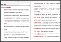 interne Vocabulaires SVT qui présente des replis complexes appelés crêtes mitochondriales projetés dans la matrice. Entre ces deux membranes 2BAC BIOF Pr. TAHIRI Mustapha Unité 1 : se trouve l’espace intermembranaire. La membrane interne limite la matrice à l’intérieur. Respiration cellulaire : C'est un ensemble de réactions aérobies qui se l'intérieur des cellules, dans laquelle baignent les organites produisent au niveau des mitochondries et à travers lesquelles l'énergie est produite sous la forme d’ATP (grande quantité). cytoplasmiques. Fermentation : C'est un ensemble de réactions anaérobies qui se décarboxylase) et d’autres molécules (Pi, ADP, ATP…). Fermentation lactique : Ce sont des réactions qui se produisent après Durant lesquelles il y a la dégradation de l’acétyle coenzyme A. lactique. dans le transfert des électrons et des protons (H+) vers l’accepteur final après la glycolyse en absence de l’oxygène, au niveau de l’hyaloplasme, (O2). d’éthanol. après l’oxydation des réducteurs (NADH,H+ et FADH+). travers lequel il y a la transformation du glucose en pyruvate. Mitochondrie : organite cellulaire contribué à la transformation d’énergie emmagasinée dans la matière organique. Cet organe est délimité par deux membranes : la membrane externe et la membrane La phosphorylation oxydative : ensemble des réactions qui conduit à la phosphorylation de l’ADP en ATP au niveau des sphères pédonculé, Glycolyse : est un processus commun à la respiration et la fermentation. Cette transformation ne demande pas de dioxygène, à Chaine respiratoire : C'est un ensemble des protéines situées au niveau de la membrane interne de la mitochondrie. Ces protéines contribuées Fermentation alcoolique : Ce sont des réactions qui se produisent où les molécules d'acide pyruvique transformées en molécules Cycle de cribs : ensemble de réactions de décarboxylation et de déshydrogénation se déroule au niveau de matrice mitochondriale. la glycolyse en absence de l’oxygène, au niveau de l’hyaloplasme, où les molécules d'acide pyruvique transformées en molécules d’acide Matrice mitochondriale : c’est la partie interne de la mitochondrie, caractérisée par l’existence des enzymes (déshydrogénase et produisent au niveau de l’hyaloplasme et à travers lesquelles l'énergie est produite sous la forme d’ATP (faible quantité). Hyaloplasme : ou cytosol, désigne la substance liquide retrouvée à Bilan énergétique : Le nombre de molécules d'ATP produites par oxydation de la matière organique. Rendement énergétique : le pourcentage d'énergie cellulaire utilisable. Muscle squelettique : est un muscle relié au squelette par son tendon, Tétanos parfait : chaque excitation se produit pendant la phase de et composé d’un ensemble de faisceaux musculaires séparés par un contraction de la secousse musculaire relative à l’excitation tissu conjonctif. précédente, les secousses fusionnent complètement. Faisceau musculaire : est constitué de plusieurs fibres musculaires. Fibre musculaire est une longue cellule cylindrique renfermant de relâchement de la secousse musculaire relative à l’excitation nombreux noyaux ovales et entourée par le sarcolemme (membrane précédente, les secousses fusionnent incomplètement. sarcoplasmique). filaments d’actine. stimulation successives. Sarcomère : est une zone comprise entre deux stries Z successives musculaire, et comporte de La chaleur de contraction et la chaleur de Contraction musculaire : résulte du raccourcissement de la longueur relâchement. Unité 2 : Recrutement : Le nombre des unités qui se contractent augmente suivant l’intensité de l’excitation ce qui fait élevée l’amplitude des contractions. Information génétique : ou le programme génétiques ou la matière génétique, c’est l'origine de tous les caractères héréditaires de tous les longueur diminue (se contracte) en réponse à une excitation. Loi de Rhéobase : Intensité minimale nécessaire pour déclencher une contraction musculaire. Excitabilité : Le muscle répond à une stimulation efficace (électrique, Contractilité : Le muscle strié squelettique est dit contractile, car sa Complexe d'actomyosine : est une liaison entre les têtes de myofilaments de myosine et myofilaments d’actine. Secousse musculaire : l’enregistrement obtenu lorsqu’on stimule le chimique, thermique). Chaleur initiale de contraction : se dégage pendant la secousse constitue l'unité structurelle et fonctionnelle de la myofibrille. est formée de 3 phases : latence, contraction, relâchement. Fatigue musculaire : une diminution progressive de l’amplitude des secousses jusqu’à l’immobilité complète du muscle après plusieurs muscle par une excitation électrique unique. La secousse musculaire Tétanos imparfait : chaque excitation se produit pendant la phase de Myofibrille : est constituée d'un faisceau de filaments de myosine et de du muscle, après l’application d’une excitation. êtres vivants animaux ou végétaux ou microorganismes. Mitose : est un processus de division cellulaire qui permet d'obtenir à partir d'une cellule mère, deux cellules filles identiques. La mitose comprend essentiellement quatre étapes : prophase, métaphase, anaphase, télophase. Cycle cellulaire : est un terme désigne l’ensemble des étapes par Caractère héréditaire : est un caractéristique qualitative ou lesquelles passe la cellule vivante entre deux divisions successives. Le quantitative, qui distingue un individu du reste des individus de son cycle cellulaire comporte deux étapes : l’interphase suivie de la mitose. espèce, et se transmet à travers les générations. Principe transformant : terme lancé par Griffith désigne l’un des Mutation : est donc un changement brusque dans un caractère qui est constituants de la bactérie S qui permet à des bactéries R de construire transmi