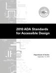 2010 ADA Standards for Accessible Design Department of Justice September 15, 2010 Reproduction of this document is encouraged. This publication may be viewed or downloaded from the ADA website (www.ADA.gov). Additional copies may be obtained by calling the ADA Information Line: 800-514-0301 (voice) 800-514-0383 (TTY) September 15, 2010 i Department of Justice Contents 1 Introduction...………………………………….............1 2 2010 Standards for State and Local Government Facilities: Title II.…...………....3 3 2010 Standards for Public Accommodations and Commercial Facilities: Title III……................15 4 2010 Standards for Titles II and III Facilities: 2004 ADAAG..…...........……...... 31 Department of Justice ii iii Department of Justice Overview The Department of Justice published revised regulations for Titles II and III of the Americans with Disabilities Act of 1990 "ADA" in the Federal Register on September 15, 2010. These regulations adopted revised, enforceable accessibility standards called the 2010 ADA Standards for Accessible Design "2010 Standards" or "Standards". The 2010 Standards set minimum requirements – both scoping and technical – for newly designed and constructed or altered State and local government facilities, public accommodations, and commercial facilities to be readily accessible to and usable by individuals with disabilities. Adoption of the 2010 Standards also establishes a revised reference point for Title II entities that choose to make structural changes to existing facilities to meet their program accessibility requirements; and it establishes a similar reference for Title III entities undertaking readily achievable barrier removal. The Department is providing this document with the official 2010 Standards in one publication. The document includes: • The 2010 Standards for State and local governments, which consist of the Title II regulations at 28 CFR 35.151 and the 2004 ADAAG at 36 CFR part 1191, appendices B and D; • The 2010 Standards for public accommodations and commercial facilities, which consist of the Title III regulations at 28 CFR part 36, subpart D, and the 2004 ADAAG at 36 CFR part 1191, appendices B and D. The Department has assembled into a separate publication the revised regulation guidance that applies to the Standards. The Department included guidance in its revised ADA regulations published on September 15, 2010. This guidance provides detailed information about the Department’s adoption of the 2010 Standards including changes to the Standards, the reasoning behind those changes, and responses to public comments received on these topics. The document, Guidance on the 2010 ADA Standards for Accessible Design, can be downloaded from www.ADA. gov. For More Information For information about the ADA, including the revised 2010 ADA regulations, please visit the Department’s website www.ADA.gov; or, for answers to specific questions, call the toll-free ADA Information Line at 800-514-0301 (Voice) or 800-514-0383 (TTY). Department of Justice 1 2 Department of Justice 2010 Standards for State and Local Government Facilities: Title II State and local government facilities must follow the requirements of the 2010 Standards, including both the Title II regulations at 28 CFR 35.151; and the 2004 ADAAG at 36 CFR part 1191, appendices B and D. In the few places where requirements between the two differ, the requirements of 28 CFR 35.151 prevail. Compliance Date for Title II If the start date for construction is on or after March 15, 2012, all newly constructed or altered State and local government facilities must comply with the 2010 Standards. Before that date, the 1991 Standards (without the elevator exemption), the UFAS, or the 2010 Standards may be used for projects when the start of construction commences on or after September 15, 2010. Department of Justice 2010 Standards: Title II - 3 4 - 2010 Standards: Title II Department of Justice Section 35.151 of 28 CFR Part 35 CONTENTS 28 CFR part 35.151 New Construction and Alterations (a) Design and construction, including the exception for structural impracticability….....….……………..........….…...................6 (b) Alterations, including alterations to historic properties, path of travel, and primary function ……....……………............................6 (c) Accessibility standards and compliance date .....…….….…….................9 (d) Scope of coverage…......…………………....................…..…........……...11 (e) Social service center establishments.….…….............................….........11 (f) Housing at a place of education……............................………................11 (g) Assembly areas.…………………………....................………..................12 (h) Medical care facilities ……………..…………..….........…..........….…......13 (i) Curb ramps.………...................………………....….................................13 (j) Facilities with residential dwelling units for sale to individual owners…………......……….............……….…............….....13 (k) Detention and correctional facilities..............................…..........…….....13 2004 ADAAG Chapter 1: Application and Administration.....….…........….....…........... 37 Chapter 2: Scoping Requirements..………............................…........…...50 Chapter 3: Building Blocks..….............................................….....…..….104 Chapter 4: Accessible Routes..……....................................….....…..…..117 Chapter 5: General Site and Building Elements..…...........….....…...…149 Chapter 6: Plumbing Elements and Facilities..……..........….....…....…159 Chapter 7: Communication Elements..…...................…....….....…...….186 Chapter 8: Special Rooms, Spaces, and Element