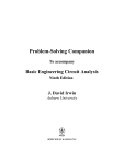 Problem-Solving Companion To accompany Basic Engineering Circuit Analysis Ninth Edition J. David Irwin Auburn University JOHN WILEY & SONS, INC. Executive Editor Assistant Editor Marketing Manager Senior Production Editor Bill Zobrist Kelly Boyle Frank Lyman Jaime Perea Copyright © 2005, John Wiley & Sons, Inc. All rights reserved No part of this publication may be reproduced, stored in a retrieval system or transmitted in any form or by any means, electronic, mechanical, photocopying, recording, scanning, or otherwise, except as permitted under Sections 107 or 108 of the 1976 United States Copyright Act, without either the prior written permission of the Publisher, or authorization through payment of the appropriate per-copy fee to the Copyright Clearance Center, 222 Rosewood Drive, Danvers, MA 01923, (508) 750-8400, fax (508) 7504470. Requests to the Publisher for permission should be addressed to the Permissions Department, John Wiley & Sons, Inc., 605 Third Avenue, New York, NY 10158-0012, (212) 850-6011, fax (212)850-6008, e-mail: PERMREQ@WILEY.COM. ISBN 0-471-74026-8 TABLE OF CONTENTS Preface……………………………………………………………………………………….2 Acknowledgement…………………..……………………………………………………….2 Chapter 1 Problems…………………..……………………………….……………………………………………3 Solutions…………………..…………………………………………………….………………………4 Chapter 2 Problems…………………..…………………………………………………….………………………7 Solutions…………………..…………………………………………………….………………………9 Chapter 3 Problems…………………..…………………………………………………….………………………18 Solutions…………………..…………………………………………………….………………………19 Chapter 4 Problems…………………..…………………………………………………….………………………25 Solutions…………………..…………………………………………………….………………………26 Chapter 5 Problems…………………..…………………………………………………….………………………31 Solutions…………………..…………………………………………………….………………………33 Chapter 6 Problems…………………..…………………………………………………….………………………42 Solutions…………………..…………………………………………………….………………………44 Chapter 7 Problems…………………..…………………………………………………….………………………50 Solutions…………………..…………………………………………………….………………………52 Chapter 8 Problems…………………..…………………………………………………….………………………66 Solutions…………………..…………………………………………………….………………………67 Chapter 9 Problems…………………..…………………………………………………….………………………73 Solutions…………………..…………………………………………………….………………………74 Chapter 10 Problems…………………..…………………………………………………….………………………82 Solutions…………………..…………………………………………………….………………………83 Chapter 11 Problems…………………..…………………………………………………….………………………88 Solutions…………………..…………………………………………………….………………………89 Chapter 12 Problems…………………..…………………………………………………….………………………94 Solutions…………………..…………………………………………………….………………………96 Chapter 13 Problems…………………..…………………………………………………….………………………103 Solutions…………………..…………………………………………………….………………………104 Chapter 14 Problems…………………..…………………………………………………….………………………111 Solutions…………………..…………………………………………………….………………………113 Chapter 15 Problems…………………..…………………………………………………….………………………127 Solutions…………………..…………………………………………………….………………………129 Chapter 16 Problems…………………..…………………………………………………….………………………136 Solutions…………………..…………………………………………………….………………………137 Appendix – Techniques for Solving Linear Independent Simultaneous Equations…………………………...146 2 STUDENT PROBLEM COMPANION To Accompany BASIC ENGINEERING CIRCUIT ANALYSIS, NINTH EDITION By J. David Irwin and R. Mark Nelms PREFACE This Student Problem Companion is designed to be used in conjunction with Basic Engineering Circuit Analysis, 8e, authored by J. David Irwin and R. Mark Nelms and published by John Wiley & Sons, Inc.. The material tracts directly the chapters in the book and is organized in the following manner. For each chapter there is a set of proble