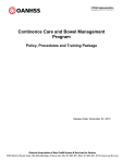Continence Care and Bowel Management Program Policy, Procedures and Training Package Release Date: December 22, 2010 OANHSS LTCHA Implementation Member Support Project Continence Care and Bowel Management Program: Policy, Procedures and Training Package Disclaimer The Ontario Association of Non-Profit Homes and Services for Seniors (OANHSS) Long-Term Care Homes Act (LTCHA) Implementation Member Support Project resources are confidential documents for OANHSS members only. Any review, retransmission, dissemination or other use of, or taking of any action in reliance upon this information, by persons or entities other than the intended recipients is prohibited without the approval of OANHSS. The opinions expressed by the contributors to this work are their own and do not necessarily reflect the opinions or policies of OANHSS. LTCHA Implementation Member Support Project resources are distributed for information purposes only. The Ontario Association of Non-Profit Homes and Services for Seniors is not engaged in rendering legal or other professional advice. If legal advice or other expert assistance is required, the services of a professional should be sought. December 22, 2010 Page 2 of 21 OANHSS LTCHA Implementation Member Support Project Continence Care and Bowel Management Program: Policy, Procedures and Training Package TABLE OF CONTENTS ABOUT THIS DOCUMENT .................................................................................................................................. 4 CONTINENCE CARE AND BOWEL MANAGEMENT PROGRAM ..................................................................... 5 Policy ........................................................................................................................................................ 5 Procedure ................................................................................................................................................. 6 APPENDIX A: BLADDER AND BOWEL CONTINENCE ASSESSMENT ......................................................... 12 APPENDIX B: BLADDER MONITORING RECORD ......................................................................................... 14 APPENDIX C: BOWEL MONITORING RECORD ............................................................................................. 15 APPENDIX D: CONTINENCE CARE PRODUCT EVALUATION FORMS ....................................................... 16 APPENDIX E: CONTINENCE CARE AND BOWEL MANAGEMENT PROGRAM TRAINING PRESENTATION FOR REGISTERED STAFF.................................................................................................. 18 APPENDIX F: CONTINENCE CARE AND BOWEL MANAGEMENT PROGRAM TRAINING PRESENTATION FOR FRONT-LINE STAFF ................................................................................................... 19 APPENDIX G: CONTINENCE PROMOTION AND MANAGEMENT ................................................................ 20 APPENDIX H: PREVENTION OF CONSTIPATION .......................................................................................... 21 December 22, 2010 Page 3 of 21 OANHSS LTCHA Implementation Member Support Project Continence Care and Bowel Management Program: Policy, Procedures and Training Package ABOUT THIS DOCUMENT The development and implementation of an interdisciplinary program for Continence Care and Bowel Management is a requirement of Regulation 51 of the Long-Term Care Homes Act, 2007 (LTCHA). This document contains sample program objectives, policy, procedures and staff training materials and tools that meet the minimum requirements of the LTCHA and regulation. This package is intended to be used as a resource for OANHSS member homes to modify and customize, as appropriate. This material can also be used by homes to review their current policies and procedures and compare content. Please note: The project team have compiled these materials during the fall of 2010, and as a result, the information is based on the guidance available at this time. Members will need to regularly review the Ministry of Health and LongTerm Care (MOHLTC) Quality Inspection Program Mandatory and Triggered Protocols to ensure that internal policies and procedures align to these compliance expectations. Program Evaluation: As described in the regulation, core clinical programs must be evaluated and updated at least annually by Long Term Care Homes, in accordance with evidence-based practices and if there are none, in accordance with prevailing practices. Note: a program evaluation approach is not included in this document. However, OANHSS is planning to develop resource materials on the topic of integrative program evaluation approaches for its members in the near future. Acknowledgements OANHSS gratefully acknowledges the contribution of written practices, resources and tools used in the development of this package from the following OANHSS Member Homes: • Belmont House • Registered Nurses Association of Ontario • St. Demetrius -Ukrainian Canadian Care Centre • The Perley and Rideau Veterans Health Centre In addition, OANHSS gratefully acknowledges the following individual practitioners that have shared their presentations for distribution: • Barbara Cowie (Cassel), RN, BScN, MN, GNC(C) Advanced Practice Nurse Nurse Continence Advisor West Park Healthcare Centre • Heather Woodbeck, Regional Best Practice Guideline Coordinator for Long Term Care Northwestern Ontario December 22, 2010 Page 4 of 21 OANHSS LTCHA Implementation Member Support Project Continence Care and Bowel Management Program: Policy, Procedures and Training Package CONTINENCE CARE AND BOWEL MANAGEMENT PROGRAM Purpose The purpose of the Continence Care and Bowel Management Program is to maintain an interdisciplinary team approach to continence care and bowel management, to facilitate improvement in bladder and bowel function in those who can improve, and to prevent deterioration of bladder/bowel function. The interdisciplina