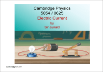 Cambridge Physics 5054 / 0625 Electric Current by Sir Junaid syedpaf@gmail.com 4.2.2 Electrical current : 1. Define electric current as the charge passing a point per unit time; recall and use the equation electric current = charge / time I=Q/t 2. Describe electrical conduction in metals in terms of the movement of free electrons 3. Know that current is measured in amps (amperes) and that the amp is given by coulomb per second (C / s) 4. Know the difference between direct current (d.c.) and alternating current (a.c.) 5. State that conventional current is from positive to negative and that the flow of free electrons is from negative to positive 6. Describe the use of ammeters (analogue and digital) with different ranges 4.2.3 Electromotive force and potential difference 1. Define e.m.f. (electromotive force) as the electrical work done by a source in moving a unit charge around a complete circuit; recall and use the equation e.m.f. = work done (by a source) / charge E=W/Q 2. Define p.d. (potential difference) as the work done by a unit charge passing through a component; recall and use the equation p.d. = work done (on a component) / charge V=W/Q 3. Know that e.m.f. and p.d. are measured in volts and that the volt is given by joule per coulomb ( J / C) 4. Describe the use of voltmeters (analogue and digital) with different ranges 5. Calculate the total e.m.f. where several sources are arranged in series 6. State that the e.m.f of identical sources connected in parallel is equal to the e.m.f. of one of the sources 4.2.4 Resistance 1. Recall and use the equation resistance = p.d. / current R=V/I 2. Describe an experiment to determine resistance using a voltmeter and an ammeter and do the appropriate calculations. 3. Recall and use, for a wire, the direct proportionality between resistance and length, and the inverse proportionality between resistance and cross-sectional area 4. State Ohm’s law, including reference to constant temperature 5. Sketch and explain the current–voltage graphs for a resistor of constant resistance, a filament lamp and a diode 6. Describe the effect of temperature increase on the resistance of a resistor, such as the filament in a filament lamp 4.3 Electric circuits 4.3.1 Circuit diagrams and circuit components 1. Draw and interpret circuit diagrams with cells, batteries, power supplies, generators, oscilloscopes, potential dividers, switches, resistors (fixed and variable), heaters, thermistors (NTC only), light-dependent resistors (LDRs), lamps, motors, ammeters, voltmeters, magnetising coils, transformers, fuses, relays, diodes and light-emitting diodes (LEDs), and know how these components behave in the circuit 4.3.2 Series and parallel circuits : 1. Recall and use in calculations, the fact that: (a) the current at every point in a series circuit is the same (b) the sum of the currents entering a junction in a parallel circuit is equal to the sum of the currents that leave the junction (c) the total p.d. across the components in a series circuit is equal to the sum of the individual p.d.s across each component (d) the p.d. across an arrangement of parallel resistances is the same as the p.d. across one branch in the arrangement of the parallel resistances 2. Calculate the combined resistance of two or more resistors in series 3. Calculate the combined resistance of two resistors in parallel 4. Calculate current, voltage and resistance in parts of a circuit or in the whole circuit 4.3.3 Action and use of circuit components 1. Describe the action of negative temperature coefficient (NTC) thermistors and lightdependent resistors and explain their use as input sensors 2. Describe the action of a variable potential divider 3. Recall and use the equation for two resistors used as a potential divider Main topics and sub-topics removed: • Use of a manometer • Transmission of pressure in hydraulic systems Main topics and sub-topics added: • Motion (additional learning objectives) • Balanced and unbalanced forces (additional learning objectives) • Equation for spring constant • Momentum • Principles of thermometry • Practical thermometers • The absolute scale of temperature • Latent heat (all learning objectives removed except one) • General properties of waves (additional learning objectives) • Methods of magnetisation and demagnetisation • Simple magnetism and magnetic fields (additional learning objectives) • Magnetic screening • • • Applications of electrostatic charging Electronics and electronic systems Equation for two resistors used as a potential divider • Detection of radioactivity (additional learning objectives) • Using decay equations • Space physics. 2 CURRENT ELECTRICITY A flow of charges through a conductor in 1 second is called electric current. The higher the current, the greater the flow of charge. The SI unit of current is the ampere (A) Conventional current direction is from positive to negative. Electrons flow from negative to positive CURRENT ELECTRICITY The flow of charges through a conductor in 1 second is called electric current. The SI unit of current is the ampere (A) Conventional current direction is from positive to negative. Electrons flow from negative to positive Conventional current Before the electron was discovered scientists agreed to think of current as positive charges moving round a circuit in the direction from positive to negative of a battery. This agreement still stands. Arrows on circuit diagrams show the direction of what we call the conventional current, i.e. the direction in which positive charges would flow. Electrons flow in the opposite direction to the conventional current. Current: Current is the rate of flow of charges through a conductor. � I = � Q=I×t Q= charges , I = Current , t = time The electric current flowing in a circuit can be measured by an AMMETER How to use an Ammeter Example question 1 In 10 second 60 C of charge flows around the circuit. Calculate the curr