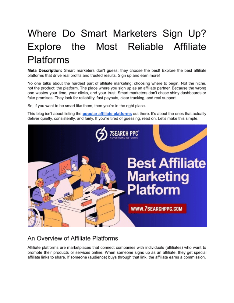 Where Do Smart Marketers Sign Up? Explore the Most Reliable Affiliate Platforms Meta Description: Smart marketers don't guess; they choose the best! Explore the best affiliate platforms that drive real profits and trusted results. Sign up and earn more! No one talks about the hardest part of affiliate marketing: choosing where to begin. Not the niche, not the product; the platform. The place where you sign up as an affiliate partner. Because the wrong one wastes your time, your clicks, and your trust. Smart marketers don't chase shiny dashboards or fake promises. They look for reliability, fast payouts, clear tracking, and real support. So, if you want to be smart like them, then you're in the right place. This blog isn't about listing the popular affiliate platforms out there. It's about the ones that actually deliver quietly, consistently, and fairly. If you're tired of guessing, read on. Let's make this simple. An Overview of Affiliate Platforms Affiliate platforms are marketplaces that connect companies with individuals (affiliates) who want to promote their products or services online. When someone signs up as an affiliate, they get special affiliate links to share. If someone (audience) buys through that link, the affiliate earns a commission. Become an Affiliate Now – It’s Free and Easy! These affiliate marketing platforms help track sales, clicks, and payments. They make it easy for businesses to grow through online marketing and for individuals to earn money by promoting products or services they like. Core Elements of Affiliate Platforms The best affiliate platforms rely on a range of core elements to function efficiently. Here's a breakdown of the core elements of PPC affiliate platforms: ● Affiliate Dashboard: A central place where affiliates can track clicks, sales, and earnings in real-time. ● Merchant Dashboard: A centralized hub where merchants manage affiliates and track sales and other activity. ● Unique Tracking Links: Special links that help trace which affiliate drove a sale or lead. ● Commission Structure: A clear outline of how much affiliates earn per sale or action. ● Payout System: The method and schedule for sending affiliates their earnings. ● Marketing Materials: Ready-to-use banners, email templates, and creatives to help affiliates promote. ● Performance Analytics: Insights that show which products, links, and other things are doing well. ● Fraud Detection Tools: Systems that catch fake clicks or dishonest activity to protect the platform. Benefits of Using Affiliate Platforms Are you looking to use an affiliate marketing platform? That's a good move. Why? Let's find out. Multiple Affiliate Programs in One Place Affiliate platforms let you browse and join a wide range of high-paying affiliate programs in one place. Instead of signing up for each brand separately, you can manage everything from a single dashboard. Easy Performance Tracking You get built-in tools to track how your links are doing: clicks, conversions, sales, and more. This makes it easier to see the performance of your affiliate marketing efforts. Consistent Payouts One of the biggest perks is getting paid on time. Most platforms handle the payments for you, so you don't have to chase down brands or worry about getting paid late. It's one less thing to stress about. Helpful Marketing Tools You usually get access to banners, pre-made links, customized affiliate marketing messages, and even email templates to help you promote products more effectively. These ready-made resources can save you hours and make your content look more polished and professional. More Trust and Security Affiliate platforms have systems in place to detect fraud and make sure your commissions are tracked accurately. That means less chance of lost sales and more confidence that you'll get credit for your efforts. The Best Affiliate Marketing Platforms and Programs Here is a list of some of the best affiliate marketing platforms and programs based on popularity, ease of use, and commission structures. 7Search PPC Affiliate Program 7Search PPC, which is generally popular as an ad network and is often used as a top alternative to Google Ads, is now gaining popularity with the launch of its affiliate program. The 7Search PPC affiliate program allows affiliates to earn by promoting its advertising platform to publishers and advertisers. It's simple to join, and once approved, affiliates get access to a personalized and separate dashboard to track clicks, payments, and conversions. Here are the benefits that you will get after joining one of the best affiliate programs for marketers at 7Search PPC ● Affiliates can receive a commission of up to 10% on every transaction made by their referred person. ● The referred person will receive up to 35% as a welcome bonus. ● 24/7 support is available year-round. Shopify Shopify Collabs is a beginner-friendly affiliate platform connecting influencers with Shopify brands. It's ideal for creators looking to monetize content easily. The best thing about this affiliate marketing platform is that it is easily accessible: Here is what you get: ● ● ● ● Instant affiliate link creation, Auto payouts after 30 days, Payments via PayPal or bank transfer, Dedicated affiliate support. AWIN AWIN is a popular global affiliate marketing network that connects publishers with over 25,000 brands. It is especially well-regarded in the UK and Europe and offers an easy-to-use platform. Here are some benefits of using AWIN. ● ● ● ● User-friendly interface with easy link and product feed creation, Suitable for social media influencers, Bi-monthly payments with a low $20 threshold, Unlimited earning opportunities. Conclusion In affiliate marketing, picking the right platform is key to making money. It's not just about picking any platform or network; you need to choose one that fits your goals and helps you succeed. Many big names have proven to be wrong, but the name I pro