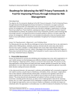 Roadmap for Advancing the NIST Privacy Framework January 16, 2020 Roadmap for Advancing the NIST Privacy Framework: A Tool for Improving Privacy through Enterprise Risk Management Introduction The objective for this companion Roadmap to the NIST Privacy Framework: A Tool for Improving Privacy through Enterprise Risk Management (Privacy Framework or Framework) is to support continued collaboration between NIST and stakeholders from across government, academia, and industry on privacy risk management. It discusses priority areas that pose challenges to organizations in achieving their privacy objectives. These important, evolving areas require continued focus or further research and development to advance the evolution of the Privacy Framework; promote a well-functioning data processing ecosystem; and expand the body of standards, guidance, practices, and tools supporting privacy risk management. While this list is not intended to be exhaustive, these are important topics based on input and feedback received from stakeholders throughout the Framework development process. Areas for Development, Alignment, and Collaboration The following priority areas describe key challenges and some initial activities that can be undertaken to address them. While guidance, standards, practices, and tools exist for some areas, they need to become more mature, available, or widely adopted. Some areas reflect needs directly related to outcomes in the Framework Core (e.g., where a Subcategory lacks informative references). Progress in these areas may feed into future updates to the Framework or result in resources that can be shared in the Privacy Framework Resource Repository. 1. Privacy Risk Assessment Privacy risk assessment is a process for identifying and evaluating privacy risks, which organizations can use to build customer trust by developing more effective solutions to protecting individuals’ privacy when designing or deploying systems, products, and services that process data. This process can also help organizations to bring privacy into parity with their broader portfolio of enterprise risks, driving development of a more robust and comprehensive enterprise risk management approach to promote better decision-making and resource allocation. In the cybersecurity domain, risk assessment is relatively well established, with a commonly recognized risk model for analysis using the factors of likelihood, vulnerability, threat, and impact.1 Organizations have at their disposal a substantial body of both public- and private-sector guidance and tools to support cybersecurity risk assessment. This wealth of resources does not yet exist in the privacy domain.2 The privacy domain lacks development and uptake of uniform concepts of privacy risk assessment, including specific risk factors, as well as more in-depth guidance and tools for assessing privacy risks. As a result, organizations find it challenging to integrate privacy risk assessment into their risk management approaches, assess and measure impacts to individuals, and reflect the impacts to individuals within the organization in actionable ways. In an effort to advance the discipline, the Privacy 1 NIST Special Publication 800-30, rev 1, Guide for Conducting Risk Assessments. 2 NIST Summary Analysis of the Responses to the NIST Privacy Framework Request for Information. 1 Roadmap for Advancing the NIST Privacy Framework January 16, 2020 Framework’s Risk Assessment Category (ID.RA-P) includes NIST’s proposed privacy risk factors (i.e., likelihood, problematic data action, and impact) but NIST recognizes more work is needed to reach a common privacy risk model and more effective privacy risk assessment practices. Priority activities include: • workshops or roundtables to further develop concepts of privacy risk assessment; • development of more in-depth guidance and tools for privacy risk assessment and an integrated approach with cybersecurity guidance; and, • collaboration and engagement with stakeholders in integrating privacy into enterprise risk management guidance. 2. Mechanisms to Provide Confidence Organizations can use mechanisms to provide confidence to show that a system, product, or service meets specified requirements. These mechanisms can include audits, assessments and evaluations, and formal conformity assessment activities such as inspection, testing, supplier declaration, or certification. Effective confidence mechanisms provide the needed level of assurance, are efficient, drive improvement, and have a sustainable and scalable business case. An organization can use the output of these mechanisms to enhance its understanding of its Framework Profile implementation and benchmark the effectiveness of its privacy protections. The privacy domain generally lacks confidence mechanisms, posing a challenge to organizations in demonstrating the effectiveness of privacy protections. More research is needed to understand organizations’ challenges and needs with respect to confidence mechanisms for privacy. Resources in the cybersecurity domain could serve as models of what could be developed in the privacy domain. For example, the Baldridge Cybersecurity Excellence Builder is a self-assessment tool to help organizations better understand the effectiveness of their cybersecurity risk management efforts and identify improvement opportunities in the context of their overall organizational performance.3 While NIST does not endorse any commercial approach, NIST does encourage and support a diverse, market-based set of approaches to instill confidence. Priority activities include: • engagement with organizations on framework implementation to learn about their challenges and needs regarding confidence mechanisms, and • collaboration with stakeholders, including in standards development organizations, to develop standards or guidance on assessment procedures or criteria. 3. Emerging Technologies A key challenge for the privacy field has 