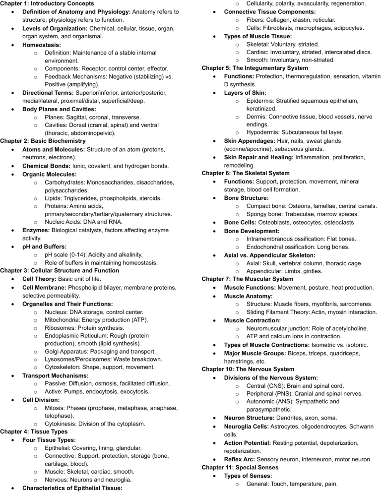 Chapter 1: Introductory Concepts Definition of Anatomy and Physiology: Anatomy refers to structure; physiology refers to function. Levels of Organization: Chemical, cellular, tissue, organ, organ system, and organismal. Homeostasis: o Definition: Maintenance of a stable internal environment. o Components: Receptor, control center, effector. o Feedback Mechanisms: Negative (stabilizing) vs. Positive (amplifying). Directional Terms: Superior/inferior, anterior/posterior, medial/lateral, proximal/distal, superficial/deep. Body Planes and Cavities: o Planes: Sagittal, coronal, transverse. o Cavities: Dorsal (cranial, spinal) and ventral (thoracic, abdominopelvic). Chapter 2: Basic Biochemistry Atoms and Molecules: Structure of an atom (protons, neutrons, electrons). Chemical Bonds: Ionic, covalent, and hydrogen bonds. Organic Molecules: o Carbohydrates: Monosaccharides, disaccharides, polysaccharides. o Lipids: Triglycerides, phospholipids, steroids. o Proteins: Amino acids, primary/secondary/tertiary/quaternary structures. o Nucleic Acids: DNA and RNA. Enzymes: Biological catalysts, factors affecting enzyme activity. pH and Buffers: o pH scale (0-14): Acidity and alkalinity. o Role of buffers in maintaining homeostasis. Chapter 3: Cellular Structure and Function Cell Theory: Basic unit of life. Cell Membrane: Phospholipid bilayer, membrane proteins, selective permeability. Organelles and Their Functions: o Nucleus: DNA storage, control center. o Mitochondria: Energy production (ATP). o Ribosomes: Protein synthesis. o Endoplasmic Reticulum: Rough (protein production), smooth (lipid synthesis). o Golgi Apparatus: Packaging and transport. o Lysosomes/Peroxisomes: Waste breakdown. o Cytoskeleton: Shape, support, movement. Transport Mechanisms: o Passive: Diffusion, osmosis, facilitated diffusion. o Active: Pumps, endocytosis, exocytosis. Cell Division: o Mitosis: Phases (prophase, metaphase, anaphase, telophase). o Cytokinesis: Division of the cytoplasm. Chapter 4: Tissue Types Four Tissue Types: o Epithelial: Covering, lining, glandular. o Connective: Support, protection, storage (bone, cartilage, blood). o Muscle: Skeletal, cardiac, smooth. o Nervous: Neurons and neuroglia. Characteristics of Epithelial Tissue: o Cellularity, polarity, avascularity, regeneration. Connective Tissue Components: o Fibers: Collagen, elastin, reticular. o Cells: Fibroblasts, macrophages, adipocytes. Types of Muscle Tissue: o Skeletal: Voluntary, striated. o Cardiac: Involuntary, striated, intercalated discs. o Smooth: Involuntary, non-striated. Chapter 5: The Integumentary System Functions: Protection, thermoregulation, sensation, vitamin D synthesis. Layers of Skin: o Epidermis: Stratified squamous epithelium, keratinized. o Dermis: Connective tissue, blood vessels, nerve endings. o Hypodermis: Subcutaneous fat layer. Skin Appendages: Hair, nails, sweat glands (eccrine/apocrine), sebaceous glands. Skin Repair and Healing: Inflammation, proliferation, remodeling. Chapter 6: The Skeletal System Functions: Support, protection, movement, mineral storage, blood cell formation. Bone Structure: o Compact bone: Osteons, lamellae, central canals. o Spongy bone: Trabeculae, marrow spaces. Bone Cells: Osteoblasts, osteocytes, osteoclasts. Bone Development: o Intramembranous ossification: Flat bones. o Endochondral ossification: Long bones. Axial vs. Appendicular Skeleton: o Axial: Skull, vertebral column, thoracic cage. o Appendicular: Limbs, girdles. Chapter 7: The Muscular System Muscle Functions: Movement, posture, heat production. Muscle Anatomy: o Structure: Muscle fibers, myofibrils, sarcomeres. o Sliding Filament Theory: Actin, myosin interaction. Muscle Contraction: o Neuromuscular junction: Role of acetylcholine. o ATP and calcium ions in contraction. Types of Muscle Contractions: Isometric vs. isotonic. Major Muscle Groups: Biceps, triceps, quadriceps, hamstrings, etc. Chapter 10: The Nervous System Divisions of the Nervous System: o Central (CNS): Brain and spinal cord. o Peripheral (PNS): Cranial and spinal nerves. o Autonomic (ANS): Sympathetic and parasympathetic. Neuron Structure: Dendrites, axon, soma. Neuroglia Cells: Astrocytes, oligodendrocytes, Schwann cells. Action Potential: Resting potential, depolarization, repolarization. Reflex Arc: Sensory neuron, interneuron, motor neuron. Chapter 11: Special Senses Types of Senses: o General: Touch, temperature, pain. o Special: Vision, hearing, taste, smell, equilibrium. Vision: o Eye anatomy: Retina, lens, cornea, optic nerve. o Photoreceptors: Rods (low light), cones (color). Hearing: o Ear anatomy: Outer, middle, inner (cochlea, semicircular canals). o Mechanism of hearing: Sound waves to neural impulses. Taste and Smell: o Chemoreceptors: Taste buds, olfactory receptors. o Connection to limbic system. Equilibrium: Role of vestibular apparatus.