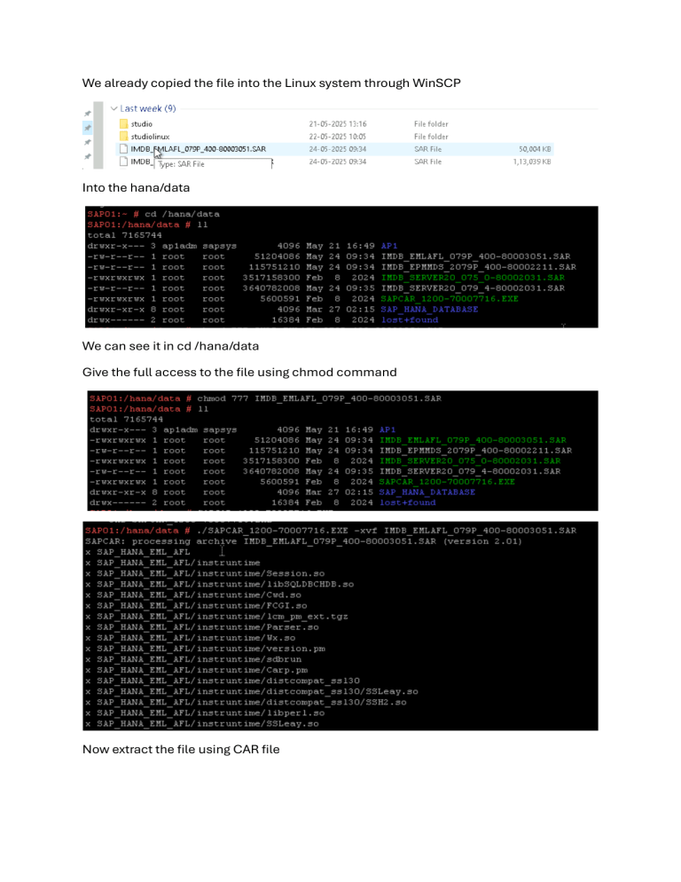We already copied the file into the Linux system through WinSCP Into the hana/data We can see it in cd /hana/data Give the full access to the file using chmod command Now extract the file using CAR file We can see the SAP_HANA_EML_AFL Now install using hdbinst Now go to hana shared directory Go to AP1 database system Change directory to exe cd to linuxx86_64 now cd to plugins Here you can see the installed plugin In Hana studio Open administration you can see the plugins Done.