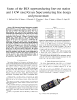 1 Status of the IRIS superconducting line test station and 1 GW rated Green Superconducting line design and procurement S. Maffezzoli Felis, M. Statera, A. Chiuchiolo, D. D’Agostino, L. Rossi, C. Santini, A. Musso, G. Angeli, M. Bocchi Abstract—IRIS (Innovative Research Infrastructure on applied Superconductivity) is a major project to build a research infrastructure in applied superconductivity, recently approved in Italy and led by INFN. The design and delivery of a Green Superconducting Line (GSL) for power transmission and the construction and commissioning of a test station for GSLs testing are two key deliverables of the project. The test station is under construction at the University of Salerno. It foresees the main building, and a outdoor space for 130 m long cable lodging. Into the building there will be the current and voltage power supplies (40 kA and 50 kV, respectively), a 500W@20K Herefrigerator, monitor and control systems and diagnostics for GSLs testing. The facility will be kept open to external institutions and companies engaged in the same research field. The GSL will be 130m long and designed to carry 40 kA at 20K, isolated for 25 kV operation, i.e. 1 GW of power, with almost zero dissipation. The GSL will be used for the commissioning of the test station. In this paper we will present the line configuration. We updated the design of the line from a four conductors (two phases and two spares for redundancy) inside the same cryostat configuration to a three conductors (two phases and a spear) each inside its own cryostat, in order to have a better insulation between them in case of failure of one phase. Details and preliminary analysis of the updated line design will be presented. TABLE I S UMMARY OF GSL M AIN C HARACTERISTICS Superconductor Voltage Operating temperature Line length Expected losses Bending radius Inner pressure M gB2 25 kV 20 K 130 m 1.5 W/m @ 20 K 2.2 m 10 bar expertise in superconductivity for accelerator applications by enhancing existing facilities with advanced instrumentation. As part of the IRIS project, an innovative demonstrator known as the Green Superconducting Line (GSL), a 1 GW power transmission line, is being developed. This line is scheduled for production by the end of 2025 by ASG in Genoa. A render of the line is shown in Figure 1. The GSL will be tested at a new cable testing facility in Salerno that will be available for use by companies and research institutes for at least ten years. This article presents the updates on the preliminary analysis conducted on the Green Superconducting Line due to the new design, and of the new facility in Salerno1 . I. I NTRODUCTION The Italian Minister for University and Research has recently provided funding for the Innovative Research Infrastructure on applied Superconductivity (IRIS) initiative in Italy [1]. This initiative includes a collaboration among existing laboratories from various institutes, such as INFN (which leads the project with four laboratories in Frascati, Genoa, Milan, and Salerno), CNR (SPIN institutes in Genoa, Naples, and Salerno), and five universities: Genoa, Milan, Naples, Salento, and Salerno. The primary goal of IRIS is to strengthen Italy’s II. G REEN S UPERCONDUCTING L INE The Green Superconducting Line (GSL) is a 130-meter direct current (DC) power transmission line designed to transport 1 GW of power at a medium voltage of 25 kV and 1 This work is part of the project IR0000003 - IRIS supported by the NextGeneration EU-funded Italian National Recovery and Resilience Plan with the Decree of the Ministry of University and Research number 124 (21/06/2022) for the Mission 4 - Component 2 - Investment 3.1. S. Maffezzoli Felis is with the Laboratory of Acceleration and Applied Superconductivity, National Institute for Nuclear Physics (INFN), Milan 20054, Italy and also with the Sapienza University of Rome, Rome 00185, Italy. Marco Statera and C. Santini are with the Laboratory of Acceleration and Applied Superconductivity, National Institute for Nuclear Physics (INFN), Milan 20054, Italy. L. Rossi is with the Laboratory of Acceleration and Applied Superconductivity, National Institute for Nuclear Physics (INFN), Milan 20054, Italy and also with the Department of Physics, University of Milan, Milan 20122, Italy. A. Chiuchiolo and D. D’Agostino are with National Institute for Nuclear Physics (INFN), Napoli 80126, Italy and University Of Salerno, Fisciano 84084, Italy. A. Musso, G. Angeli and M. Bocchi are with RSE S.p.A, Milano 20134, Italy Fig. 1. Portrayal of the superconducting line. 2 Fig. 4. Induction magnetic field for an operating line with opposite currents in the two cables. Fig. 2. Cross-section of the whole superconducting line, with the two layered cryostat. Fig. 5. Induction magnetic field for an operating line with opposite currents in the two cables for the 3D analysis. Fig. 3. Portrayal of the cable cross-section. The copper cores (reddish discs) will be made of several copper wires. a high current of 40 kA. The line will utilize magnesium diboride (MgB2 ) as its superconducting material, operating at a temperature of 20 K, with 10 bar helium gas used for cooling (Table I). A. Cable Configuration Since the start of the project, we have changed the line configuration from a four conductor line in a cryostat to a line consisting of three different cables, each with a single conductor in a single cryostat [2], [3]. Each cable is made up of 9 petals spiralling around a copper core. Each petal contains a copper core around which are twisted 14 strands of MgB2 with a diameter of 1.33 mm. The copper cores are made up of many filaments. Petals will have a twist pitch of tpp = 800 mm and strands of tps = 250 mm. The cryostats will be made by two concentric corrugated pipes with vacuum and MLI in between. The internal pipe has a radius of around 65 mm and the external one around 150 mm. In picture 2 and 3 a truthful cross-section for a single cable and for the