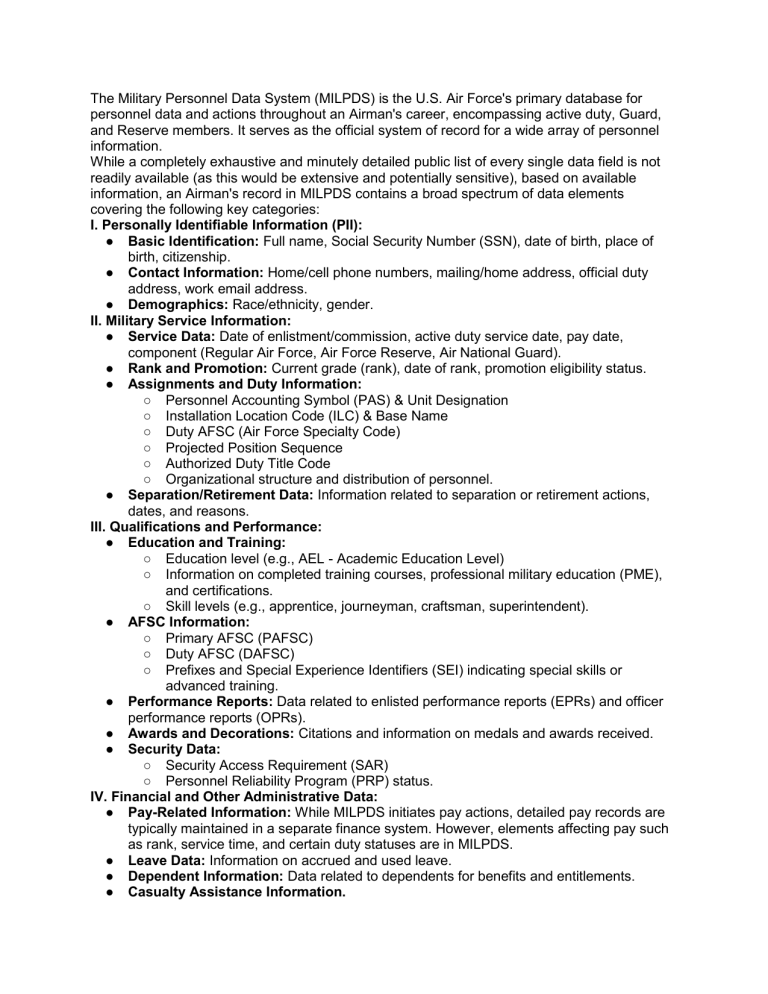 The Military Personnel Data System (MILPDS) is the U.S. Air Force's primary database for personnel data and actions throughout an Airman's career, encompassing active duty, Guard, and Reserve members. It serves as the official system of record for a wide array of personnel information. While a completely exhaustive and minutely detailed public list of every single data field is not readily available (as this would be extensive and potentially sensitive), based on available information, an Airman's record in MILPDS contains a broad spectrum of data elements covering the following key categories: I. Personally Identifiable Information (PII): ● Basic Identification: Full name, Social Security Number (SSN), date of birth, place of birth, citizenship. ● Contact Information: Home/cell phone numbers, mailing/home address, official duty address, work email address. ● Demographics: Race/ethnicity, gender. II. Military Service Information: ● Service Data: Date of enlistment/commission, active duty service date, pay date, component (Regular Air Force, Air Force Reserve, Air National Guard). ● Rank and Promotion: Current grade (rank), date of rank, promotion eligibility status. ● Assignments and Duty Information: ○ Personnel Accounting Symbol (PAS) & Unit Designation ○ Installation Location Code (ILC) & Base Name ○ Duty AFSC (Air Force Specialty Code) ○ Projected Position Sequence ○ Authorized Duty Title Code ○ Organizational structure and distribution of personnel. ● Separation/Retirement Data: Information related to separation or retirement actions, dates, and reasons. III. Qualifications and Performance: ● Education and Training: ○ Education level (e.g., AEL - Academic Education Level) ○ Information on completed training courses, professional military education (PME), and certifications. ○ Skill levels (e.g., apprentice, journeyman, craftsman, superintendent). ● AFSC Information: ○ Primary AFSC (PAFSC) ○ Duty AFSC (DAFSC) ○ Prefixes and Special Experience Identifiers (SEI) indicating special skills or advanced training. ● Performance Reports: Data related to enlisted performance reports (EPRs) and officer performance reports (OPRs). ● Awards and Decorations: Citations and information on medals and awards received. ● Security Data: ○ Security Access Requirement (SAR) ○ Personnel Reliability Program (PRP) status. IV. Financial and Other Administrative Data: ● Pay-Related Information: While MILPDS initiates pay actions, detailed pay records are typically maintained in a separate finance system. However, elements affecting pay such as rank, service time, and certain duty statuses are in MILPDS. ● Leave Data: Information on accrued and used leave. ● Dependent Information: Data related to dependents for benefits and entitlements. ● Casualty Assistance Information. ● Mobilization/Activation Data (for Guard and Reserve). Key Functions Supported by MILPDS Data: ● Lifecycle Personnel Management: From recruiting and accessions to separations and retirements. ● Force Management: Tracking manning requirements, organizational structure, and personnel distribution. ● Individual Human Resource Actions: Assignments, evaluations, skill classifications, and promotions. ● Pay and Entitlements Initiation: Triggering necessary pay actions. ● Accountability and Strength Reporting. ● Interface with other Air Force and DoD Systems: Providing data to systems like those for pay, education, training, and assignments (e.g., Assignment Management System AMS). It's important to note that: ● MILPDS is a dynamic system and may undergo upgrades and changes to its data structure over time. ● Access to specific data elements within MILPDS is role-based and restricted to authorized personnel. ● Airmen can typically view portions of their personnel records through applications like the virtual Military Personnel Flight (vMPF). The information in MILPDS is crucial for the career management of Airmen and the overall human resources functions of the Air Force.