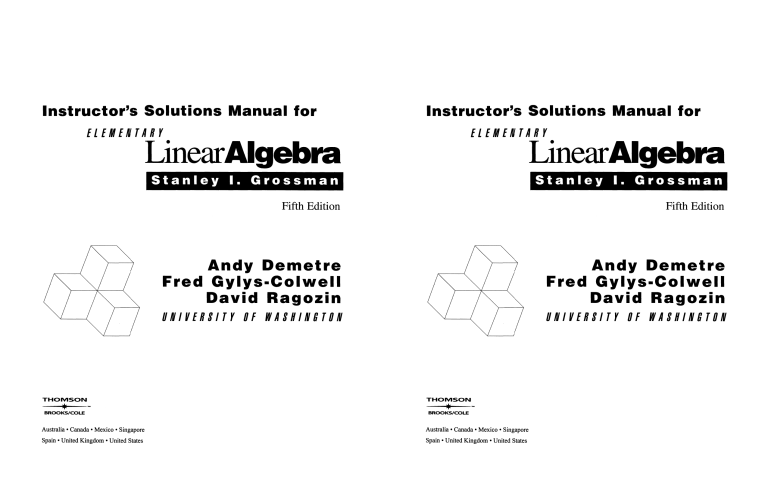 COPYRIGHT 1994 Brooks/Cole, a division of Thomson Learning, Inc. Thomson Learning is a trademark used herein under license. COPYRIGHT 1994 Brooks/Cole, a division of Thomson Learning, Inc. Thomson Learning is a trademark used herein under license. ALL RIGHTS RESERVED. No part of this work covered by the copyright hereon may be reproduced or used in any form or by any means — graphic, electronic, or mechanical, including photocopying, recording, taping, Web distribution, or information storage or retrieval systems — without the written permission of the publisher. ALL RIGHTS RESERVED. No part of this work covered by the copyright hereon may be reproduced or used in any form or by any means — graphic, electronic, or mechanical, including photocopying, recording, taping, Web distribution, or information storage or retrieval systems — without the written permission of the publisher. MATLAB® is a registered trademark of The MathWorks, Inc. MATLAB® is a registered trademark of The MathWorks, Inc. Brooks/Cole — Thomson Learning 10 Davis Drive Belmont CA 94002-3098 USA Brooks/Cole — Thomson Learning 10 Davis Drive Belmont CA 94002-3098 USA For information about our products, contact us: Thomson Learning Academic Resource Center 1-800-423-0563 http://www.wadsworth.com For information about our products, contact us: Thomson Learning Academic Resource Center 1-800-423-0563 http://www.wadsworth.com For permission to use material from this text, contact us by Web: http://www.thomsonrights.com Fax: 1-800-730-2215 Phone: 1-800-730-2214 For permission to use material from this text, contact us by Web: http://www.thomsonrights.com Fax: 1-800-730-2215 Phone: 1-800-730-2214 Ragozin: Instructor’s Solutions Manual to accompany Elementary Linear Algebra, 5e, by Grossman Ragozin: Instructor’s Solutions Manual to accompany Elementary Linear Algebra, 5e, by Grossman ISBN 0-03-097355-4 ISBN 0-03-097355-4 Printed in the United States of America Printed in the United States of America 10 9 8 7 6 5 4 3 2 1 10 9 8 7 6 5 4 3 2 1