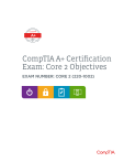 CompTIA A+ Certification Exam: Core 2 Objectives EXAM NUMBER: CORE 2 (220-1002) About the Exam Candidates are encouraged to use this document to help prepare for CompTIA A+ Core 2. In order to receive the CompTIA A+ certification, you must pass two exams: Core 1 (2201001) and Core 2 (220-1002). CompTIA A+ Core 2 measures the necessary skills for an entrylevel IT professional. Successful candidates will have the knowledge required to: • Assemble components based on customer requirements • Install, configure, and maintain PCs, mobile devices, and software for end users • Understand the basics of networking and security forensics • Properly and safely diagnose, resolve, and document common hardware and software issues • Apply troubleshooting skills • Provide appropriate customer support • Understand the basics of scripting, virtualization, desktop imaging, and deployment These content examples are meant to clarify the test objectives and should not be construed as a comprehensive listing of all the content of this examination. EXAM ACCREDITATION CompTIA A+ is accredited by ANSI to show compliance with the ISO 17024 Standard and, as such, undergoes regular reviews and updates to the exam objectives. EXAM DEVELOPMENT CompTIA exams result from subject matter expert workshops and industry-wide survey results regarding the skills and knowledge required of an entry-level IT professional. CompTIA AUTHORIZED MATERIALS USE POLICY CompTIA Certifications, LLC is not affiliated with and does not authorize, endorse or condone utilizing any content provided by unauthorized third-party training sites (aka “brain dumps”). Individuals who utilize such materials in preparation for any CompTIA examination will have their certifications revoked and be suspended from future testing in accordance with the CompTIA Candidate Agreement. In an effort to more clearly communicate CompTIA’s exam policies on use of unauthorized study materials, CompTIA directs all certification candidates to the CompTIA Certification Exam Policies. Please review all CompTIA policies before beginning the study process for any CompTIA exam. Candidates will be required to abide by the CompTIA Candidate Agreement. If a candidate has a question as to whether study materials are considered unauthorized (aka “brain dumps”), he/she should contact CompTIA at examsecurity@comptia.org to confirm. PLEASE NOTE The lists of examples provided in bulleted format are not exhaustive lists. Other examples of technologies, processes, or tasks pertaining to each objective may also be included on the exam although not listed or covered in this objectives document. CompTIA is constantly reviewing the content of our exams and updating test questions to be sure our exams are current and the security of the questions is protected. When necessary, we will publish updated exams based on testing exam objectives. Please know that all related exam preparation materials will still be valid. CompTIA A+ Certification Exam: Core 2 Objectives Version 2.0 (Exam Number: Core 2) TEST DETAILS Required exam Core 2 Number of questions Maximum of 90 Types of questions Multiple choice and performance-based Length of test 90 minutes Recommended experience 12 months of experience as an IT support specialist Passing score 700 (on a scale of 100–900) EXAM OBJECTIVES (DOMAINS) The table below lists the domains measured by this examination and the extent to which they are represented: DOMAIN PERCENTAGE OF EXAMINATION 1.0 Operating Systems 2.0 Security 3.0 Software Troubleshooting 4.0 Operational Procedures Total 27% 24% 26% 23% 100% CompTIA A+ Certification Exam: Core 2 Objectives Version 2.0 (Exam Number: Core 2) 1.0 Operating Systems 1.1 Compare and contrast common operating system types and their purposes. • 32-bit vs. 64-bit - RAM limitations - Software compatibility • Workstation operating systems - Microsoft Windows - Apple Macintosh OS - Linux 1.2 • Compatibility concerns between operating systems Compare and contrast features of Microsoft Windows versions. • Windows 7 • Windows 8 • Windows 8.1 • Windows 10 1.3 • Cell phone/tablet operating systems - Microsoft Windows - Android - iOS - Chrome OS • Vendor-specific limitations - End-of-life - Update limitations • Corporate vs. personal needs - Domain access - Bitlocker - Media center - Branchcache - EFS • Desktop styles/user interface Summarize general OS installation considerations and upgrade methods. • Boot methods - USB - CD-ROM - DVD - PXE - Solid state/flash drives - Netboot - External/hot-swappable drive - Internal hard drive (partition) • Type of installations - Unattended installation - In-place upgrade - Clean install - Repair installation - Multiboot - Remote network installation - Image deployment - Recovery partition - Refresh/restore • Partitioning - Dynamic - Basic - Primary - Extended - Logical - GPT • File system types/formatting - ExFAT - FAT32 - NTFS - CDFS - NFS CompTIA A+ Certification Exam: Core 2 Objectives Version 2.0 (Exam Number: Core 2) - ext3, ext4 - HFS - Swap partition - Quick format vs. full format • Load alternate third-party drivers when necessary • Workgroup vs. Domain setup • Time/date/region/language settings • Driver installation, software, and Windows updates • Factory recovery partition • Properly formatted boot drive with the correct partitions/format • Prerequisites/hardware compatibility • Application compatibility • OS compatibility/upgrade path 1.0 Operating Systems 1.4 Given a scenario, use appropriate Microsoft command line tools. • Navigation - dir - cd - .. • ipconfig • ping • tracert • netstat • nslookup 1.5 • copy • xcopy • robocopy • net use • net user • [command name] /? • Commands available with standard privileges vs. administrative privileges Given a scenario, use Microsoft operating system features and tools. • Administrative - Computer Management - Device Manager - Local Use