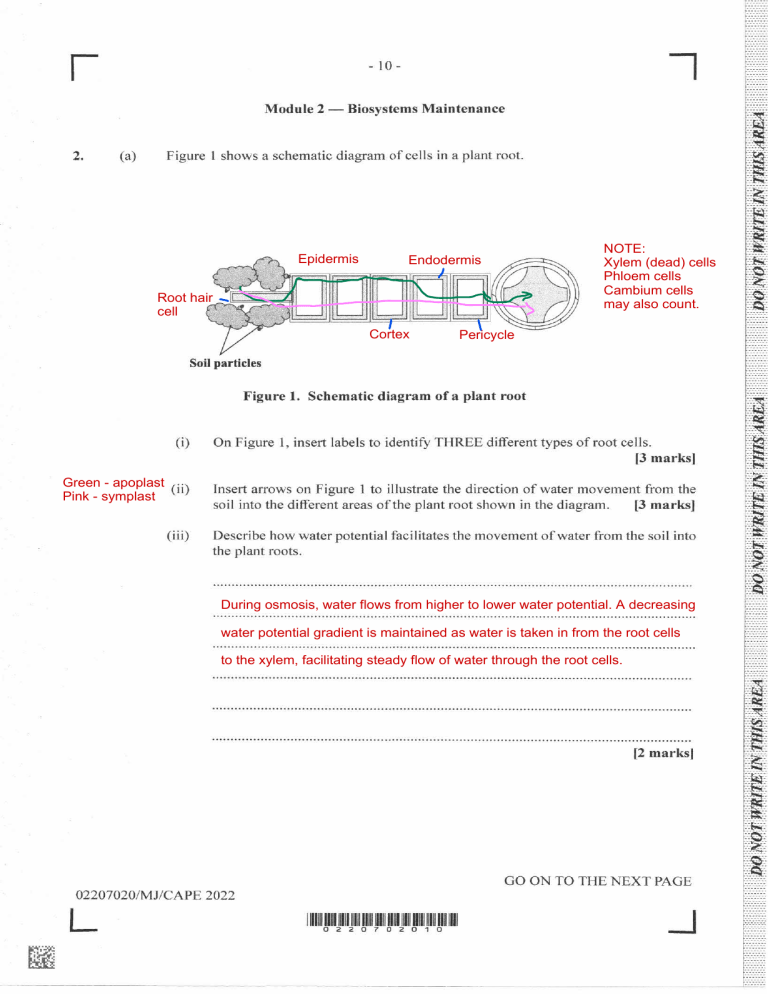 Epidermis Endodermis Root hair cell Cortex NOTE: Xylem (dead) cells Phloem cells Cambium cells may also count. Pericycle Green - apoplast Pink - symplast During osmosis, water flows from higher to lower water potential. A decreasing water potential gradient is maintained as water is taken in from the root cells to the xylem, facilitating steady flow of water through the root cells. At 100% light intensity, there was a decrease from 5.5 to approx. 3.8 in transpiration rate -- a difference of 1.7. At 25% light intensity, there was a decrease from approx. 3.9 to approx. 3.8 in transpiration rate -- a difference of only 0.1. It can be seen that in both these light intensities, transpiration rates appear to be similar at 75 days after installation. Transpiration rates are higher during a sunny day to the higher light intensity and temperature. Guard cells become turgid and allow stomata to return open to facilitate gaseous exchange as well as transpirational pull, which assists with temperature regulation (cooling). At night-time, the guard cells become flaccid and the stomata close, greatly reducing the intake of carbon dioxide due to a pause in photosynthesis. As a result, transpiration rates are very low. A source is a photosynthetic organ capable of producing sugars in excess, for transport. Sucrose is unloaded from sources into the phloem (e.g. leaves). A sink is a non-photosynthetic organ that does not produce sugars but needs them to meet their own requirements. Sucrose is loaded into sinks from the phloem. (e.g. roots) Solutes are loaded into the phloem by active transport, thus ATP is needed to transport the solutes against a conentration gradient. Using ATP, H+ ions are pumped out of companion cells to adjacent cells. As H+ ions move back into the companion cell via transport proteins, sucrose moves in with them through a protein co-transporter. Pressure changes in the phloem results in mass flow of solutes along the phloem. 1. Solute is loaded into the phloem via active transport. This allows sucrose to be pumped into the sieve tube, thus decreasing water potential there. 2. As a result, osmosis occurs, causing water to flow from the xylem to the phloem. 3. This creates hydrostatic pressure that pushes the solute through the sieve tube due to mass flow. 4. As the solute reaches the sink (roots), the sucrose is unloaded from the phloem. This increases water potential. 5. Water is absorbed from the soil into the xylem. 6. The increased water potential in the phloem allows water to flow into the base of the xylem via osmosis. 7. Transpirational pull, capillarity and root pressure all contribute to the movement of water up the narrow xylem tubes. The adhesive and cohesive forces of water also assists. It should be noted, however, that this mass flow theory only accounts for unidirectional movement of solute in the phloem. (12 marks) 2. (a) Figure 2A shows a cross-section of phloem tissue and Figure 2B shows a longitudinal section of phloem tissue. Figure 2A. Cross-section of phloem tissue (i) Figure 2B. Longitudinal section of phloem tissue In the space below, draw and label a diagram of the TWO phloem cell types shown in Figure 2B. 02207020/CAPE 2018 [3 marks] GO ON TO THE NEXT PAGE ‘‘*’’Barcode Area”*” Sequential Bar Code DO NOT WRITE IN THIS AREA DO NOT WRITE IN THIS AREA DO NOT WRITE IN THIS AREA -8- DO NOT WRITE IN THIS AREA DO NOT WRITE IN THIS AREA DO NOT WRITE IN THIS AREA -9 (ii) Describe TWO features of EACH phloem cell type shown in Figure 2B. ................................................................................................................................. Sieve element - Lacks a nucleus and mitochondria. Are book-ended by ................................................................................................................................. sieve plates. Elongated shape. Large empty lumen for sucrose transport. ................................................................................................................................. Companion cell - Contains prominent nuclei and many mitochondria to provide for the ................................................................................................................................. metabolic needs of sieve tube elements. Attached to side of sieve element. ................................................................................................................................. Dense cytoplasm. ................................................................................................................................. ................................................................................................................................. ................................................................................................................................. ................................................................................................................................. ................................................................................................................................. ................................................................................................................................. ................................................................................................................................. [2 marks] (iii) State the major function of EACH of the TWO phloem cell types. ................................................................................................................................. Sieve element - Transport of sucrose from source to sink (e.g. leaves to roots) ................................................................................................................................. Transport of other assimilates and amino acids around the plant (bidirectional). ...........................................................................................