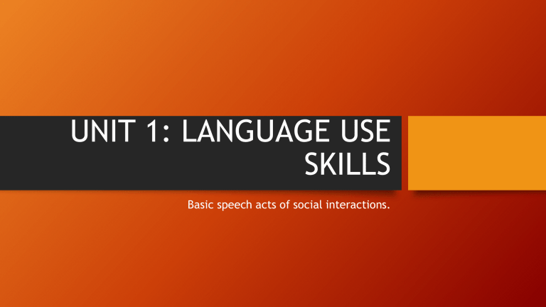 UNIT 1: LANGUAGE USE SKILLS Basic speech acts of social interactions. Introduction • Initially speech and communication was thought to be made up of sentence that either make a statement or a command. • This means that language was meant to either: 1) Describe events as they occur. 2) Declare statements whether they are true or false. 3) Make a command. JL Austin – Speech act theory Austin argues that language serves a greater purpose than this. 1) Not all sentences are statements 2) Much of conversation is made up of questions, exclamations , commands and expressions of wishes. e.g: I promise to call you tomorrow. Is this a statement of fact? Is a command? Does it describe an event? Think about the following… Can the sentences below be categorized as statements/command/description: 1. I bet you R100 that Manchester City will win the league. 2. I am warning you that she will be very angry. 3. I declare that this meeting is officially open. Each of these sentences, are in themselves, some sort of action. We call these performative utterances. Speech acts of social interaction • This refers to the theory that analyses the way speech relates to the behavior of the speaker and the listener in communication. • It is concerned with the action context of linguistic utterances. • According to this theory, we perform actions by uttering words, meaning that speech is a communicative activity. • It refers to the active ways in which people use language to interact with each other. Class activity Complete question 1-5 on page 47 of the student guide. Categories of speech acts 1) Directive 2) Commissive 3) Expressive 4) Declarative 5) Representatives 1. Directives speech acts The speaker tries to get the listener to do something. This can be done through: • Commanding • Forbidding • Asking • Requesting • Inviting • Begging E.g: Please close the door. 2. Commissive speech acts The speaker commits themselves to a future course of action. This can include: • Promising • Planning • Vowing • Betting • Offering E.g: I will never speak to you again. 3. Expressive speech acts The speakers expresses their feelings or emotional reactions. This can include: • Apologizing • Sympathizing • Regretting • Welcoming • Thanking • E.g: I am so sorry for your loss. I can imagine what you must going through. 4. Declarative speech acts The speakers’ words bring about a change in the external situation or reality. This includes: • Bidding • Resigning • Baptizing • Firing E.g: “As of today, the country will be on level 5 lockdown regulation..” – President Cyril Ramaphosa 5. Representative Speech acts. The speaker conveys their belief on the truth of the situation. This can include: • Asserting • Claiming • Insisting • Predicting E.g: No one plays better football then Leo Messi. Felicity conditions This is the criteria that has to met for a speech act to be successful. This is because part of the meaning of the speech is its intended social function. These conditions are: 1) The right context: the background context has to allow for the speech to take place. 2) The right person: Only the person who is suited or qualified can perform the speech act for it to make sense. 3) The right time: The time has to be appropriate for the speech act to be performed. Class activity Read chapter 4 of the novel born a crime. 1) Identify the different speech act found in the chapter. 2) Analyze the felicity condition of the speech act.