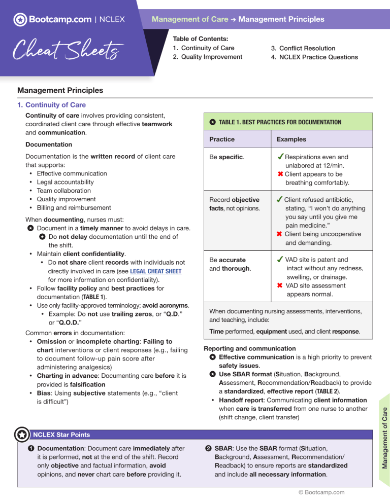 Table of Contents: 1. Continuity of Care 2. Quality Improvement 3. Conflict Resolution 4. NCLEX Practice Questions Management Principles 1. Continuity of Care Documentation Documentation is the written record of client care that supports: y Effective communication y Legal accountability y Team collaboration y Quality improvement y Billing and reimbursement When documenting, nurses must: Document in a timely manner to avoid delays in care. Do not delay documentation until the end of the shift. y Maintain client confidentiality. y Do not share client records with individuals not directly involved in care (see LEGAL CHEAT SHEET for more information on confidentiality). y Follow facility policy and best practices for documentation (TABLE 1). y Use only facility-approved terminology; avoid acronyms. y Example: Do not use trailing zeros, or “Q.D.” or “Q.O.D.” Common errors in documentation: y Omission or incomplete charting: Failing to chart interventions or client responses (e.g., failing to document follow-up pain score after administering analgesics) y Charting in advance: Documenting care before it is provided is falsification y Bias: Using subjective statements (e.g., “client is difficult”) Documentation: Document care immediately after it is performed, not at the end of the shift. Record only objective and factual information, avoid opinions, and never chart care before providing it. TABLE 1. BEST PRACTICES FOR DOCUMENTATION Practice Examples Be specific. Respirations even and unlabored at 12/min. Client appears to be breathing comfortably. Record objective facts, not opinions. Client refused antibiotic, stating, “I won’t do anything you say until you give me pain medicine.” Client being uncooperative and demanding. Be accurate and thorough. VAD site is patent and intact without any redness, swelling, or drainage. VAD site assessment appears normal. When documenting nursing assessments, interventions, and teaching, include: Time performed, equipment used, and client response. Reporting and communication Effective communication is a high priority to prevent safety issues. Use SBAR format (Situation, Background, Assessment, Recommendation/Readback) to provide a standardized, effective report (TABLE 2). y Handoff report: Communicating client information when care is transferred from one nurse to another (shift change, client transfer) SBAR: Use the SBAR format (Situation, Background, Assessment, Recommendation/ Readback) to ensure reports are standardized and include all necessary information. © Bootcamp.com 5 Management of Care Continuity of care involves providing consistent, coordinated client care through effective teamwork and communication. 1. Continuity of Care, Continued TABLE 2. SBAR REPORT Step Example Situation: Reason for calling, caller’s name and title, and client name/identifier “This is Nurse Adams calling because Mr. Smith has dyspnea.” Background: Pertinent history (diagnosis, medications) “The client has asthma and is on oxygen at 2 L/min via nasal cannula.” Assessment: Current VS and status “He has dyspnea and wheezing with an oxygen saturation of 88%.” Recommendation/ Readback: Recommended actions and readback of important information “I recommend immediate evaluation by the HCP and an order for an albuterol nebulizer.” Interprofessional collaboration: y Nurses must collaborate with the interdisciplinary team to meet the client’s holistic needs. y Assess the need for referrals to other disciplines (TABLE 3). Discharge planning and education: y Discharge planning and education begins upon admission. y Case managers support discharge needs and monitor expected client progress (critical pathways). TABLE 3. HEALTHCARE TEAM MEMBERS Role Examples of Referral Needs Pharmacist: Manages medication regimens and drug interactions y Assists with adjusting medications or doses based on client allergies or condition (renal failure) y Determines medication interactions Physical therapist/ physiotherapist: Assists with gross mobility (“legs”) and physical exercise y Performs strengthening exercises y Teaches clients to use mobility devices (walker) y Provides prosthetic training after amputation Occupational therapist: Assists with ADLs and with using adaptive equipment focused on fine motor skills (“hands”) y Recommends adaptive equipment for dressing (button hooks) and eating y Assists with improving hand coordination for writing Registered dietitian: Manages nutritional needs and dietary plans y Adjusts diets based on diagnoses (e.g., low sodium for hypertension) y Provides education and support for tube feedings Respiratory therapist: Provides pulmonary hygiene and respiratory interventions y Administers nebulizer treatments y Adjusts mechanical ventilator and oxygen settings Social worker: Addresses psychosocial needs and access to resources y Connects clients to support groups y Seeks out financial resources for clients unable to afford medication or equipment Management of Care y When completing a handoff report: y Conduct at the bedside if possible. Emphasize priorities of care (allergies, changes in condition, critical lab results). y Avoid unnecessary details. y Allow the receiving nurse to ask questions. y Document the date, time, and individuals involved in the handoff report. Referrals: Case managers coordinate discharge planning and evaluate client progress. Physical therapists focus on gross mobility and exercises (“legs”), while occupational therapists assist with adaptive tools and fine motor skills (“hands”). © Bootcamp.com 2 TABLE 3. HEALTHCARE TEAM MEMBERS, CONTINUED Role Examples of Referral Needs Case manager: Coordinates treatment, services, and discharge planning throughout care y Evaluates client progress compared to expected progress (critical pathways) y Coordinates discharge plans for clients (home health consult) Speech-language pathologist: Assists with speech, language, and swallowing disorders y Pro