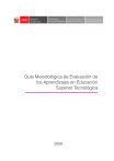 Guía Metodológica de Evaluación de los Aprendizajes en Educación Superior Tecnológica Guía Metodológica de Evaluación de los Aprendizajes en Educación Superior Tecnológica 1 MINISTERIO DE EDUCACIÓN MINISTRO DE EDUCACIÓN JOSÉ ANTONIO CHANG ESCOBEDO VICEMINISTRO DE GESTIÓN PEDAGÓGICA IDEL ALFONSO VEXLER TALLEDO VICEMINISTRO DE GESTIÓN INSTITUCIONAL VÍCTOR RAÚL DÍAZ CHÁVEZ SECRETARIO GENERAL ASABEDO FERNÁNDEZ CARRETERO DIRECTOR GENERAL DE EDUCACIÓN SUPERIOR Y TÉCNICO-PROFESIONAL MANUEL ALEJANDRO SOLÍS GÓMEZ Guía Metodológica de Evaluación de los Aprendizajes en Educación Superior Tecnológica DIRECTOR DE EDUCACIÓN SUPERIOR TECNOLÓGICA Y TÉCNICO-PRODUCTIVA FRANCISCO ARMANDO QUISPE FREYRE 2 EQUIPO TÉCNICO DEL ÁREA DE EDUCACIÓN SUPERIOR TECNOLÓGICA JULIO EUFEMIO CRUZ ESCALANTE (Coordinador) BILLIE FRANCISCA DEL PINO RIVAS DIKXON ANGEL LUQUE TICONA ENRIQUE CLARO SALINAS PINTO JOEL MARTÍN VISURRAGA AGÜERO Primera edición Abril del 2009 Tiraje: 1000 ejemplares Calle del Comercio, primera cuadra s/n - San Borja (Espalda del Museo de la Nación) Teléfono: (051) 01-615 5800/anexo 1218 Dirección Electrónica: http://destp.minedu.gob.pe Hecho el Depósito Legal en la Biblioteca Nacional del Perú N. 2009-05739 Impreso en: IMPRESOS Y SISTEMAS, (Av. Ignacio Merino 2585-Lima 14) “Si sabes poco, aprende. Si sabes mucho, enseña”. Compartir nuestros conocimientos es el principio de la solidaridad. Aprender más, buscar uno mismo más conocimientos. Conversar y discutir sobre lo aprendido. Esos son esfuerzos que te harán mejor, te darán seguridad y confianza. Y permitirán tu éxito en la vida. Recuerda que en cada niño hay un genio por descubrir. No dejes que el tuyo permanezca dormido. Es tu deber y tu victoria. Alan García Pérez Presidente de la República del Perú Guía Metodológica de Evaluación de los Aprendizajes en Educación Superior Tecnológica Con afecto, 3 4 Guía Metodológica de Evaluación de los Aprendizajes en Educación Superior Tecnológica Indice PRESENTACIÓN 7 1. MARCO TEÓRICO 1.1 Bases para la conceptualización de la evaluación 8 1.2 Concepto de evaluación 15 1.3 Objetos de la evaluación 17 1.4 Características de la evaluación 18 1.5 Funciones de la evaluación 19 1.6 Clasificación de la evaluación 21 1.7 La metacognición y su relación con el proceso de evaluación 24 1.8 La naturaleza de la evaluación como “empowerment” 25 1.9 Etapas de la evaluación 27 1.10 La dimensión ética de la evaluación 28 2. TÉCNICAS E INTRUMENTOS DE EVALUACIÓN 30 2.1 Conceptos de técnicas e instrumentos de evaluación 30 2.2 Descripción de las técnicas de evaluación 31 2.3 Condiciones de los instrumentos de evaluación 35 a) Condiciones prácticas 35 b) Condiciones técnicas 35 2.4 Tipos de instrumentos de evaluación 36 a) Instrumentos para evaluar conocimientos 36 b) Instrumentos para evaluar habilidades y destrezas 37 c) Instrumentos para evaluar actitudes 43 Escalas de calificación 52 3. DOCUMENTOS ADMINISTRATIVOS PARA GESTIÓN DE LA EVALUACIÓN 53 4. INFORMES 55 2.5 4.1 Informe técnico pedagógico 55 4.2 Informe de seguimiento 55 4.3 Boleta académica 55 5. PAUTAS SUGERIDAS PARA LA EVALUACIÓN DE LOS APRENDIZAJES 57 6. ANEXOS 64 6.1 Instrumentos de interrogatorio 64 6.2 Instrumentos de resolución de problemas 66 6.3 Instrumentos de solicitud de problemas 70 6.4 Instrumentos de observación 73 7. BIBLIOGRAFÍA 79 Guía Metodológica de Evaluación de los Aprendizajes en Educación Superior Tecnológica 8 5 6 Guía Metodológica de Evaluación de los Aprendizajes en Educación Superior Tecnológica Presentación En las últimas décadas el concepto de evaluación ha sufrido una transformación significativa en el ámbito de la enseñanza y aprendizaje. Al observar nuestro entorno, nos damos cuenta que las innovaciones se han dado más en el ámbito de las estrategias de aprendizaje y recursos didácticos, pero muy poco en el ámbito de la evaluación. Así notamos que, en las instituciones educativas, aplican estrategias de aprendizaje muy innovadoras acompañadas de sistemas de evaluación tradicionales. Llama la atención la distancia que existe entre la realidad de las prácticas evaluativas y los avances teóricos y metodológicos que hoy nos presenta la literatura de la evaluación. Nos damos cuenta que la evaluación implica además de un cambio teórico, un cambio de actitud. En la actualidad se valora el aprendizaje del alumno en el proceso y en el producto. La incidencia de estos dos aspectos en el sistema educativo formal queda claramente reflejado por las diversas normas existentes al respecto, por su influencia en la planificación del trabajo docente, en la actividad en el espacio educativo y en la actividad reflexiva posterior. En esta realidad también están presentes entidades externas a las instituciones educativas. Los organismos internacionales, así como los órganos de evaluación educativa que corresponden al Estado, realizan evaluaciones para detectar los niveles de aprendizaje de los alumnos y brindar información a los responsables de la educación, al profesorado y a la sociedad civil. En el presente documento los contenidos que desarrollamos giran en torno a la evaluación de los aprendizajes, razón por la cual iniciamos precisando un marco conceptual, que clarifique el concepto de la evaluación del aprendizaje, así como sus características, funciones, clasificación y etapas, determinando, además, cuándo se puede evaluar y quién realiza esta tarea. Finalmente, abordaremos las técnicas y los instrumentos que pueden utilizarse para evaluar el aprendizaje de los alumnos. Presentamos los aspectos teóricos y técnicos que le permitan la elaboración de instrumentos de evaluación, así como algunos ejemplos del proceso que puedan ilustrar al docente. Esperamos que los contenidos presentados en este documento complementen y amplíen sus saberes sobre el tema. Ahora, le invitamos a realizar un