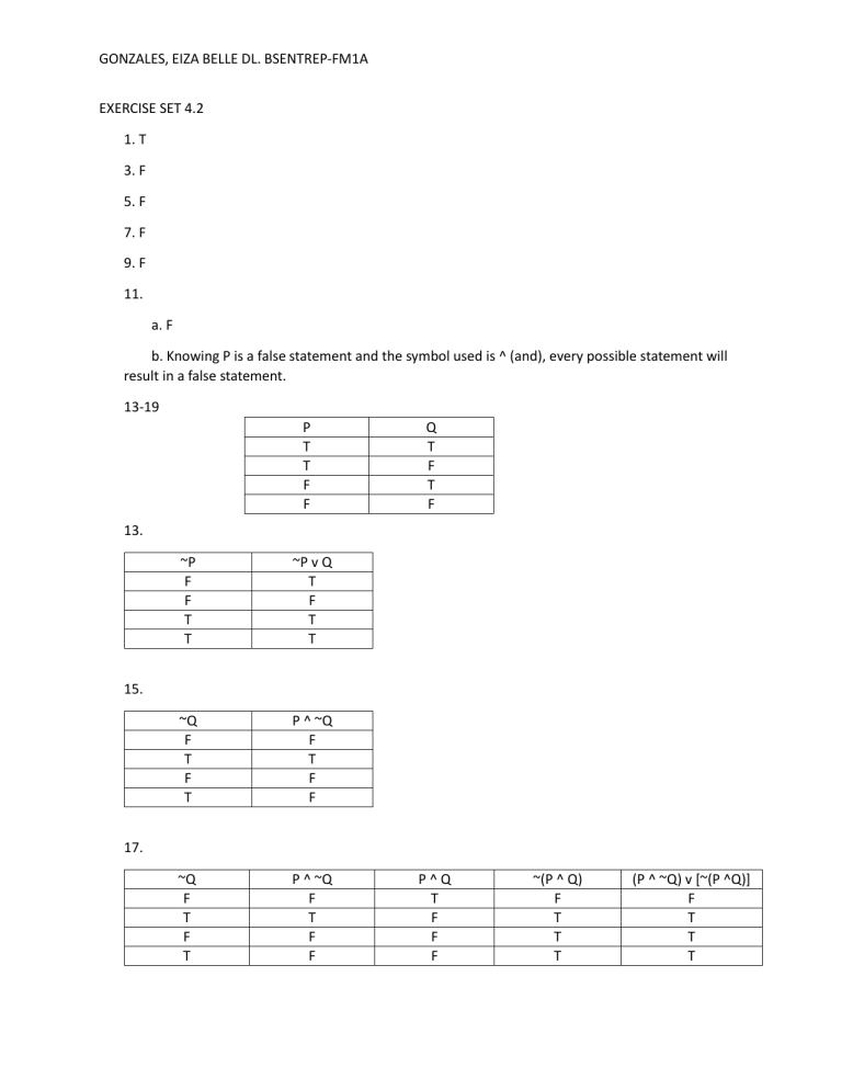 GONZALES, EIZA BELLE DL. BSENTREP-FM1A EXERCISE SET 4.2 1. T 3. F 5. F 7. F 9. F 11. a. F b. Knowing P is a false statement and the symbol used is ^ (and), every possible statement will result in a false statement. 13-19 P T T F F Q T F T F 13. ~P F F T T ~P v Q T F T T ~Q F T F T P ^ ~Q F T F F ~Q F T F T P ^ ~Q F T F F 15. 17. P^Q T F F F ~(P ^ Q) F T T T (P ^ ~Q) v [~(P ^Q)] F T T T GONZALES, EIZA BELLE DL. BSENTREP-FM1A 19. P Q R ~R PvQ ~(P v Q) ~R v Q ~(P v Q) ^ (~R v Q) T T T F T F T F T F T F T F F F T T F T T F T F T F F T T F T F F T T F T F T F F F F T F T T T F T F T FFF T T T F F T F T F F F
