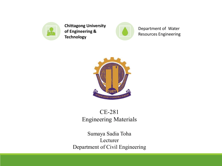Chittagong University of Engineering & Technology Department of Water Resources Engineering CE-281 Engineering Materials Sumaya Sadia Toha Lecturer Department of Civil Engineering Textbook Syllabus Definition A Brick is an artificial kind of stone made of clay whose chief characteristics are plasticity when wet & stone like hardness after being heated to high temperature. BRICKS It is a regular sized rectangular unit Used for most of the building works Used as substitute for stone, where stone is not available Uses of Bricks Construction of walls of any size Construction of floors Construction of arches & cornices Making khoa (broken bricks of required size) to use as an aggregate in concrete Manufacture of surki (powdered bricks) to be used in lime plaster & lime concrete. Ingredients of Good Brick Earth A good brick earth mainly consists of Silica (Sand) and Alumina (Clay) Ingredients of Good Brick Earth • Alumina (Clay)(Aluminum Oxide) • Silica (Sand) • Lime • Iron Oxide • Magnesia(Magnesium Oxide) • Alkalies & Organic Matter Ingredients of Good Brick Earth The ingredients are mixed in such a proportion that The resulting mass with water is a plastic mass Can be easily moulded and dried without undergoing shrinkage, cracking or warping Ingredients of Good Brick Earth Silica (Sand) Good brick earth should contain 50 to 60 % Silica Presence of silica prevents cracking, shrinking and warping of raw bricks Excess amount of silica destroys the cohesion between particles and makes the bricks brittle and weak Hence, durability of the bricks depends largely on the proper proportion of silica & alumina in brick earth Ingredients of Good Brick Earth Alumina (Clay) Alumina is the chief constituent of every kind of clay A good brick earth should contain 20 to 30 % of alumina Provides plasticity to earth, so that it can be moulded If bricks contain excess amount of alumina and insufficient sand, they shrink, crack and warp on drying and burning Ingredients of Good Brick Earth Lime Small quantity(1%) of lime in brick earth is desirable Slight amount of lime in a very finely powdered form acts as a flux and causes silica to fuse slightly at kiln temperature Such slightly fused sand acts as a very hard cementing material and bricks of large strength and durability are obtained Lime present in small proportion also prevents shrinkage of raw bricks Excess amount of lime causes the brick to melt and its shape is lost Ingredients of Good Brick Earth Oxide of Iron About 5 to 6 % is desirable in good brick earth It also helps silica to fuse at comparatively low temperature like lime The color of bricks depends on the proportion of iron oxide present in the brick earth The bricks having very small amount of iron oxide are yellow in color Iron also increases the impermeability of the bricks durability and Ingredients of Good Brick Earth Magnesia A small proportion(5%) of it decreases the shrinkage and gives yellow tint to the bricks Excess amount of magnesia causes bricks to decay Ingredients of Good Brick Earth Alkalies & Organic Matter A small quantity of organic matter assist burning the bricks. Small quantity of Alkalies lower the fusion point of clay. Proportion of the Ingredients of Typical Good Brick Earth Ingredients Percentage Alumina 20-30 % Silica 50-60 % Lime & Magnesia 6-10 % Iron Oxide 4-8% Organic Matter 3-6 % Harmful Ingredients of Brick Earth Harmful Ingredients of Brick Earth • Lime • Pebbles of Stone & Gravel • Iron Pyrites • Alkalies • Organic Matter • Presence of Vegetation Harmful Ingredients of Brick Earth Lime Presence of lime in large amount is harmful Calcium Carbonate present in lumps is converted to quick lime (CaO) after burning of bricks When these bricks come into contact with moisture, quick lime slakes and causes disruption of bricks because of its expansion Excess amount of lime also causes the brick to melt, and its shape is lost Harmful Ingredients of Brick Earth Pebbles of Stone and Gravel Do not allow thorough mixing of the earth Bricks containing pebbles and gravels are considered very week Such bricks cannot be broken at the desired section, and they break very irregularly Harmful Ingredients of Brick Earth Iron Pyrites Presence of iron pyrites(FeS2) causes crystallization and disintegration of bricks during burning It causes discoloration of bricks in the form of black slag Harmful Ingredients of Brick Earth Alkalies Mainly salts of sodium and potassium Act as flux in the kiln and cause fusion, warping and twisting of the bricks Alkalies present in bricks absorb moisture from the atmosphere Such bricks when used for masonry work cause deposition of white powder on the surface. Because when drying; the salts, which have come to the surface with moisture, get deposited This action is known as efflorescence, which seriously spoils the appearance of the building Harmful Ingredients of Brick Earth Organic Matter Presence of organic matter and vegetation in the brick earth render the bricks porous Broad Classification of Bricks Classification of Bricks First Class Bricks Second Class Bricks Third Class Bricks Over Burnt or Jhama Bricks Under Burnt or Pilla bricks First & Second Class Bats Jhama Bats First Class Bricks (S-grade,BDS 208:2002) Properties Size of the burnt brick is exactly 9.5”x4.5”x2.75” The brick earth is free from small pebbles, lime lumps, organic matter and sodium salts Well burnt Color is uniform yellow or red Surface is regular and sides are parallel, edges are sharp and at right angles to each other Have firm, compact and uniform texture No sign of efflorescence First Class Bricks (S-grade,BDS 208:2002) Properties Crushing strength more than 280 kg/cm2 (mean value) and 245 kg/cm2 (individual minimum value) Surface is so hard that finger nails are not able to make any impression on its surface Does not absorb water more than 10 % of its own dry weight Metallic ringing sound emits when two bricks are struck against each other