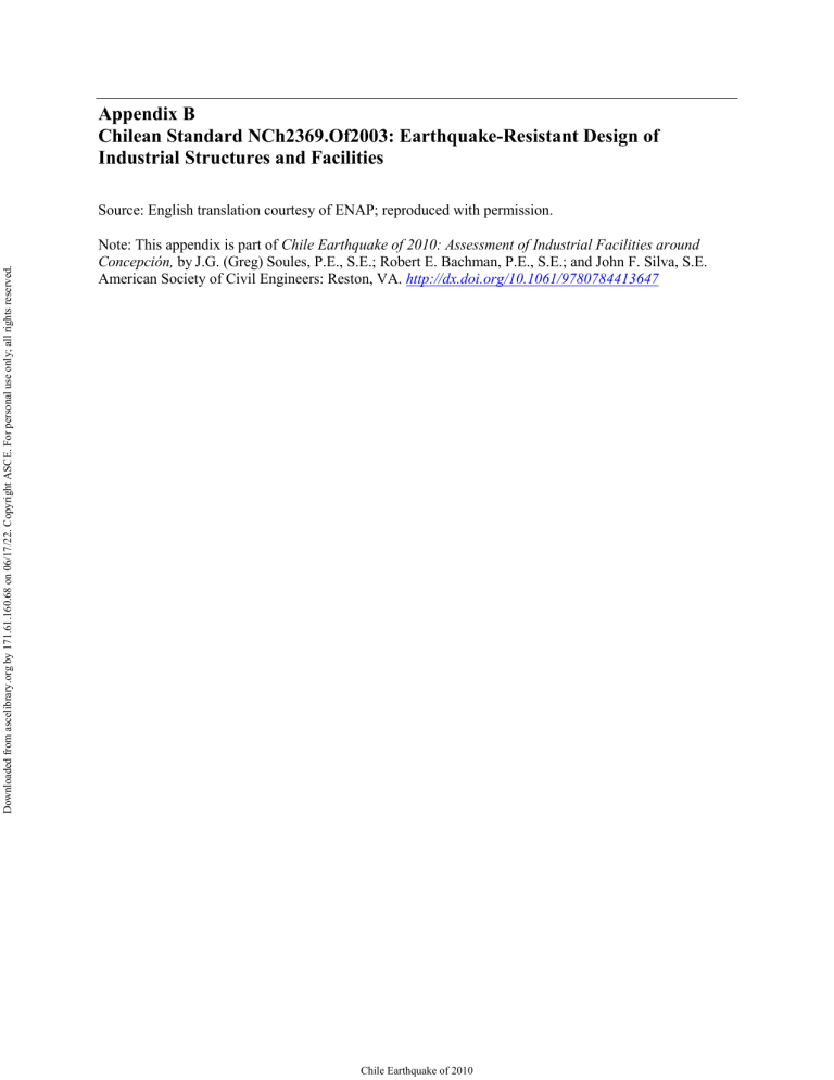 Appendix B Chilean Standard NCh2369.Of2003: Earthquake-Resistant Design of Industrial Structures and Facilities Downloaded from ascelibrary.org by 171.61.160.68 on 06/17/22. Copyright ASCE. For personal use only; all rights reserved. Source: English translation courtesy of ENAP; reproduced with permission. Note: This appendix is part of Chile Earthquake of 2010: Assessment of Industrial Facilities around Concepción, by J.G. (Greg) Soules, P.E., S.E.; Robert E. Bachman, P.E., S.E.; and John F. Silva, S.E. American Society of Civil Engineers: Reston, VA. http://dx.doi.org/10.1061/9780784413647 Chile Earthquake of 2010 NCh2369 OFFICIAL CHILEAN STANDARD NCh2369.Of2003 INSTITUTO NACIONAL DE NORMALIZACION INN - CHILE Downloaded from ascelibrary.org by 171.61.160.68 on 06/17/22. Copyright ASCE. For personal use only; all rights reserved. Earthquake-resistant design of industrial structures and facilities CONTENTS Preface 7 1 Scope and field of application 9 2 References to standards 9 3 Terms, definitions and symbols 12 3.1 Terms and definitions 12 3.2 Symbols 14 4 Provisions of general application 17 4.1 Basic principles and hypotheses 17 4.2 Procedures for specifying the seismic action 19 4.3 Classification of structures and equipment according to their importance 20 4.4 Coordination with other standards 21 4.5 Loading combinations 21 4.6 Project and review of the seismic design 23 4.7 General provision on the application of this standard 23 1 Chile Earthquake of 2010 Downloaded from ascelibrary.org by 171.61.160.68 on 06/17/22. Copyright ASCE. For personal use only; all rights reserved. NCh2369 5 Seismic analysis 23 5.1 General provisions 24 5.2 Methods of analysis 25 5.3 Static elastic analysis 26 5.4 Dynamic elastic analysis 28 5.5 Vertical earthquake action 30 5.6 Robust and rigid equipment resting at ground level 30 5.7 Design by differential horizontal displacements 30 5.8 Special analyses 31 5.9 Structures with seismic isolation or energy dissipators 32 5.10 Other structures not specifically referred to in this standard. 34 6 Seismic deformations 47 6.1 Calculation of deformations 47 6.2 Separation between structures 48 6.3 Maximum seismic deformations 48 6.4 The P-Delta effect 49 7 Secondary elements and equipment mounted on structures 49 7.1 Scope 49 7.2 Forces for seismic design 49 7.3 Forces for anchoring design 52 7.4 Automatic shutoff systems 52 8 Special provisions for steel structures 52 8.1 Applicable standards 52 2 Chile Earthquake of 2010 Downloaded from ascelibrary.org by 171.61.160.68 on 06/17/22. Copyright ASCE. For personal use only; all rights reserved. NCh2369 8.2 Materials 53 8.3 Braced frames 54 8.4 Rigid frames 55 8.5 Connections 56 8.6 Anchorages 57 8.7 Horizontal bracing systems 58 9 Special provisions for concrete structures 63 9.1 Reinforced concrete structures 63 9.2 Precast concrete structures 64 9.3 Industrial bays composed of cantilever columns 67 10 Provisions for foundations 69 10.1 General design provisions 69 10.2 Shallow foundations 69 11 Specific structures 70 11.1 Industrial buildings 70 11.2 Light steel bays 70 11.3 Multi-story industrial buildings 73 11.4 Large suspended equipment 73 11.5 Piping and ducts 73 11.6 Large mobile equipment 73 11.7 Elevated tanks, process vessels and steel stacks 74 11.8 Ground supported vertical tanks 74 11.9 Rotary kilns and dryers 76 3 Chile Earthquake of 2010 Downloaded from ascelibrary.org by 171.61.160.68 on 06/17/22. Copyright ASCE. For personal use only; all rights reserved. NCh2369 11.10 Refractory brick structures 77 11.11 Electric equipment 77 11.12 Minor structures and equipment 77 11.13 Wood structures 77 Appendix A (normative) Typical details 79 Appendix B (normative) Design of beam to column connections in rigid steel frames 89 B.1 General considerations 89 B.2 Design of the panel zone of moment connections 89 B.3 Local bending of the column flange due to a tensile force perpendicular to it 93 B.4 Local web yielding due to compression forces perpendicular to the flange 94 B.5 Web crippling due to the compression force perpendicular to the flange 95 B.6 Compression buckling of web 96 B.7 Additional requirements for continuity stiffeners 97 B.8 Additional requirements for web doubler plates 98 Appendix C (informative) Commentaries 99 C.1 Scope 99 C.2 References 100 C.3 Terminology and symbols 100 C.4 Provisions for general application 100 C.5 Seismic analysis 103 C.6 Seismic deformations 112 C.7 Secondary elements and equipment mounted on structures 112 4 Chile Earthquake of 2010 Downloaded from ascelibrary.org by 171.61.160.68 on 06/17/22. Copyright ASCE. For personal use only; all rights reserved. NCh2369 C.8 Special provisions for steel structures 113 C.9 Special provisions for concrete structures 115 C.10 Foundations 117 C.11 Specific structures 117 C.B Design of beam-column connections in stiff steel frames 126 References 128 Figures Figure 5.1 a) Seismic zonification of Region I, II, and III 44 Figure 5.1 b) Seismic zonification of Regions IV, V, VI, VII, VIII, IX, X and Metropolitan Region 45 Figure 5.1 c) Seismic zonification of Regions XI and XII 46 Figure 5.2 ---- 47 Figure 8.1 Examples of width to thickness ratios of table 8.1 62 Figure 8.2 ----- 63 Figure A.1 Column base 79 Figure A.2 Roof bracing 79 Figure A.3 Detail of crane beam and columns 80 Figure A.4 External wall bracing 80 Figure A.5 Connection of column to masonry wall 81 Figure A.6 Rigid equipment inside of building 81 Figure A.7 Typical details of large suspended equipment, seismic connectors and anchor bolts 82 Figure A.8 Typical details of large mobile equipment 84 Figure A.9 Wheel rail system 84 5 Chile Earthquake of 2010 Downloaded from ascelibrary.org by 171.61.160.68 on 06/17/22. Copyright ASCE. For personal use only; all rights reserved. NCh2369 Figure A.10 Typical details of large tanks 85 Figure A.11 Typical rotary kiln and dryer details 86 Figure A.12 Typical details of industrial brickwork 87 Figure A.13 Typical details of