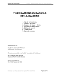 Manual del participante (Escrito por: Ing. Oscar Antonio Silva Sánchez e Ing. Gerardo Silva Sánchez) 7 HERRAMIENTAS BÁSICAS DE LA CALIDAD 1. Hoja de verificaciones. 2. Diagrama de Pareto. 3. Diagrama de Causa – Efecto. 4. Histogramas de frecuencia. 5. Gráficas de control. 6. Estratificación. 7. Mapeo de proceso. Manual escrito por: Ing. Oscar Antonio Silva Sánchez Ing. Gerardo Silva Sánchez Revisado y presentado en el Instituto Tecnológico de Ocotlán por: Ing. J. Refugio López Jaramillo Ing. Jesús Martín Castillo Madrigal Fecha de presentación 21 y 22 de Febrero del 2005 Revisado por: Ing. J. Refugio López Jaramillo e Ing. Jesús Martín Castillo Madrigal Página 1 de 46 Manual del participante (Escrito por: Ing. Oscar Antonio Silva Sánchez e Ing. Gerardo Silva Sánchez) Nota muy importante respecto a todas las gráficas: Todas las gráficas presentadas en este manual se deberán tomar como ejemplos de similitud de los problemas que se están presentando únicamente, ya que posiblemente presenten incongruencias en las escalas o números considerados para la generación de las mismas. 1. HOJA DE VERIFICACIÓN. 1.1 ¿Qué es la hoja de verificación? Es un formato que sirve para registrar, analizar y procesar fácilmente los datos registrados en él. Las condiciones para aplicar eficientemente esta hoja son: 1. Elaborar la hoja de verificación que esté de acuerdo con la finalidad de uso. 2. Debe ser lo más sencilla posible. 3. Los puntos de verificación deben ser estudiados constantemente. 4. Reglamentar el método de verificación. 5. Los puntos de verificación deben coincidir con el orden de la operación. 6. Aclarar la secuencia de datos. 7. Tomar las medidas y contramedidas oportunamente. 8. Debe de estar diseñada de tal manera que se puedan tomar con facilidad las acciones correctivas. 1.2 ¿Cómo usar la hoja de verificación? A grandes rasgos, se pueden clasificar en tres grupos principales: 1. Investigación. 2. Verificación. 3. Registros. 1.2.1 Investigación. Se utilizan para analizar e investigar situaciones de preocupación especiales, permitiendo conocer el tipo de defectos, su distribución, localización y cantidad. 1.2.2 Verificación. Con el fin de controlar los trabajos diarios, se verifican ciertas actividades periódicamente. De ante mano se definen los puntos a revisar y se lleva a cabo la verificación de acuerdo a esta hoja. Revisado por: Ing. J. Refugio López Jaramillo e Ing. Jesús Martín Castillo Madrigal Página 2 de 46 Manual del participante (Escrito por: Ing. Oscar Antonio Silva Sánchez e Ing. Gerardo Silva Sánchez) 1.2.3 Registro. Se toman los datos en forma tabular para la elaboración de los reportes, para tener información que nos permita visualizar la situación global de un proceso y para apreciar sus variaciones a largo plazo. Diferencias y aplicación entre la hoja de verificación y la lista de verificación. HOJA DE VERIFICACIÓN Verificar después que haya concluido la operación. Evaluar la acción y el resultado. Evaluar hasta qué grado se está cumpliendo. LISTA DE VERIFICACIÓN Si se han encontrado puntos de falla durante La operación, en el acto tomar medidas y volver a verificar. Evitar el error en el trabajo. Verificar si se está haciendo o no. Revisado por: Ing. J. Refugio López Jaramillo e Ing. Jesús Martín Castillo Madrigal Página 3 de 46 Manual del participante (Escrito por: Ing. Oscar Antonio Silva Sánchez e Ing. Gerardo Silva Sánchez) 2. DIAGRAMA DE PARETO El diagrama de Pareto está basado en un principio que manejaba el economista italiano Vilfredo Pareto en el siglo pasado, el cual consiste en que el 80% de la población percibe el 20% de los ingresos totales y el 20% restante percibe el 80% de los ingresos. Este principio puede aplicarse también en muchos otros aspectos de nuestra vida cotidiana, por ejemplo: El 20% de los artículos que produce una fábrica le generan el 80% de sus utilidades. Aplicado al problema podemos decir que el 20% de las causas generan el 80% de los problemas. Ninguna empresa o institución en el mundo, por grande y poderosa que ésta sea, tiene los medios suficientes para resolver el 100% de sus problemas, por ello tiene que aplicar sus recursos en forma eficiente para resolver aquellos problemas que sean más importantes o que su solución aporte un beneficio mayor. El diagrama de Pareto es una herramienta muy útil que nos ayudará a la identificación de aquellos problemas que son más graves o cuya solución puede aportar mayor beneficio. 2.1 ¿Qué es el diagrama de Pareto? El diagrama de Pareto es una gráfica de barras que muestra en orden descendente de importancia (magnitud, frecuencia, costo, etc.) una serie de problemas diferentes. Por ejemplo defectos, daños, reclamaciones de clientes (frecuencia, o costo), accidentes, etc. El diagrama de Pareto es muy útil cuando se tiene una gran cantidad de problemas y se necesita jerarquizarlos en orden de importancia. Se utiliza también para analizar si ha habido mejora después de la aplicación de alguna acción correctiva a algún problema. 2.2 ¿Cómo se hace un diagrama de Pareto? La elaboración de un diagrama de Pareto consta de los pasos siguientes 1. Elaborar una lista de los problemas y sus valores en términos de costo, porcentaje, frecuencia o algún otro tipo de valor. 2. Determinar la fecha en la que se elaborará otro diagrama de Pareto para evaluar la mejora. 3. Elaborar una tabla que contenga las columnas siguientes: 1. Problemas, en orden descendente de acuerdo con su valor. 2. Valores: costo, porcentaje, frecuencia, etc. 3. Porcentaje que representa cada tema del valor total. Revisado por: Ing. J. Refugio López Jaramillo e Ing. Jesús Martín Castillo Madrigal Página 4 de 46 Manual del participante (Escrito por: Ing. Oscar Antonio Silva Sánchez e Ing. Gerardo Silva Sánchez) 4. Porcentaje acumulado. 5. Suma total de la columna de valores. 4. Calcular el porcentaje relativo de cada problema y a