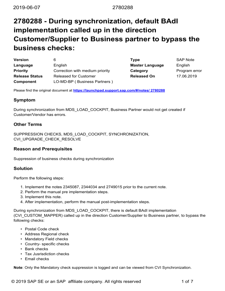 2019-06-07 2780288 2780288 - During synchronization, default BAdI implementation called up in the direction Customer/Supplier to Business partner to bypass the business checks: Version Language Priority Release Status Component 6 English Correction with medium priority Released for Customer LO-MD-BP ( Business Partners ) Type Master Language Category Released On SAP Note English Program error 17.06.2019 Please find the original document at https://launchpad.support.sap.com/#/notes/ 2780288 Symptom During synchronization from MDS_LOAD_COCKPIT, Business Partner would not get created if Customer/Vendor has errors. Other Terms SUPPRESSION CHECKS, MDS_LOAD_COCKPIT, SYNCHRONIZATION, CVI_UPGRADE_CHECK_RESOLVE Reason and Prerequisites Suppression of business checks during synchronization Solution Perform the following steps: 1. Implement the notes 2345087, 2344034 and 2749015 prior to the current note. 2. Perform the manual pre implementation steps. 3. Implement this note. 4. After implementation, perform the manual post-implementation steps. During synchronization from MDS_LOAD_COCKPIT, there is default BAdI implementation (CVI_CUSTOM_MAPPER) called up in the direction Customer/Supplier to Business partner, to bypass the following checks: • • • • • • • Postal Code check Address Regional check Mandatory Field checks Country- specific checks Bank checks Tax Jusrisdiction checks Email checks Note: Only the Mandatory check suppression is logged and can be viewed from CVI Synchronization. © 2019 SAP SE or an SAP affiliate company. All rights reserved 1 of 7 2019-06-07 2780288 Note: By default the checks are enabled and unless the checks are disabled explicitly in the customizing delivered for controlling the suppression checks After Synchronization: 1. Go to se38 and execute the report CVI_UPGRADE_CHECK_RESOLVE. For CVI_UPGRADE_CHECK_RESOLVE documentation, kindly look into SAP Note 2265093 > BP_Conversion Document.PDF (attachment) > Appendix > CVI_UPGRADE_CHECK_RESOLVE. 2. Choose the radio button CVI Synchronization. 3. Once the synchronization is final, click the Complete button. This reverts the checks those were suppressed during synchronization. Note: You have to de-implement the BAdI using Note 2651202 to disable the suppression checks. Manual Activities -----------------------------------------------------------------------|Manual Pre-Implement. | -----------------------------------------------------------------------|VALID FOR | |Software Component SAP_APPL SAP Application | | Release 600 All Support Package Levels | | Release 602 All Support Package Levels | | Release 603 All Support Package Levels | | Release 604 All Support Package Levels | | Release 605 All Support Package Levels | | Release 606 All Support Package Levels | | Release 616 All Support Package Levels | | Release 617 All Support Package Levels | | Release 618 Until SAPK-61812INSAPAPPL | -----------------------------------------------------------------------Perform the following pre-implementation steps: 1. Call up transaction se80. 2. Choose Function Group from the value help. 3. Enter CVI_SUPPRESS_CHECKS in the drop down. If the function group does not exist, a dialog box appears with the option to create a new function group. Follow the instructions and create the function group with the description 'Suppress Checks'. 4. Save the function group in the package CVI_MAPPING. 5. Activate the newly created function group. 6. Call up transaction SM30 7. Give table/view name as "TPARA". 8. Click on Maintain. 9. Give Set/Get parameter ID as "MIG_CHECK" and give package as CVI_MAPPING. 10. Create the following DDICs 1) In the transaction SE11, create domains CVI_PRECHK_SUP_IND and CVI_PRECHK_SUP_TYPE with the following attributes: a) CVI_PRECHK_SUP_IND Short Description Scenarios for Migration Precheck Run Data Type CHAR © 2019 SAP SE or an SAP affiliate company. All rights reserved 2 of 7 2019-06-07 2780288 No. Characters 1 Output Length 1 Package CVI_MAPPING Value Range: X = Suppress = Dont Suppress Save and activate. b) CVI_PRECHK_SUP_TYPE Short Description Suppression check type Data Type CHAR No. Characters 2 Output Length 2 Package CVI_MAPPING Value Range: 01 = Country 02 = Region 03 = Postal Code 04 = Tax Jurisdiction 05 = Email 06 = Bank Save and activate. 2) In the transaction SE11 create data elements CVI_PRECHK_SUP_IND and CVI_PRECHK_SUP_TYPE with the following attributes: a) CVI_PRECHK_SUP_IND Short Description Suppression indicator: functional checks Domain CVI_PRECHK_SUP_IND Package CVI_MAPPING Field Label: Short 10 Sup. Ind. Medium 15 Sup. Indicator Long 30 Suppression Indicator Heading 35 Suppression Indicator Save and activate. b) CVI_PRECHK_SUP_TYPE Short Description: Functional checks need to be configured for suppressing Domain CVI_PRECHK_SUP_TYPE Package CVI_MAPPING Field Label: Short 10 Sup. Chk. Medium 15 Sup. Check Long 30 Suppression Check Heading 35 Suppression Check Save and activate. 3) In the transaction SE11, Create database table CVI_PRECHK_SUP with the following attributes: a) Short Description Activate Suppression Checks b) Delivery Class C c) Fields: Field name Data element Key field MANDT MANDT Yes CHECK_TYPE CVI_PRECHK_SUP_TYPE Yes CHECKED CVI_PRECHK_SUP_IND No d) Data class APPL2 e) Size category 0 f) Buffering Not Allowed g) Enhancement category Cannot be enhanced h) Package CVI_MAPPING Save and activate. 4) Table maintenance generator: a) Go to transaction SE11. © 2019 SAP SE or an SAP affiliate company. All rights reserved 3 of 7 2019-06-07 2780288 b) Give Database Table name as "CVI_PRECHK_SUP". c) Click on Display. d) Click on the "Utilities" option and choose "Table Maintenance Generator". e) Generate the maintenance view with following details. Authorization Group &NC& Function group FG_PRECHK_SUP Package CVI_MAPPING Maintenance type one step Overview screen 1 f) Generate and Save. g) In the maintenance screen "1" generated above for the maintenance view, In the "layout" s