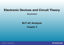 Electronic Devices and Circuit Theory Boylestad BJT AC Analysis Chapter 5 Ch.5 Summary BJT Transistor Modeling A model is an equivalent circuit that represents the AC characteristics of the transistor. A model uses circuit elements that approximate the behavior of the transistor. There are two models commonly used in small signal AC analysis of a transistor: re model Hybrid equivalent model Electronic Devices and Circuit Theory Boylestad © 2013 by Pearson Higher Education, Inc Upper Saddle River, New Jersey 07458 • All Rights Reserved Ch.5 Summary The re Transistor Model BJTs are basically current-controlled devices; therefore the re model uses a diode and a current source to duplicate the behavior of the transistor. One disadvantage to this model is its sensitivity to the DC level. This model is designed for specific circuit conditions. Electronic Devices and Circuit Theory Boylestad © 2013 by Pearson Higher Education, Inc Upper Saddle River, New Jersey 07458 • All Rights Reserved Ch.5 Summary Common-Emitter Configuration The diode re model can be replaced by the resistor re. Ie 1 I b I b re 26 mV IE IE : DC emitter current re: AC diode resistance Electronic Devices and Circuit Theory Boylestad © 2013 by Pearson Higher Education, Inc Upper Saddle River, New Jersey 07458 • All Rights Reserved Ch.5 Summary Common-Emitter Configuration Input impedance: Output impedance: Zo ro Voltage gain: Current gain: Electronic Devices and Circuit Theory Boylestad © 2013 by Pearson Higher Education, Inc Upper Saddle River, New Jersey 07458 • All Rights Reserved Ch.5 Summary Common-Base Configuration Input impedance: Output impedance: Voltage gain: Current gain: Electronic Devices and Circuit Theory Boylestad © 2013 by Pearson Higher Education, Inc Upper Saddle River, New Jersey 07458 • All Rights Reserved Ch.5 Summary Common-Collector Configuration Input impedance: Output impedance: Voltage gain: Current gain: Electronic Devices and Circuit Theory Boylestad For the common-collector configuration, the model defined for the commonemitter Configuration is normally applied rather than defining a model for the common-collector configuration. In subsequent sections, a number of common collector configurations will be investigated and the impact of using the same model will become quite apparent. © 2013 by Pearson Higher Education, Inc Upper Saddle River, New Jersey 07458 • All Rights Reserved Ch.5 Summary The Hybrid Equivalent Model Hybrid parameters are developed and used for modeling the transistor. These parameters can be found on a transistor’s specification sheet: hi = input resistance hr = reverse transfer voltage ratio (Vi/Vo) 0 hf = forward transfer current ratio (Io/Ii) ho = output conductance Electronic Devices and Circuit Theory Boylestad © 2013 by Pearson Higher Education, Inc Upper Saddle River, New Jersey 07458 • All Rights Reserved Ch.5 Summary Simplified General h-Parameter Model hi = input resistance hf = forward transfer current ratio (Io/Ii) Electronic Devices and Circuit Theory Boylestad © 2013 by Pearson Higher Education, Inc Upper Saddle River, New Jersey 07458 • All Rights Reserved Ch.5 Summary re vs. h-Parameter Model Common-Emitter hie βre hfe βac Common-Base hib re hfb α 1 Electronic Devices and Circuit Theory Boylestad © 2013 by Pearson Higher Education, Inc Upper Saddle River, New Jersey 07458 • All Rights Reserved Ch.5 Summary The Hybrid Model The hybrid pi model is most useful for analysis of high-frequency transistor applications. At lower frequencies the hybrid pi model closely approximate the re parameters, and can be replaced by them. Electronic Devices and Circuit Theory Boylestad © 2013 by Pearson Higher Education, Inc Upper Saddle River, New Jersey 07458 • All Rights Reserved Ch.5 Summary Common-Emitter Fixed-Bias Configuration The input is applied to the base The output is taken from the collector High input impedance Low output impedance High voltage and current gain Phase shift between input and output is 180 Electronic Devices and Circuit Theory Boylestad © 2013 by Pearson Higher Education, Inc Upper Saddle River, New Jersey 07458 • All Rights Reserved Ch.5 Summary Common-Emitter Fixed-Bias Configuration AC equivalent re,model Electronic Devices and Circuit Theory Boylestad © 2013 by Pearson Higher Education, Inc Upper Saddle River, New Jersey 07458 • All Rights Reserved Ch.5 Summary Common-Emitter Fixed-Bias Calculations Input Output Z i RB||β|e Z i βre RB 10 βre Zo RC||rO Vo (R ||r ) C o Vi re Av RC re Electronic Devices and Circuit Theory Boylestad Current gain Ai AV Zo RC ro 10RC Av Voltage gain: Current gain: I βRB ro Ai o I i (ro RC )(RB βre ) Ai β ro 10 RC , RB 10 βre Zi RC ro 10 RC © 2013 by Pearson Higher Education, Inc Upper Saddle River, New Jersey 07458 • All Rights Reserved Ch.5 Summary By passed Common-Emitter VoltageDivider Bias re model requires you to determine , re, and ro. Electronic Devices and Circuit Theory Boylestad © 2013 by Pearson Higher Education, Inc Upper Saddle River, New Jersey 07458 • All Rights Reserved Ch.5 Summary Current gain Common-Emitter Voltage-Divider Bias Calculations I R ro Ai o I i (ro RC )(R re ) I R Ai o r 10R I i R re o C Input impedance Output impedance R R1 || R2 Zi R || βre Zo RC || ro Zo RC ro 10RC I Ai o ro 10RC , R 10 re Ii Current gain from Av Ai Av Zi RC Voltage gain Av Vo RC || ro Vi re Av Vo R C ro 10RC Vi re Electronic Devices and Circuit Theory Boylestad © 2013 by Pearson Higher Education, Inc Upper Saddle River, New Jersey 07458 • All Rights Reserved Ch.5 Summary Common-Emitter Emitter-Bias Configuration(Un-bypassed) Electronic Devices and Circuit Theory Boylestad © 2013 by Pearson Higher Education, Inc Upper Saddle River, New Jersey 07458 • All Rights Reserved Ch.5 Summary Impedance Calculations Input impedance: Zi RB || Zb Zb re ( 1)RE Zb (re RE ) Z b RE Output impedance: Zo RC Electronic Devices and Circuit Theory Boylestad © 2013 by Pearson High