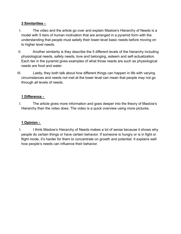 3 Similarities I. The video and the article go over and explain Maslow’s Hierarchy of Needs is a model with 5 tiers of human motivation that are arranged in a pyramid form with the understanding that people must satisfy their lower-level basic needs before moving on to higher level needs. II. Another similarity is they describe the 5 different levels of the hierarchy including physiological needs, safety needs, love and belonging, esteem and self-actualization. Each tier in the pyramid gives examples of what those needs are such as physiological needs are food and water. III. Lastly, they both talk about how different things can happen in life with varying circumstances and needs not met at the lower level can mean that people may not go through all levels of needs. 1 Difference I. The article gives more information and goes deeper into the theory of Maslow’s Hierarchy than the video does. The video is a quick overview using more pictures. 1 Opinion I. I think Maslow’s Hierarchy of Needs makes a lot of sense because it shows why people do certain things or have certain behavior. If someone is hungry or is in fight or flight mode, it’s harder for them to concentrate on growth and potential. It explains well how people’s needs can influence their behavior.