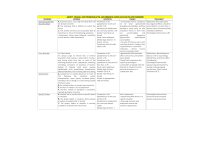 DISOR DISORDER DER Generalized Anxiety Disorder (GAD) Panic Disorder Agoraphobia Specific Phobia ANX ANXIETY, IETY, TRAUM TRAUMAA- AN AND D SSTRES TRES TRESSOR SOR SOR-RELA -RELA -RELATED TED TED,, AND O OBSSES BSSES BSSESSIV SIV SIVE-COM E-COM E-COMPUL PUL PULSIVE SIVE AND RELA RELATED TED DIS DISORDE ORDE ORDERS RS CRITE CRITERIA RIA STATIS STATISTICS TICS CAUS CAUSES ES -some people inherit a tendency A. Excessive worry, occurring more days than not Prevalence in the population for a one-year to be tense (generalized for at least 6 months biological vulnerability), and they B. The individual finds it difficult to control the period: 3.1% Prevalence for adolescents develop a sense early on that worry important events in their lives C. The anxiety and worry are associated with at for a one-year period: 1.1% Gender: two thirds are are uncontrollable and least three or more of the following symptoms: potentially dangerous -restlessness, being easily fatigued, irritability, female Onset: early adulthood (generalized psychological muscle tension, sleep disturbance Median Age of Onset: 31 vulnerability) Course: chronic -this sets off intense worry with Prevalence rates for older resulting physical changes (less adults: 10% responsiveness—autonomic restrictors, chronic muscle tension), leading to GAD For Panic Attack Prevalence in the -agoraphobia often develops An abrupt surge of intense fear or intense population for a one-year after a person has unexpected discomfort that reaches a peak within minutes, period: 2.7% panic attacks and during which time four or more of the Prevalence in the -David Clark emphasizes the following symptom occur: palpitations, sweating, population at some point in specific psychological trembling, sensations of shortness of breath, their lives: 4.7% vulnerability of people with this feeling of choking, chest pains, nausea, Onset: early adulthood disorder to interpret normal lightheaded, chills, paresthesias, derealization, Median Age of Onset: physical sensations in a depersonalization, fear of losing control or dying between 20 to 24 catastrophic way A. marked fear or anxiety about two or more of Gender: two thirds are the following five situations: public female transportation, open spaces, enclosed places, Gender in Agoraphobia: standing in line or being in a crowd, being outside 75% are female the home alone B. the individual fears or avoids these situations E. the fear or anxiety is out of proportion F. the fear, anxiety or avoidance is persistent, typically lasting for 6 months direct experience A. marked fear or anxiety about a specific object Prevalence in the population for a one-year -experiencing false alarms in a or situation specific situation B. The phobic object or situation almost always period: 8.7% Prevalence for adolescents -observing someone else provokes immediate fear or anxiety experience severe fear C. The phobic object or situation is actively for a one-year period: avoided or endured with intense fear 15.8% (vicarious experience) Median Age of Onset: 7 TREATM TREATMEN EN ENTT Medication: Benzodiazepine (has negative effects, should be prescribed for no more than a week or two), Paroxetine (Paxil), Venlafaxine (Effexor) Psychological Intervention: CBT Medications: Benzodiazepine (Xanax, hard to stop taking), SSRIs (Prozac and Paxil), SNRIs (Venlafaxine) Psychological Intervention: exposure-based treatments, anxiety-reducing coping mechanisms, Panic Control Treatment (PCT) Psychological Intervention:: structured and consistent exposure-based exercises Social Anxiety Disorder (Social Phobia) Posttraumatic Stress Disorder (PTSD) D. The fear or anxiety is out of proportion to the actual danger E. The fear, anxiety, or avoidance is persistent, typically lasting for 6 months or more A. Marked fear or anxiety about one or more social situations in which the person is exposed to possible scrutiny by others B. The individual fears that he or she will act in a way, or show anxiety symptoms, that will be negatively evaluated C. The social situations almost always provoke fear or anxiety D. The social situations are avoided or endured with intense fear or anxiety D. The fear or anxiety is out of proportion to the actual threat posed by the social situation E. The fear, anxiety, or avoidance is persistent, typically lasting for 6 months or more A. Exposure to actual or threatened death, serious injury, or sexual violence in one or more of the following ways: directly, witnessing, learning that the event occurred to a close relative or friend, experiencing repeated or extreme exposure to aversive details of the event B. Presence of one or more of the following intrusion symptoms: recurrent, involuntary distressing memories of the event, recurrent distressing dreams, dissociative reactions, intense or prolonged psychological distress, marked physiological reactions to internal or external cues C. Persistent avoidance of stimuli associated with the event: avoidance of or efforts to avoid distressing memories, external reminders, inability to recall an important aspect of the trauma, marked diminished interest in significant activities, feeling of detachment from others, restricted range of affect, sense of foreshortened future Course: chronic -being told about danger (information transmission) Prevalence in the population for a one-year period: 6.8% Prevalence for adolescents for a one-year period: 8.2% Prevalence in the population at some point in their lives: 12.1% Onset: begins during adolescents Median Age of Onset: 13 Gender: 50:50 Prevalent among: people who are young, undereducated, single, and of low socioeconomic class Prevalence in the population for a one-year period: 3.5% Prevalence for adolescents for a one-year period: 3.9% Prevalence in the population at some point in their lives: 6.8% Course: chronic -someone could inherit a generalized biological vulnerability to develop anxiety, a biological tendency to be socially inhibited, or both 