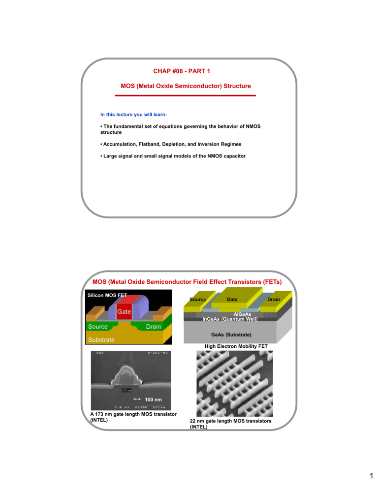 CHAP #06 - PART 1 MOS (Metal Oxide Semiconductor) Structure In this lecture you will learn: • The fundamental set of equations governing the behavior of NMOS structure • Accumulation, Flatband, Depletion, and Inversion Regimes • Large signal and small signal models of the NMOS capacitor ECE 315 – Spring 2005 – Farhan Rana – Cornell University MOS (Metal Oxide Semiconductor Field Effect Transistors (FETs) Silicon MOS FET Source Gate Drain AlGaAs InGaAs (Quantum Well) GaAs (Substrate) High Electron Mobility FET 100 nm A 173 nm gate length MOS transistor (INTEL) 22 nm gate length MOS transistors (INTEL) ECE 315 – Spring 2005 – Farhan Rana – Cornell University 1 A N-MOS (or NMOS) Capacitor Structure Gate metal contact N+ Si Gate or Metal Gate SiO2 x 0 + VGB _ x Doping: Na P-Si Substrate (or Bulk) Metal contact ECE 315 – Spring 2005 – Farhan Rana – Cornell University A NMOS Capacitor in 3D L Metal W N+N+ SiSi Gate or Gategate Metal Gate SiO2 x 0 + VGB _ x P-Si substrate (or bulk) Doping: Na ECE 315 – Spring 2005 – Farhan Rana – Cornell University 2 A NMOS Capacitor N+ Si or Metal Gate SiO2 P-Si ox s tox Assumptions: Doping: Na 0 x 1) The potential in the metal gate is M If the gate is N+ Si then M n 2) The potential deep in the P-Si substrate is p 3) The oxide (SiO2) is insulating (zero conductivity; no free electrons and holes) and is completely free of any charges 4) There cannot be any volume charge density inside the metal gate (it is very conductive). But there can be a surface charge density on the surface of the metal gate 5) Dielectric constants: ox 3.9 o s 11.7 o ECE 315 – Spring 2005 – Farhan Rana – Cornell University A NMOS Capacitor in Equilibrium + Gate - VGB 0 SiO2 P-Si Doping: Na tox 0 x Potential Plot: x B M p M Potential? B tox 0 Assume: B 0 p x We need to find the potential in equilibrium everywhere ECE 315 – Spring 2005 – Farhan Rana – Cornell University 3 A NMOS Capacitor in Equilibrium: Depletion Region Step 1: Charges Flow - VGB 0 + Gate SiO2 P-Si Doping: Na Quantum tunneling tox 0 x Step 2: Depletion region is created in the substrate near the oxide interface, and a surface or sheet charge density is created on the metal gate - VGB 0 + - - - - - - SiO2 Gate tox - - - - - - - 0 P-Si Doping: Na x do Positive surface charge density (C/cm2) x Negative depletion charge density (C/cm3) QG qN a x do qN a ECE 315 – Spring 2005 – Farhan Rana – Cornell University A NMOS Capacitor in Equilibrium: Charge Densities - VGB 0 + Gate - - - - - - SiO2 tox - - - - - - - P-Si 0 x do 0 x do x Charge density plot: QG qN a x do tox x qNa Total charge per unit area in the semiconductor (C/cm2) Depletion region charge density (C/cm3) QB qN a x do ECE 315 – Spring 2005 – Farhan Rana – Cornell University 4 A NMOS Capacitor in Equilibrium: Electric Field - VGB 0 + Gate - - - - - - SiO2 tox - 0 - - - - - - P-Si x do x Electric field in the semiconductor: qN a dE x s s dx E x x qN a s Boundary condition: E x x x do 0 x do x Linearly varying E x x 0 E x tox x do 0 qN a s x do x ECE 315 – Spring 2005 – Farhan Rana – Cornell University Some Electrostatics Consider an interface between media of different dielectric constants: 1 2 E1 E2 Suppose you know E 1 , can you find E 2 ??? Use the principle: The product of the dielectric constant and the normal component of the electric field on both sides of an interface are related as follows: 2 E 2 1 E 1 Interface sheet QI charge density (C/cm2) • Note that E 1 is the electric field JUST to the left of the interface and E 2 is the electric field JUST to right of the interface ECE 315 – Spring 2005 – Farhan Rana – Cornell University 5 A NMOS Capacitor in Equilibrium: Electric Field - VGB 0 + Gate - - - - - - SiO2 ox tox - - - - - - - 0 P-Si s x do Electric field in the oxide: dE x 0 ox dx x qNa xdo E x 0 E x x constant E x x ox E x 0 s E x 0 E x 0 qN a x do ox s qN a x do ox E x tox x do 0 x ECE 315 – Spring 2005 – Farhan Rana – Cornell University A NMOS Capacitor in Equilibrium: Potential - VGB 0 + Gate - - - - - - SiO2 ox tox 0 - - - - - - - P-Si s x do x Potential in the semiconductor: qN a d x x do x E x x dx s x p Boundary condition: x xdo p qN a x do x 2 2 s M tox 0 x do p x ECE 315 – Spring 2005 – Farhan Rana – Cornell University 6 A NMOS Capacitor in Equilibrium: Potential - VGB 0 + Gate - - - - - - SiO2 ox tox - - - - - - - 0 s x do Potential in the oxide: qN a x do d x E x x ox dx x p P-Si x Boundary condition: 2 x 0 p qN2ax do s 2 qN a x do qN a x do x 2 s ox M tox 0 x p x do ECE 315 – Spring 2005 – Farhan Rana – Cornell University A NMOS Capacitor in Equilibrium: Potential - VGB 0 + Gate - - - - - - SiO2 ox tox M - - - - - - - 0 x do 0 x do P-Si s x B tox Must have: x t ox p 2 qN a x do qN a x do t ox M 2 s ox Therefore: x do s Cox 2 2 s s B qN a Cox p x B M p Oxide capacitance (per unit area): Cox ox t ox ECE 315 – Spring 2005 – Farhan Rana – Cornell University 7 A NMOS Capacitor in Equilibrium: Potential - VGB 0 + Gate - - - - - - SiO2 ox tox - - - - - - - 0 P-Si s x do x M B VOX VS tox x do 0 B VOX VS qNa xdo ox x p Oxide capacitance (per unit area) 2 2 qNa xdo qNa xdo qNa x do tox Cox 2 s 2 s Cox ox t ox Potential drop in the semiconductor Potential drop in the oxide ECE 315 – Spring 2005 – Farhan Rana – Cornell University A Biased NMOS Capacitor: VGB > 0 -VGB 0 + Gate - - - - - - SiO2 ox tox - - - - - - - - - - - - P-Si s x do x d 0 x All of the applied bias falls across the depletion region and the oxide B VGB x do B tox xd p 0 B VGB VOX VS qNa x d qNa x d2 Cox Potential drop in the oxide 2 s x The depletion region widens and the oxide field increases when VGB is positive Potential drop in the semiconductor ECE 315 – Spring 2005 – Farhan Rana – Cornell University 8 A Biased NMOS Capacitor: VGB < 0 - VGB 0 + Gate - - - - - - SiO2 ox tox - - - - - - - 0 P-Si s x d x do x All of the applied bias falls across the depletion region and the oxide B 