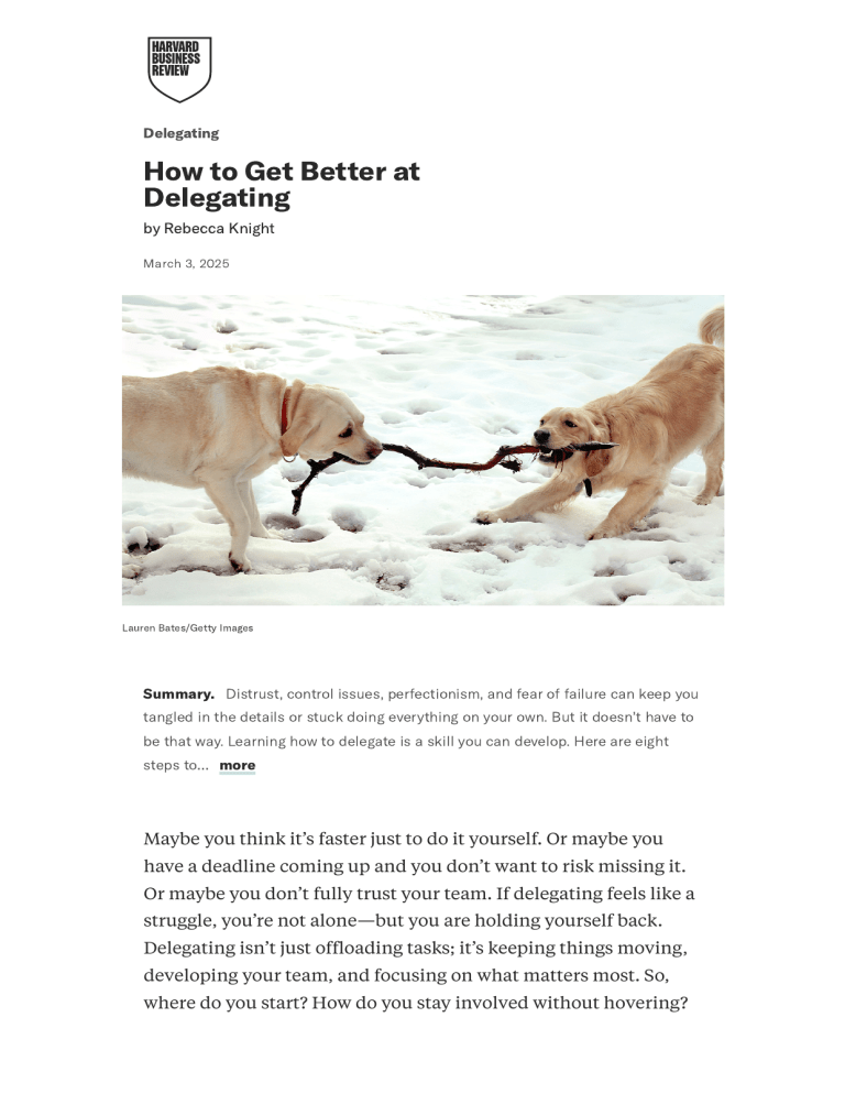 Delegating How to Get Better at Delegating by Rebecca Knight March 3, 2025 Lauren Bates/Getty Images Summary. Distrust, control issues, perfectionism, and fear of failure can keep you tangled in the details or stuck doing everything on your own. But it doesn’t have to be that way. Learning how to delegate is a skill you can develop. Here are eight steps to... more Maybe you think it’s faster just to do it yourself. Or maybe you have a deadline coming up and you don’t want to risk missing it. Or maybe you don’t fully trust your team. If delegating feels like a struggle, you’re not alone—but you are holding yourself back. Delegating isn’t just offloading tasks; it’s keeping things moving, developing your team, and focusing on what matters most. So, where do you start? How do you stay involved without hovering? And how do you stop thinking you’re the only one who can do it right? What the Experts Say Delegating may seem simple, but the real challenge is overcoming the emotional hurdles that make it hard to let go, says Dave Kerpen, the author of Get Over Yourself: How to Lead and Delegate Effectively for More Time, More Freedom, and More Success. Distrust, control issues, perfectionism, and fear of failure can keep you tangled in the details or stuck doing everything on your own. Kerpen suggests focusing on the bigger picture. Sure, “you’re afraid of losing clients, looking foolish, or messing up—but can you push through those fears and be courageous anyway?” After all, the stakes of delegation go beyond completing tasks or having a productive team. “They’re about how you choose to spend your time, your focus, and ultimately, your life.” Consider delegating as your personal “energy management system,” says Emily Morgan, founder of Delegate Solutions and author of Let It Go!: How to (Finally) Master Delegation & Scale Freedom Across Your Organization. “Your energy is your most important resource, and when you delegate, you redirect it toward your most impactful contributions.” Here’s how. Recognize your self-sabotaging habits Before you can delegate effectively, you need to understand what’s getting in your way, says Morgan. Identify the patterns that turn you into a bottleneck. Are you an isolationist, trying to do everything solo? A hero, always swooping in to save the day? A dreamer, throwing out ideas while your team scrambles to keep up? Or an interventionist, a nicer term for micromanager, who insists on being looped in? Once you recognize these tendencies, ask: What’s the real cost—not just to you, but your team and the work? “Be really clear about what you want to spend your time on,” Morgan advises. And don’t let past struggles stop you. Thoughts like I’m not good at delegating or I tried before and it didn’t work create a self-perpetuating cycle. “The reality is that once you’re committed to delegating, the ‘how’ is not complicated,” says Kerpen. Determine tasks you can delegate (hint: there are a lot) According to Kerpen, there are only three things a manager can’t delegate: strategy and vision—which he calls, “the head work, that’s why you’re the leader”; hiring decisions; and ensuring access to resources and budget to get the job done. Everything else? Let it go. When a task lands on your plate, ask yourself: Can someone else handle this? If it doesn’t fall into those three categories, the answer is probably “yes.” While it’s easier to delegate tasks you dislike, it’s more difficult to hand off the ones you’re good at and enjoy, says Morgan. “They’re the hardest things to let go of because they consume a lot of your time and make you feel important and needed.” But hoarding these tasks deprives your team members of learning opportunities, she says. “Think of delegation as a way for them to grow their skill sets.” Start small Begin with baby steps. Morgan recommends tackling low-hanging fruit: tasks that are simple, require minimal effort, and can be completed quickly. “Having some quick wins under your belt creates positive momentum.” Focus on routine tasks with clear steps that others can replicate, like weekly reports or update memos. “Capture them into a process and empower your team,” she says. Allowing others to prove themselves also helps address any lingering trust issues, adds Kerpen. Starting with small assignments fosters gradual skill development and “builds mutual confidence,” he says. And remember, “when people mess up, and they will, because we’re human, it’s part of the learning process.” Find your people Next, you need someone to delegate to. Think expansively, says Morgan. Start by asking: Who are your emerging leaders? Who has the interest, bandwidth, and talents for the task? Who needs to learn something new? And, of course: Who do you trust? Focus first on dependable team members who meet deadlines and are eager to learn. If you’re drawing a blank, it might be your control issues talking. “You don’t always need to be the hero,” says Morgan. Besides, adds Kerpen, “If you don’t think you have the right person to delegate to, it’s your job to find them.” There are plenty of options beyond your team and even your organization: contractors, part-timers, freelancers from Upwork, or even AI, he says. “Get creative and don’t let perceived roadblocks hold you back.” Direct, but allow for autonomy Be upfront about your expectations and offer direction, but don’t overdo it, says Morgan. Explain the assignment, set a deadline, and provide a rough time estimate. “Things can go off-course when someone spends their week on something you thought would take a few hours.” Share your vision for the final product and clearly communicate, both verbally and in writing, what success looks like. As Kerpen puts it, “delegate outcomes, not tasks,” and give your team the freedom to figure out how to get there. “It’s arrogant to th