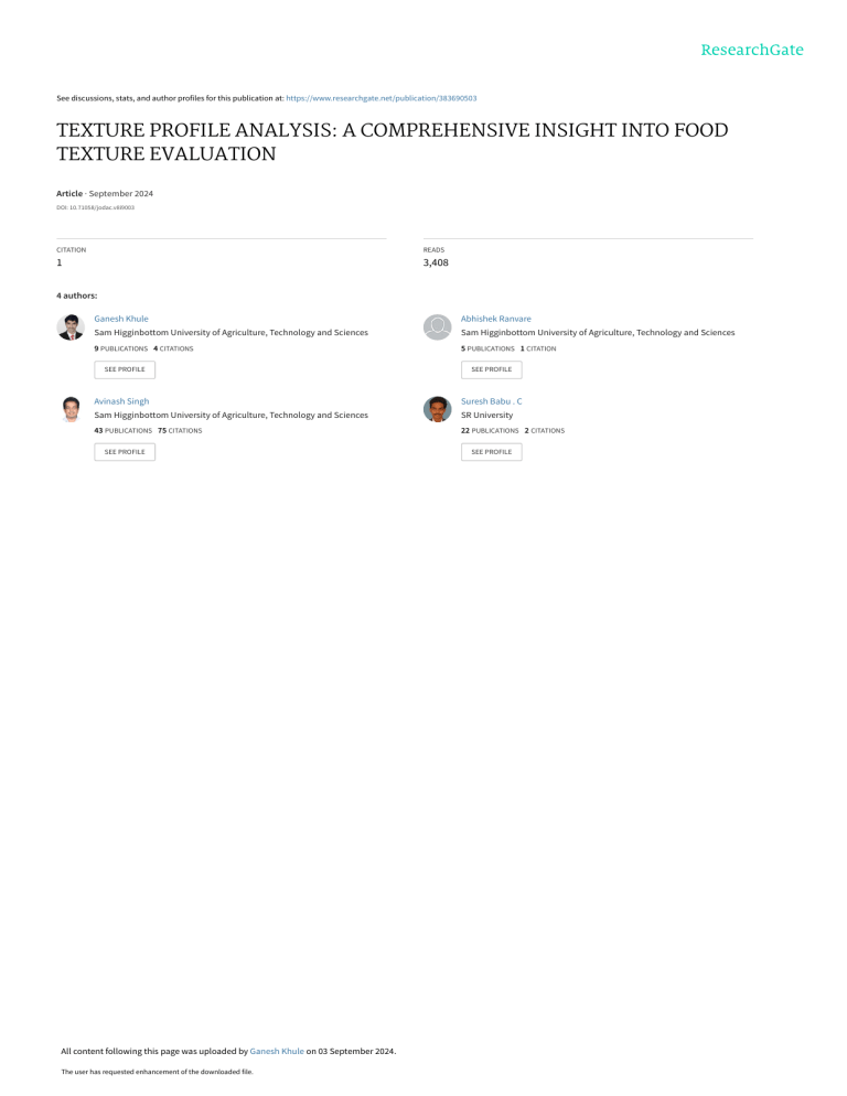 See discussions, stats, and author profiles for this publication at: https://www.researchgate.net/publication/383690503 TEXTURE PROFILE ANALYSIS: A COMPREHENSIVE INSIGHT INTO FOOD TEXTURE EVALUATION Article · September 2024 DOI: 10.71058/jodac.v8i9003 CITATION READS 1 3,408 4 authors: Ganesh Khule Abhishek Ranvare Sam Higginbottom University of Agriculture, Technology and Sciences Sam Higginbottom University of Agriculture, Technology and Sciences 9 PUBLICATIONS 4 CITATIONS 5 PUBLICATIONS 1 CITATION SEE PROFILE SEE PROFILE Avinash Singh Suresh Babu . C Sam Higginbottom University of Agriculture, Technology and Sciences SR University 43 PUBLICATIONS 75 CITATIONS 22 PUBLICATIONS 2 CITATIONS SEE PROFILE All content following this page was uploaded by Ganesh Khule on 03 September 2024. The user has requested enhancement of the downloaded file. SEE PROFILE TEXTURE PROFILE ANALYSIS: A COMPREHENSIVE INSIGHT INTO FOOD TEXTURE EVALUATION Ganesh D. Khule1, Abhishek R. Ranvare2, Avinash Singh3, Suresh Babu. C4 1,2Ph.D. Research Scholar, 3Associate Professor, 4Ph.D. Research Scholar 1,2,3Department of Dairy Technology, Warner JOURNAL OF DYNAMICS AND CONTROL VOLUME 8 ISSUE 9 College of Dairy Technology (WCDT), Sam Higginbottom University of Agriculture, Technology and Sciences (SHUATS), Prayagraj, Uttar Pradesh India 4Department of Agronomy, School of Agriculture (SoA), SR University, Warangal, Telangana, India JOURNAL DYNAMICS AND CONTROL ISSN: 1672-6553 TEXTURE PROFILE ANALYSIS: A COMPREHENSIVE INSIGHT INTO FOOD TEXTURE EVALUATION Ganesh D. Khule1, Abhishek R. Ranvare2, Avinash Singh3, Suresh Babu. C4 1,2 1,2,3 Ph.D. Research Scholar, 3Associate Professor, 4Ph.D. Research Scholar Department of Dairy Technology, Warner College of Dairy Technology (WCDT), Sam Higginbottom University of Agriculture, Technology and Sciences (SHUATS), Prayagraj, Uttar Pradesh India 4 Department of Agronomy, School of Agriculture (SoA), SR University, Warangal, Telangana, India ABSTRACT: Texture is a major aspect of food. The texture of food encourages the consumer to buy certain products again and again. The quality of food is influenced by its textural properties of food. Hardness, adhesiveness, and cohesiveness are some major textural parameters of food. Texture analysis takes a prominent role in analyzing textural parameters, which helps to assess the quality of food. The “Texture profile analysis” is used to analyze the textural properties of food. This method is also known as the double compression test. In the TPA instrument, probes are a major part that makes contact with food and returns to the original position at a specific speed. There are various applications of TPA in the food industry. The uniformity in the texture is Analysed with help of a TPA instrument. Analyzing textural properties from sensory panels is time-consuming but the TPA instrument saves time and gives the accurate result with a typical graphical presentation. The TPA has major applications in research and development and the quality section of the food industry. In this review, the TPA method is discussed along with the textural parameters of the products. KEY WORDS: Texture, Texture profile analysis, Sensory analysis, probes, Applications, Food VOLUME 8 ISSUE 9 2024 PAGE NO: 30 JOURNAL DYNAMICS AND CONTROL ISSN: 1672-6553 INTRODUCTION The food texture is a sensory property that is sensed with the help of vision, hearing, touch, and kinesthetics. In recent years scientists tried to relate human sensory evolution with instrumental analysis. It includes texture profile analysis and shear analysis. The textural properties of food depend upon the molecular arrangement and the material present inside the cell wall changes during handling, processing, and storage. The texture is a sensory property derived by human beings as well as instruments. Texture gives proper orientation to research. (Szczesniak, 2002). The word texture is derived from the word “Textura”. Humans need a variety of textures for example potato chips need a crispy texture tested by acoustic force test. If it doesn’t meet the consumer requirement it will be rejected. Tenderness is one of the textural properties which derives freshness. The food texture can also be termed energy metabolism. Previous research has shown that the soft texture of food products is responsible for type 2 diabetes. Food texture does not contain sense and taste. (Liu et al., 2019). BACKGROUND OF TEXTURE PROFILE ANALYSIS The classification of textural property is given by szczensniak’s which is the factor between the instrumental and sensory evolution of the food. In the instrumental texture profile analysis, the General food texturometer was used by szczensniak for the research. This instrument is the modified form of the MIT Denature tedorometer which is used to mimic the mastification action of the mouth and its unit is composed of flexible arm, strain gauge, and plunger which act upon the food sample. In this equipment, the force is generated through strain gauge which is recorded on the strip recorder. The size of the plunger differs according to the food sample. The height of the plunger is 2.5 cm and the material used for the plunger were luctile, aluminium and brass. GF texturomeater generates the plot which represented as the force as function of the time. The results obtained in the form of texturomeater curves were interpreted on the base of the mechanical properties classified by szzeniak. The seven textural properties are provided by the curve which was named as the hardness, brittleness, cohesiveness, adhesiveness, chewiness, gumminess, and viscosity.(Pons & Fiszman, 1996) 1. Sensory perception vs Instrumental measurement The subjective methods such as “sensory perception” used for the analysis and interpreting human response to the parameters of food and presided with help of five sense as taste, touch, smell, sight and hearing. These methods can be classified into two form