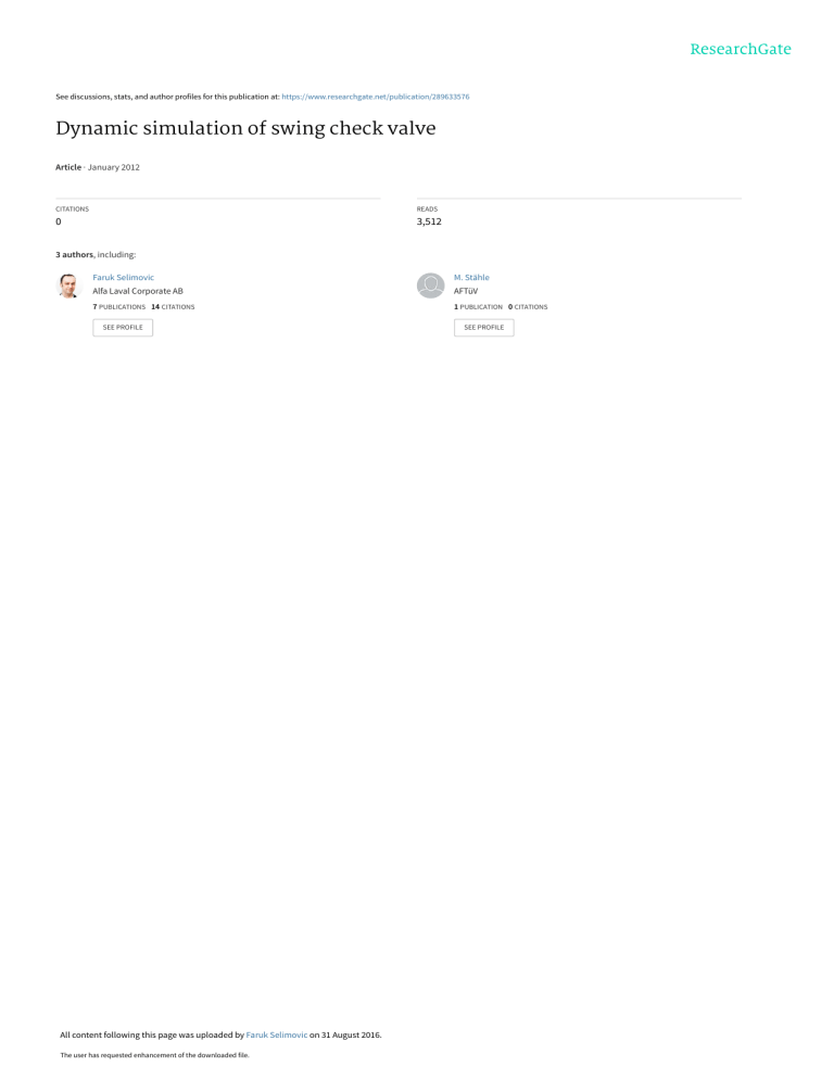 See discussions, stats, and author profiles for this publication at: https://www.researchgate.net/publication/289633576 Dynamic simulation of swing check valve Article · January 2012 CITATIONS READS 0 3,512 3 authors, including: Faruk Selimovic M. Stähle Alfa Laval Corporate AB AFTüV 7 PUBLICATIONS 14 CITATIONS 1 PUBLICATION 0 CITATIONS SEE PROFILE All content following this page was uploaded by Faruk Selimovic on 31 August 2016. The user has requested enhancement of the downloaded file. SEE PROFILE Dynamic simulation of swing check valve F Selimovic, M Polster, M Stähle TUV NORD Sweden AB NOMENCLATURE a Adisk Ator Ats C Cv CHS CHR Fn Feff Ff K Kloc LX pdyn ploc Re Re T Tf v vdisk vrel vRmax v0 Yeff We Speed of sound [m/s] Disk area [m2] Total surface area of torus Ator=2 _LDk [m2] Surface torus section Ats= Ator *( - min)/360 [m2] Discharge coefficient [-] Flow coefficient [-] Non-dimensional factor for static torque [-] Non-dimensional factor for dynamic (rotational) Torque [-] Normal force Fn = Fhyd * cos( ) Effective force [N] Force factor [-] Total pressure loss factor [-] Local pressure loss factor [-] Calculated lever arm LX = T/Fnormal [m] Dynamic pressure [Pa] Local pressure loss (across the disk) [Pa] Reynolds number [-] Reynolds number [-] Torque (total torque) [Nm] Non-dimensional torque coefficient [-] Fluid velocity (usually related to seat velocity) [m/s] Disk velocity vdisk=L* *cos( ) [m/s] Relative velocity vrel = v-vdisk [m/s] Maximum reverse velocity [m/s] Critical flow velocity [m/s] Specific energy loss [m2/s2] Weight of the disk [kg m/s2] Flow factor [-] Offset , distance of hydraulic force acting point tothe center of the disk, LX-L [m] Density of water [kg/m3] Angular velocity of disk w=d /dt [rad] © BHR Group 2012 Pressure Surges 11 = 381 1 INTRODUCTION Water hammer is an important load in many pipe systems, for example, in the process industry, district heating and power generation plants. It is a pressure surge or wave resulting when a fluid in motion is forced to stop or change direction. If pressure surge are induced by check valve they could result in pressure peaks and oscillations causing fatigue damages and could lead to pipe break and support deformation. Check valves should close so that the amount of fluid flowing to wrong direction is as small as possible. There are different types of check valves: swing, lift, tilting disk, duo/double disk, stop and nozzle. But most common because of its simple design, low pressure drop, price and wide range of sizes are Swing Check Valves (SCV). Unfortunately, information about the SCV:s characteristic is usually limited. This makes it difficult to perform precise calculations of the pressure and forces caused by the water hammer. Hence, safety factors should be used if the valve characteristic is not known which can lead to oversize of the entire system. One difficulty with describing check valves lies in the fact that the characteristics depend on the circumstances as the pressure drop across the disk is depending on its speed. It is relatively easy to produce a loss characteristic for a stationary disk, but because of the fact that the disk movement is dependent on the pressure loss across it, there is no definition for a general loss characteristic. Sometimes a process engineer could face the fact that there is not any specification given of the loss characteristics regarding stationary disk. Instead, a curve from a similar valve is used. When there is no sufficiently similarity between valves with known and unknown characteristic two alternatives could be the solution. One is to perform experiments with a fixed disk, which is quite expensive and often difficult. The second is using three-dimensional flow calculations, Computational Fluid Dynamics (CFD), producing a curve for a stationary disk. This is also a quite expensive alternative, but quite common today in industry. In this work a CFD tool was applied to analyse the flow field with the objective of investigating the pressure drop over the disk and calculating the hydraulic force acting on the disk. These investigations were performed for both stationary and moving disk. Moving disk simulations give better understanding of the closing sequence which when transferred to a one dimensional model can predict forces more close to reality. The goal of this work is to perform three-dimensional flow calculations with CFD tool FLUENT, Ref [7] for both a stationary and movable disk. A one dimensional pressure surge tool (in house coded) has been applied for water hammer calculations with more than 30 years of experience and verifications by field tests. The results of this work expect to give improvements for a SCV model when integrated into in house code. The results are also compared with measured and calculated results from the literature. 2 SWING CHECK VALVE The motion of the valve disk can be described by Newton’s second law, an angular momentum conservation law. The momentum conservation equation can be traditionally written as: (1) 382 © BHR Group 2012 Pressure Surges 11 Where represents disk angle positive counterclockwise, Fig 1. The torque components in the right side of equation (1) summarizes all the torques involved and regarding the flow direction as in Figure 1, can further be written as: (2) Where is the hydrodynamic torque, is the torque because of weight. The weight of moved parts is corrected by the buoyancy force of steel mass in the fluid. Additionally one should add a torque because of friction axis. The friction torque stands for the friction of the lever arm at the axis of rotation. It is the sum of a steady friction and a moving friction. Typically this value is negligible comparing the other values for the total torque and we are not taking it into account here. Fig. 1: Schematic of swing check valve Left side of the Eq. (1) and (2) terms the total moment of inertia: I, the moment of inertia of the disk assembly with respect to the 