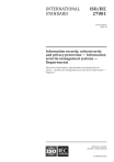 INTERNATIONAL STANDARD ISO/IEC 27001 Third edition 2022-10 Information security, cybersecurity and privacy protection — Information security management systems — Requirements Sécurité de l'information, cybersécurité et protection de la vie privée — Systèmes de management de la sécurité de l'information — Exigences Reference number ISO/IEC 27001:2022(E) --``,,,,,``````,,,,,`,`,`,`,,`,-`-`,,`,,`,`,,`--- © ISO/IEC 2022 ISO/IEC 27001:2022(E) © ISO/IEC 2022 All rights reserved. Unless otherwise specified, or required in the context of its implementation, no part of this publication may be reproduced or utilized otherwise in any form or by any means, electronic or mechanical, including photocopying, or posting on the internet or an intranet, without prior written permission. Permission can be requested from either ISO at the address below or ISO’s member body in the country of the requester. ISO copyright office CP 401 • Ch. de Blandonnet 8 CH-1214 Vernier, Geneva Phone: +41 22 749 01 11 Email: copyright@iso.org Website: www.iso.org Published in Switzerland ii © ISO/IEC 2022 – All rights reserved --``,,,,,``````,,,,,`,`,`,`,,`,-`-`,,`,,`,`,,`--- COPYRIGHT PROTECTED DOCUMENT ISO/IEC 27001:2022(E) Contents Page Foreword......................................................................................................................................................................................................................................... iv Introduction..................................................................................................................................................................................................................................v 1Scope.................................................................................................................................................................................................................................. 1 2Normative references...................................................................................................................................................................................... 1 3 Terms and definitions..................................................................................................................................................................................... 1 4Context of the organization....................................................................................................................................................................... 1 4.1Understanding the organization and its context...................................................................................................... 1 4.2Understanding the needs and expectations of interested parties............................................................ 1 4.3Determining the scope of the information security management system........................................ 2 4.4Information security management system.................................................................................................................... 2 5Leadership................................................................................................................................................................................................................... 2 5.1Leadership and commitment...................................................................................................................................................... 2 5.2Policy................................................................................................................................................................................................................ 3 5.3Organizational roles, responsibilities and authorities........................................................................................ 3 --``,,,,,``````,,,,,`,`,`,`,,`,-`-`,,`,,`,`,,`--- 6Planning......................................................................................................................................................................................................................... 3 6.1Actions to address risks and opportunities.................................................................................................................. 3 6.1.1General......................................................................................................................................................................................... 3 6.1.2Information security risk assessment............................................................................................................. 4 6.1.3Information security risk treatment................................................................................................................. 4 6.2Information security objectives and planning to achieve them.................................................................. 5 7Support............................................................................................................................................................................................................................ 6 7.1Resources..................................................................................................................................................................................................... 6 7.2Competence................................................................................................................................................................................................ 6 7.3Awareness.................................................................................................................................................................................................... 6 7.4Communication....................................................................................................................................