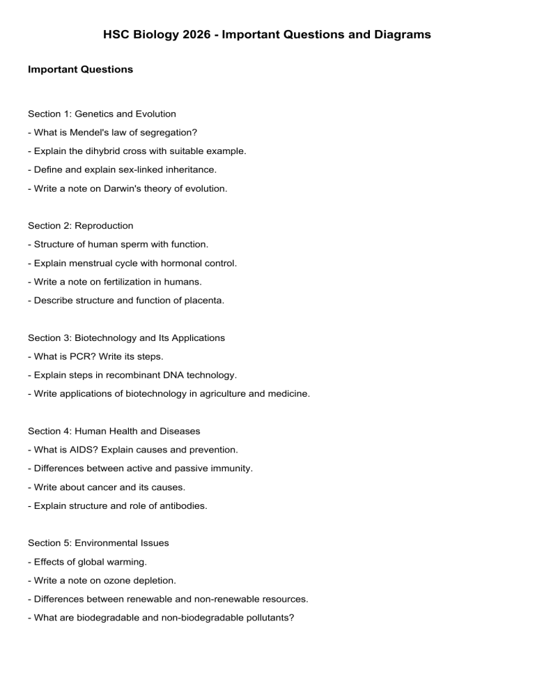 HSC Biology 2026 - Important Questions and Diagrams Important Questions Section 1: Genetics and Evolution - What is Mendel's law of segregation? - Explain the dihybrid cross with suitable example. - Define and explain sex-linked inheritance. - Write a note on Darwin's theory of evolution. Section 2: Reproduction - Structure of human sperm with function. - Explain menstrual cycle with hormonal control. - Write a note on fertilization in humans. - Describe structure and function of placenta. Section 3: Biotechnology and Its Applications - What is PCR? Write its steps. - Explain steps in recombinant DNA technology. - Write applications of biotechnology in agriculture and medicine. Section 4: Human Health and Diseases - What is AIDS? Explain causes and prevention. - Differences between active and passive immunity. - Write about cancer and its causes. - Explain structure and role of antibodies. Section 5: Environmental Issues - Effects of global warming. - Write a note on ozone depletion. - Differences between renewable and non-renewable resources. - What are biodegradable and non-biodegradable pollutants? HSC Biology 2026 - Important Questions and Diagrams Important Diagrams Important Diagrams to Practice: 1. Human male reproductive system 2. Human female reproductive system 3. Structure of a sperm 4. Structure of ovum 5. TS of Testis 6. TS of Ovary 7. DNA double helix structure 8. L.S. of flower (for plant reproduction) 9. Mendel's monohybrid and dihybrid cross (Punnett square) 10. Lac Operon Model 11. Structure of Antibody 12. PCR cycle steps (if diagram is asked)