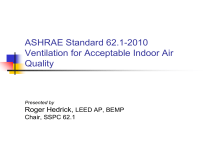 ASHRAE Standard 62.1-2010 Ventilation for Acceptable Indoor Air Quality Presented by Roger Hedrick, LEED AP, BEMP Chair, SSPC 62.1 ASHRAE Standard 62.1 Overview General comments General requirements Ventilation requirements Construction and O/M requirements Energy Efficiency Options Possible Coming Changes Questions ASHRAE Standard 62.1 What’s Its History? 62-1981 Alternative Air Quality Proc. 1970 62-1973 first issued 1980 62-1999 • IAQ-Health disclaimers • Smoking disclaimers • Clarified CO2as ventilation metric 62-2001 •Prescriptive •Commissioning •O&M •Combustion air •Filtration 62.1-2007 Updated 1990 62-1989 • Removed Thermal Comfort • Ventilation Rate Proc. • IAQ Proc. 2000 2010 62.1-2004 •Commercial and High Rise Res. •Enforceable code language •ETS vent. rates not covered •Vent. Rate. Proc. Modified •Occupant and area vent. rates 1. Purpose 1.1 Specify minimum ventilation rates and other measures intended to provide IAQ that is acceptable to human occupants and that minimizes adverse health effects 1.2 Intended for regulatory application to new buildings and additions 1.3 Guide the improvement of IAQ in existing buildings 2. Scope 2.1 All spaces intended for human occupancy excluding low-rise residential (62.2) 2.2 Defines requirements for ventilation, air-cleaning design, commissioning, installation and O&M 2.3 Additional requirements and other standards may apply (labs, healthcare, industrial, etc.) 2.4 May be applied to both new and existing buildings, not intended to be used retroactively 2.5 Does not prescribe specific ventilation rates for smoking spaces 2. Scope 2.6 Ventilation requirements based on chemical, physical, & biological contaminants 2.7 Consideration or control of thermal comfort is not included 2.8 In addition to ventilation, the standard contains requirements related to certain sources 2. Scope 2.9 Acceptable IAQ may not be achieved in all buildings meeting these requirements because of: Diversity of sources and contaminants Air temperature, humidity, noise, lighting, and psychological/social factors Varied susceptibility in the occupants Introduction of outdoor contaminants 3. Definitions 36 Terms Defined Two of Particular Significance Acceptable Indoor Air Quality Occupiable Space General Requirements 4. Outdoor Air Quality 4.1 Regional Air Quality Must determine NAAQS attainment status www.epa.gov Air cleaning is required in some cases in non-attainment areas 4.2 Local Air Quality Conduct observational site survey to identify local sources of air contaminants General Requirements 4. Outdoor Air Quality 4.3 Documentation Regional air quality compliance status Local survey information Conclusions regarding acceptability of outdoor air quality General Requirements 5. Systems and Equipment 5.1 Ventilation Air Distribution Must provide means to adjust the system Minimum ventilation air must be provided to each terminal unit in ceiling/floor plenum systems General Requirements 5. Systems and Equipment 5.2 Exhaust Duct Location 5.3 Ventilation System Controls Operate exhaust ducts with harmful contaminants at negative pressure Control to assure proper ventilation under any operating condition 5.4 Airstream Surfaces Use materials that have documented resistance to microbial growth and erosion General Requirements 5. Systems and Equipment 5.5 Outdoor Air Intakes Separate OA intake from outdoor contaminant sources Must comply with default minimum separation distances in Table 5-1. Examples: Loading dock Dumpster Surface below intake Cooling tower exhaust 25 ft 15 ft 1 ft 25 ft Must limit moisture penetration (using hood, proper velocity, etc.) or manage water that penetrates Prevent moisture intrusion into equipment mounted outdoors Must use bird screens and prevent bird nesting General Requirements 5. Systems and Equipment 5.6 Local Capture of Contaminants Discharge air from non-combustion equipment that captures contaminants shall be exhausted to the outdoors 5.7 Combustion Air Follow manufacturer’s instructions to provide sufficient combustion air and exhaust air for indoor fuel-fired appliances Products of combustion from vented appliances shall be vented directly outdoors General Requirements 5. Systems and Equipment 5.8 Particulate Matter Removal Use a filter rated at MERV 6 (or greater) upstream of cooling coils and other wet-surface devices in supply stream General Requirements 5. Systems and Equipment 5.9 Dehumidification Systems Must be able to limit indoor RH to 65% or less at design dew point condition Exception to RH limit - where occupancy requirements or processes dictate higher RH conditions Intake airflow must be greater than relief/exhaust during cooling (to minimize moist air infiltration) General Requirements 5.9 Dehumidification Systems 65% RH limit 62°F DP General Requirements 5. Systems and Equipment 5.10 Drain Pans Assure drainage without flooding or carryover Slope: 0.125” (1/8”) per foot toward outlet Drain: located at lowest point, with sufficient diameter prevent overflow Drain seal: Shall include P-trap or other seal for negatively pressurized drain pans to prevent ingestion of air while allowing complete drainage (fan on or off) Pan size: length at least 1/2 coil height or as necessary to limit carryover General Requirements 5. Systems and Equipment 5.11 Finned Tube Coils and Heat Exchangers Provide drain pan beneath all dehumidifying cooling coil assemblies and all condensate producing heat exchangers Select to limit coil pressure drop to 0.75 in.wc.@ 500 fpm face velocity Exception- higher pressure drop can be accommodated by providing access on both sides and providing clear and complete instructions for maintenance General Requirements 5. Systems and Equipment 5.12 Humidifiers and Water Spray Systems Use potable water (or better) No downstream devices within absorption distance Exception- devices or obstructions provided with appropriate drain pan General Requirements 5. Systems and Equipment