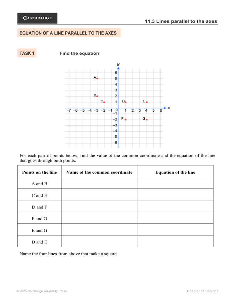 11.3 Lines parallel to the axes EQUATION OF A LINE PARALLEL TO THE AXES TASK 1 Find the equation For each pair of points below, find the value of the common coordinate and the equation of the line that goes through both points. Points on the line Value of the common coordinate Equation of the line A and B C and E D and F F and G E and G D and E Name the four lines from above that make a square. © 2025 Cambridge University Press Chapter 11: Graphs