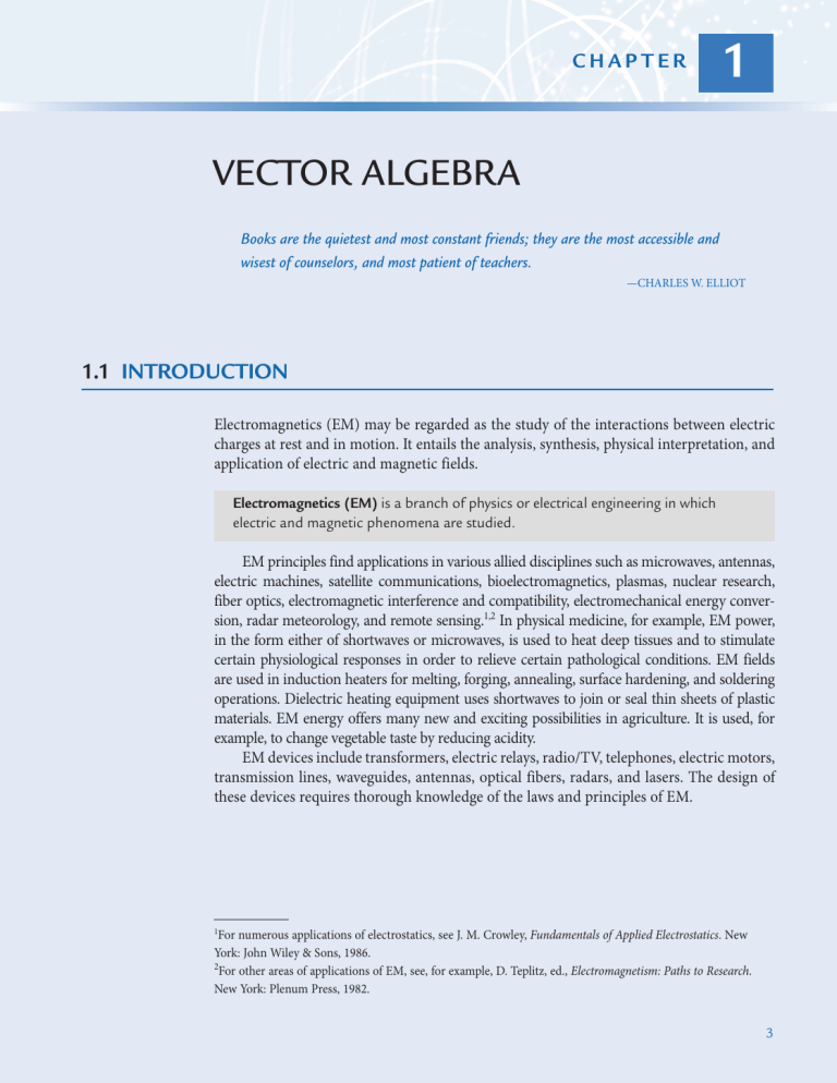 CHAPTER 1 VECTOR ALGEBRA Books are the quietest and most constant friends; they are the most accessible and wisest of counselors, and most patient of teachers. —CHARLES W. ELLIOT 1.1 INTRODUCTION Electromagnetics (EM) may be regarded as the study of the interactions between electric charges at rest and in motion. It entails the analysis, synthesis, physical interpretation, and application of electric and magnetic fields. Electromagnetics (EM) is a branch of physics or electrical engineering in which electric and magnetic phenomena are studied. EM principles find applications in various allied disciplines such as microwaves, antennas, electric machines, satellite communications, bioelectromagnetics, plasmas, nuclear research, fiber optics, electromagnetic interference and compatibility, electromechanical energy conversion, radar meteorology, and remote sensing.1,2 In physical medicine, for example, EM power, in the form either of shortwaves or microwaves, is used to heat deep tissues and to stimulate certain physiological responses in order to relieve certain pathological conditions. EM fields are used in induction heaters for melting, forging, annealing, surface hardening, and soldering operations. Dielectric heating equipment uses shortwaves to join or seal thin sheets of plastic materials. EM energy offers many new and exciting possibilities in agriculture. It is used, for example, to change vegetable taste by reducing acidity. EM devices include transformers, electric relays, radio/TV, telephones, electric motors, transmission lines, waveguides, antennas, optical fibers, radars, and lasers. The design of these devices requires thorough knowledge of the laws and principles of EM. 1 For numerous applications of electrostatics, see J. M. Crowley, Fundamentals of Applied Electrostatics. New York: John Wiley & Sons, 1986. 2 For other areas of applications of EM, see, for example, D. Teplitz, ed., Electromagnetism: Paths to Research. New York: Plenum Press, 1982. 3 4 CHAPTER 1 VECTOR ALGEBRA † 1.2 A PREVIEW OF THE BOOK The subject of electromagnetic phenomena in this book can be summarized in Maxwell’s equations: = # D 5 rv (1.1) =#B50 (1.2) 'B 't 'D =3H5J1 't =3E52 (1.3) (1.4) where = 5 the vector differential operator D 5 the electric flux density B 5 the magnetic flux density E 5 the electric field intensity H 5 the magnetic field intensity v 5 the volume charge density J 5 the current density Maxwell based these equations on previously known results, both experimental and theore­ tical. A quick look at these equations shows that we shall be dealing with vector quantities. It is consequently logical that we spend some time in Part 1 examining the mathematical tools required for this course. The derivation of eqs. (1.1) to (1.4) for time-invariant conditions and the physical significance of the quantities D, B, E, H, J, and v will be our aim in Parts 2 and 3. In Part 4, we shall reexamine the equations for time-varying situations and apply them in our study of practical EM devices such as transmission lines, waveguides, antennas, fiber optics, and radar systems. 1.3 SCALARS AND VECTORS Vector analysis is a mathematical tool with which electromagnetic concepts are most conveniently expressed and best comprehended. We must learn its rules and techniques before we can confidently apply it. Since most students taking this course have little exposure to vector analysis, considerable attention is given to it in this and the next two chapters.3 This chapter introduces the basic concepts of vector algebra in Cartesian coordinates only. The next chapter builds on this and extends to other coordinate systems. A quantity can be either a scalar or a vector. A scalar is a quantity that is completely specified by its magnitude. † Indicates sections that may be skipped, explained briefly, or assigned as homework if the text is covered in one semester. 3 The reader who feels no need for review of vector algebra can skip to the next chapter. 01_Sadiku_Ch01.indd 4 01/11/17 1:14 PM 1.4 Unit Vector 5 A scalar is a quantity that has only magnitude. Quantities such as time, mass, distance, temperature, entropy, electric potential, and population are scalars. A vector has not only magnitude, but direction in space. A vector is a quantity that is described by both magnitude and direction. Vector quantities include velocity, force, momentum, acceleration displacement, and electric field intensity. Another class of physical quantities is called tensors, of which scalars and vectors are special cases. For most of the time, we shall be concerned with scalars and vectors.4 To distinguish between a scalar and a vector it> is customary to represent a vector by > a letter with an arrow on top of it, such as A and B , or by a letter in boldface type such as A and B. A scalar is represented simply by a letter—for example, A, B, U, and V. EM theory is essentially a study of some particular fields. A field is a function that specifies a particular quantity everywhere in a region. A field may indicate variation of a quantity throughout space and perhaps with time. If the quantity is scalar (or vector), the field is said to be a scalar (or vector) field. Examples of scalar fields are temperature distribution in a building, sound intensity in a theater, electric potential in a region, and refractive index of a stratified medium. The gravitational force on a body in space and the velocity of raindrops in the atmosphere are examples of vector fields. 1.4 UNIT VECTOR A vector A has both magnitude and direction. The magnitude of A is a scalar written as A or 0 A 0 . A unit vector aA along A is defined as a vector whose magnitude is unity (i.e., 1) and its direction is along A; that is, aA 5 A A 5 0A0 A Note that 0 aA 0 5 1. Thus we may write A as A 5 AaA (1.5) (1.6) which completely specifies A in terms of its magnitude A and its direction aA. A vector A in Cartesian (or rectangular) coordinates may be represented as 1 