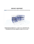 DESIGN REPORT PROPOSED RESIDENCE AT BUYUNI, MTIMWEUPE, PEMBAMNAZI, KIGAMBONI, DAR ES SALAAM Table of Contents 1 REPORT ON DESIGN .............................................................................................................................. 1 1.1 Introduction .................................................................................................................................. 1 1.2 Design Standards .......................................................................................................................... 1 1.3 Material Specifications.................................................................................................................. 1 1.4 Structural System Description ...................................................................................................... 1 1.5 Load Assumptions ......................................................................................................................... 2 1.5.1 Dead Loads ............................................................................................................................ 2 1.5.2 Live Loads .............................................................................................................................. 2 1.5.3 Load Combinations (per BS 8110) ......................................................................................... 2 1.6 2 Conclusion and Recommendations............................................................................................... 2 FRAME AND SHELL ANALYSIS AND DESIGN .......................................................................................... 3 2.1 SOFTWARE MODEL ....................................................................................................................... 3 2.2 ANALYSIS RESULTS ........................................................................................................................ 6 2.2.1 2.3 3 Reaction at the foundation bases results ............................................................................. 6 BEAMS ANALYSIS AND DESIGN ..................................................................................................... 7 CALCULATION SHEETS ATTACHMENT ................................................................................................. 10 1 REPORT ON DESIGN 1.1 Introduction This structural design report presents the analysis and design of a Proposed Residence at Buyuni, Mtimweupe, Pembamnazi, Kigamboni, Dar es Salaam. It outlines the structural systems, materials, design assumptions, and loading criteria employed to ensure safety, functionality, and compliance with applicable codes and standards. The reinforced concrete structure includes foundations, columns, beams, slabs, and a staircase system, designed in line with BS 8110 (1997). Materials consist of C25 grade concrete and high-yield reinforcement steel with a yield strength of 460 N/mm², suitable for residential use under standard occupancy conditions. 1.2 Design Standards The design follows British Standard BS 8110: Part 1 (1997), supported by additional references as shown: Standard BS 8110: Part 1 (1997) BS 8004 (1986) BS 6399 BS 8666 (2005) BS 4449 BS 882 BS 12 Description Structural use of concrete Foundations design Loading for buildings Reinforcement scheduling, bending, and cutting High-yield reinforcement steel specification Aggregates for concrete Ordinary Portland Cement specification 1.3 Material Specifications Material Concrete Reinforcement Aggregates Cement Water Specification Grade C25 (25 N/mm² at 28 days), complying with BS 8110 High-yield steel (460 N/mm²), conforming to BS 4449 Natural crushed stone and sand in accordance with BS 882 Ordinary Portland Cement per BS 12 Clean, free of impurities, suitable for mixing and curing All materials are selected for durability and performance under site-specific environmental conditions. 1.4 Structural System Description Element Description Foundations Isolated pad footings based on allowable bearing pressure Columns Reinforced concrete, rectangular or square in cross-section 1 Beams Slabs Staircase RC beams spanning between columns to support slabs Cast-in-situ solid RC slabs acting compositely with beams Reinforced concrete dog-legged staircase integrated into the structure This system ensures robustness, ease of construction, and alignment with standard residential architecture. 1.5 Load Assumptions 1.5.1 Dead Loads Item Concrete self-weight Floor finishes Ceiling finishes Internal partitions Load (kN/m²) 24 kN/m³ (density) 1.0 0.5 As per architectural layout 1.5.2 Live Loads Area Load (kN/m²) Residential floors 2.0 Staircases and landings 3.0 1.5.3 Load Combinations (per BS 8110) Limit State Combination Ultimate Limit State 1.4Gk + 1.6Qk Serviceability Limit State Quasi-permanent and frequent combinations 1.6 Conclusion and Recommendations The structural design of the proposed residence is consistent with BS 8110: Part 1 (1997) and supporting standards. All structural components—foundations, columns, beams, slabs, and staircase—have been analyzed and detailed to ensure safety, serviceability, and constructability. 2 2 FRAME AND SHELL ANALYSIS AND DESIGN 2.1 SOFTWARE MODEL Figure 1 ISOMETRIC VIEW 3 Figure 2 FRONT VIEW Figure 3 RIGHT SIDE VIEW 4 Figure 4 REAR SIDE VIEW Figure 5 LEFT SIDE VIEW 5 2.2 ANALYSIS RESULTS 2.2.1 Reaction at the foundation bases results Figure 6 Base reactions Figure 7 Base reactions beneath the basement section 6 2.3 BEAMS ANALYSIS AND DESIGN Figure 8 FIRST FLOOR BEAMS ANALYSIS (left) VS DESIGN (right) 7 Figure 9 GROUND FLOOR BEAMS ABOVE THE BASEMENT BEAMS ANALYSIS(right) VS DESIGN (left) 8 Figure 10 ROOF FLOOR BEAMS ABOVE THE BASEMENT BEAMS ANALYSIS(right) VS DESIGN (left) 9 3 CALCULATION SHEETS ATTACHMENT 10 FOUNDATION FOOTING DESIGN Design data Axial load due to service loads Axial load due to ultimate loads (From ETABS model analysis results) (From ETABS model analysi