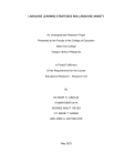 LANGUAGE LEARNING STRATEGIES AND LANGUAGE ANXIETY An Undergraduate Research Paper Presented to the Faculty of the College of Education Mater Dei College Tubigon, Bohol, Philippines In Partial Fulfillment Of the Requirements for the Course Educational Research – Research 102 By MI AMOR H. JUMALIN ITAMAR RENTUAYA DESIREE MAE P. REYES IVY MARIE T. SAMAR GEE ANNE A. SOTOMAYOR May 2023 ii ABSTRACT This quantitative-qualitative study titled “Language Learning Strategies and Language Anxiety”, employing convergent-parallel design was conducted at Mater Dei College, Tubigon, Bohol. One hundred fifty students who have taken Purposive Communication classes were given Google forms and printed surveyquestionnaires. This study aimed to examine the extent of the application of language learning strategies and the level of language anxiety. Moreover, it sought to investigate the significant difference between the extent of the application of language learning strategies and the level of language anxiety when grouped according to profile. Also, this research determined the relationship between the extent of language learning strategies and the level of language anxiety. The results revealed that the application of language learning strategies was high. In all five categories of language anxiety, the participants’ level of language anxiety was high. Public speaking anxiety got the highest mean and anxiety of English class got the lowest mean among the five categories. It was also found out that there is no significant difference between the extent of application of language learning strategies and the level of language anxiety when grouped according to profile. In addition, it was also revealed that there is no significant relationship between the extent of application of language learning strategies and the level of language anxiety. Regardless of the high application of language learning strategies, participants manifested a high level of anxiety. Consequently, extrinsic and intrinsic factors affect the level of anxiety of the participants. Hence, the participants were recommended to immerse themselves in the language to improve their communicative competence and their level of language anxiety. The strengthening of the English-only policy and reading-lab activities were also recommended to engage students in speaking and learning the language comprehensively. The teachers, too, had to provide adequate feedback to help learners correct their errors and mistake, and also to provide interactive and engaging activities to activate participation and involvement of the learners to lessen their anxiety. English clubs were also recommended to broaden the scope of their membership and proposed more English-related activities. Keywords: language learning strategies, language anxiety, communicative competence Chapter 1 THE PROBLEM AND ITS SCOPE Rationale English language is the recognized lingua franca in the international arena. In this era of globalization, learners must learn the skills to be at par with the global standards. The 21st century skills for teachers highlight the indispensable role of the graduates’ communication skills. Nevertheless, international examinations and even national ones reveal the decline of Filipinos’ language proficiency. Since performance is the window to one’s competence, the learners’ language learning strategies demand scrutiny to examine the existing gap that from the process of learning itself. Achieving communicative competence and multi-literacies, the end goals of English language learning require learning strategies, allowing learners to maximize their language immersion and language use. These strategies are activities that contribute to the development system which the learners construct (Heinz ,2016). They are specific actions taken by the learners to make learning easier, faster, more enjoyable, more self- directed, more effective and more transferable to new situation. Language should be learned holistically to attain fluency and accuracy in communication. Gower et. Al (2005) asserted that those language skills are learned holistically. Brown (2001) called it as whole language approach and Orellana (2011) called it as integrated-skill-approach; all primary skills – both macro and micro skills must be integrated and optimized in the communication. 2 However, statistics reveal that the most of the learning strategies of English students do not fit with the language learning principles. The macro skills and micro skills of the language are not learned as whole, rather sequentially, resulting in language learning deficiency. Researches show the deterioration of the English language proficiency in the country. Looking at the language proficiency level of the college graduates, the proficiency level falls below what is expected. These can be seen in several articles (Jimenez, 2018; Morallo, 2018; Macasinag, 2011). Philippines advantage in English proficiency is fastly eroded by declining mastery of the English language of the graduates. In primary education, learners are expected to build a strong foundation in the English language and further develop it at the secondary level so that when learners reach the tertiary level, they are assumed to have a required level of English proficiency. In February 2018, an article published by the GMA News mentioned that the level of English proficiency of college graduates from the Philippines is lower than the target English proficiency of high school students in Thailand, according to a study conducted by the Hopkins International Partners, which is the official Philippine representative to the group called Test of English for International Communication (TOEIC). Now, more than ever, the Philippines’ proficiency is on the decline while others are on the rise. Other than the concern on learners’ learning strategies, there were studies which tried to determine the effect of anxiety in the classroom as anxiety is 