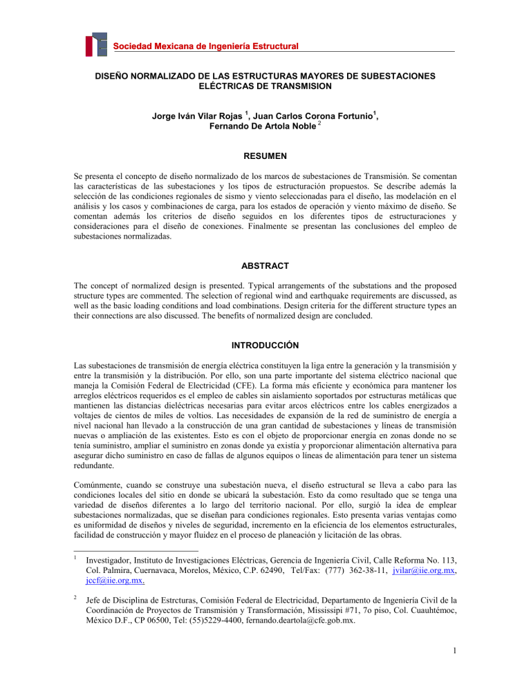 Sociedad Mexicana de Ingeniería Estructural DISEÑO NORMALIZADO DE LAS ESTRUCTURAS MAYORES DE SUBESTACIONES ELÉCTRICAS DE TRANSMISION 1 1 Jorge Iván Vilar Rojas , Juan Carlos Corona Fortunio , 2 Fernando De Artola Noble RESUMEN Se presenta el concepto de diseño normalizado de los marcos de subestaciones de Transmisión. Se comentan las características de las subestaciones y los tipos de estructuración propuestos. Se describe además la selección de las condiciones regionales de sismo y viento seleccionadas para el diseño, las modelación en el análisis y los casos y combinaciones de carga, para los estados de operación y viento máximo de diseño. Se comentan además los criterios de diseño seguidos en los diferentes tipos de estructuraciones y consideraciones para el diseño de conexiones. Finalmente se presentan las conclusiones del empleo de subestaciones normalizadas. ABSTRACT The concept of normalized design is presented. Typical arrangements of the substations and the proposed structure types are commented. The selection of regional wind and earthquake requirements are discussed, as well as the basic loading conditions and load combinations. Design criteria for the different structure types an their connections are also discussed. The benefits of normalized design are concluded. INTRODUCCIÓN Las subestaciones de transmisión de energía eléctrica constituyen la liga entre la generación y la transmisión y entre la transmisión y la distribución. Por ello, son una parte importante del sistema eléctrico nacional que maneja la Comisión Federal de Electricidad (CFE). La forma más eficiente y económica para mantener los arreglos eléctricos requeridos es el empleo de cables sin aislamiento soportados por estructuras metálicas que mantienen las distancias dieléctricas necesarias para evitar arcos eléctricos entre los cables energizados a voltajes de cientos de miles de voltios. Las necesidades de expansión de la red de suministro de energía a nivel nacional han llevado a la construcción de una gran cantidad de subestaciones y líneas de transmisión nuevas o ampliación de las existentes. Esto es con el objeto de proporcionar energía en zonas donde no se tenía suministro, ampliar el suministro en zonas donde ya existía y proporcionar alimentación alternativa para asegurar dicho suministro en caso de fallas de algunos equipos o líneas de alimentación para tener un sistema redundante. Comúnmente, cuando se construye una subestación nueva, el diseño estructural se lleva a cabo para las condiciones locales del sitio en donde se ubicará la subestación. Esto da como resultado que se tenga una variedad de diseños diferentes a lo largo del territorio nacional. Por ello, surgió la idea de emplear subestaciones normalizadas, que se diseñan para condiciones regionales. Esto presenta varias ventajas como es uniformidad de diseños y niveles de seguridad, incremento en la eficiencia de los elementos estructurales, facilidad de construcción y mayor fluidez en el proceso de planeación y licitación de las obras. 1 Investigador, Instituto de Investigaciones Eléctricas, Gerencia de Ingeniería Civil, Calle Reforma No. 113, Col. Palmira, Cuernavaca, Morelos, México, C.P. 62490, Tel/Fax: (777) 362-38-11, jvilar@iie.org.mx, jccf@iie.org.mx. 2 Jefe de Disciplina de Estrcturas, Comisión Federal de Electricidad, Departamento de Ingeniería Civil de la Coordinación de Proyectos de Transmisión y Transformación, Mississipi #71, 7o piso, Col. Cuauhtémoc, México D.F., CP 06500, Tel: (55)5229-4400, fernando.deartola@cfe.gob.mx. 1 XVI Congreso Nacional de Ingeniería Estructural Veracruz, Ver. 2008. TIPOS DE ESTRUCTURACIÓN La función principal de las estructuras de las subestaciones de transmisión es dar soporte a los cables y equipos que conforman el arreglo eléctrico, manteniendo su posición relativa y nivel sobre el terreno. Estos requisitos determinan su altura y separación, incrementándose estos valores en función del voltaje manejado. Para mantener los niveles requeridos, las flechas en los cables se limitan a valores máximos permisibles, lo cual resulta en tensiones mecánicas elevadas. Por las dimensiones requeridas para los voltajes que se emplean en las subestaciones de transmisión en nuestro país (115 kV, 230 kV y 400 kV) y la rigidez requerida de las estructuras para mantener las flechas dentro de límites aceptables, la estructuración más empleada en las estructuras mayores de subestaciones es empleando marcos de acero con trabes y columnas de celosía formados por ángulos estructurales de lados iguales. Normalmente, las subestaciones se construyen en el campo ó en los suburbios de las ciudades. Por ello, su apariencia física no es un aspecto que determine el diseño; sin embargo, existen ubicaciones en las que es necesario tener un mejor impacto visual, para lograr una mejor armonía con el entorno. En estos casos se busca emplear estructuras más simples desde el punto de vista de apariencia, que logren una mayor integración con el entorno. Para estos casos, CFE ha propuesto el empleo de subestaciones con elementos tubulares, que tienen una estructuración más limpia, con la cual se elimina el aspecto industrial de las subestaciones de celosía. Las figuras 1 y 2 muestran una subestación típica de celosía empleada en México y una subestación tubular diseñada en el extranjero. Figura 1 Subestación de celosía 2 Sociedad Mexicana de Ingeniería Estructural Figura 1 Subestación tubular ARREGLOS FÍSICOS La primera etapa en el diseño de una subestación es la definición del funcionamiento eléctrico requerido. A partir de este diseño eléctrico se definen los arreglos físicos que se emplearán en la subestación, en función de las características físicas de los equipos y sus bases y de las distancias dieléctricas de seguridad requeridas en función del voltaje en la subestación y de las condiciones ambientales. De esta mane