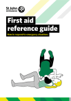 First aid reference guide How to respond to emergency situations Contents 4 4 5 First aid The first aider General information on COVID-19 or pandemics 6 6 9 11 12 13 14 Being a first aider 15 15 18 18 19 Assessing a casualty The role of a first aider Equipment Reporting Keeping yourself informed Personal protection equipment Self-care Primary survey Secondary survey Head-to-toe survey Monitoring a casualty Unresponsive not breathing casualty 23 23 23 24 28 32 Cardiopulmonary resuscitation (CPR) Chest compressions Rescue breaths Automated external defibrillation (AED) CPR after drowning 33 33 35 36 37 Seizures Stroke Head injuries Diabetes 39 39 40 42 43 44 Response problems Airway and breathing problems Choking Asthma Allergic reactions Auto-injector Hyperventilation First aid reference guide 45 45 46 47 48 Circulation problems 55 55 57 59 Burns, poisons and foreign objects 61 64 64 65 Effects of heat and cold 67 67 67 68 69 70 Chest pains Shock Fainting Bleeding Burns Poisons Foreign objects Meningitis Sepsis Bites and stings Bone, muscle and joint injuries Sprains and strains Dislocations Fractures Spinal injuries Crush injuries 3 4 First aid reference guide First aid First aid is the immediate assistance given to someone who is ill or injured. In the vital few minutes before the emergency services arrive basic first aid can be the difference between life and death. The five most common causes of needless death from a lack of first aid are: h choking h the heart not beating h severe bleeding h heart attack h blocked airway. This reference guide provides information about how to respond to each of these emergency situations. It also contains guidance about how to deal with many other injuries and conditions that you may encounter in your daily life. As well as specific treatments, you will also learn how to manage a first aid incident as a whole. The essential advice and practical information contained here will help you to act in an effective, safe and prompt way, ensuring that, should an emergency occur, you can be the difference between a life lost and a life saved. The first aider Anyone can be a first aider. The skills are not difficult to learn, and their value cannot be overestimated. Whether you are busy shopping, looking after children, playing sport, out and about, or providing first aid as a volunteer or as part of your job, it is likely that at some point you will encounter someone who needs first aid. As a first aider, you may be: h working in a small organisation h a childminder h providing first aid in a public place h the first at the scene of a car crash h one of several first aiders in a large company h a teacher. If you are providing first aid at work or as a volunteer, it is important that you receive appropriate training so you have the knowledge and skills for your role. This reference guide aims to support your first aid training, giving you all the notes and guidance you need in one place. First aid training is not a one-off process. It requires ongoing practice and regular refresher training to ensure your knowledge and skills are kept up to date. First aid reference guide As well as receiving first aid training, it is vital that your role is supported by clear policies and procedures. Whether you are a hotel receptionist or a graphic designer, it is important that you understand how the first aid role works in your setting. The information in this guide is set out so you can: h take an overview of the role of the first aider h deal with a first aid incident h treat specific injuries h manage common medical conditions h know what first aid equipment may be needed for your role h understand how the setting can affect first aid needs. General information on COVID-19 or pandemics During a pandemic (such as COVID-19) it is important that you keep yourself safe. The Resuscitation Council will have up to date advice on treating casualties during such a time there web site can be found here www.resus.org.uk St John Ambulance will also update any guidance in line with the Resuscitation Council our advice can be found on our website here sja.org.uk There is common advice that will help you keep safe during a pandemic or local epidemic they include h good hand hygiene h wearing a face mask or covering, in line with latest guidance h avoid touching your eyes, nose, mouth or face covering h good respiratory hygiene, cough or sneeze into a tissue and bin and wash your hands immediately, if you do not have a tissue use your elbow h keeping physical distance from those you do not live with h self-isolate, test and report in accordance with local government guidance. 5 6 First aid reference guide Being a first aider The role of a first aider There is much more to being a first aider than patching up wounds. It is a diverse role that requires the skills and knowledge to provide effective, safe and prompt first aid, as well as the ability to work and communicate effectively with a variety of people. An effective first aider As a first aider you should: h be calm in your approach h be aware of risks to yourself and others h build and maintain trust with all those involved in an incident h give early treatment h call for appropriate help h remember your own needs. All the skills you need to be an effective first aider are covered on your training course. Health and safety and first aid Much is made of the health and safety culture – most of it negative. However, health and safety is simply a common-sense approach to minimising the risk of harm or injury. It uses a methodical and logical procedure to do this which allows you to put in place appropriate measures to manage an incident, for instance, training first aiders and providing them with the appropriate equipment. Health and safety requirements come from: h legislation h best practice h the organisation’s policies h an assessment of the risks in the environment and the activities taking place there. As a first aider, you ne