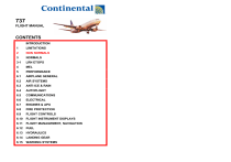 737 FLIGHT MANUAL CONTENTS INTRODUCTION 1 LIMITATIONS 2 NON NORMALS 3 NORMALS 3-1 LRN ETOPS 4 MEL 5 PERFORMANCE 6.1 AIRPLANE GENERAL 6.2 AIR SYSTEMS 6.3 ANTI-ICE & RAIN 6.4 AUTOFLIGHT 6.5 COMMUNICATIONS 6.6 ELECTRICAL 6.7 ENGINES & APU 6.8 FIRE PROTECTION 6.9 FLIGHT CONTROLS 6.10 FLIGHT INSTRUMENT DISPLAYS 6.11 FLIGHT MANAGEMENT, NAVIGATION 6.12 FUEL 6.13 HYDRAULICS 6.14 LANDING GEAR 6.15 WARNING SYSTEMS 737 Flight Manual Continental Sec. Intro TOC - 1 Rev. 11/15/02 #41 INTRODUCTION TABLE OF CONTENTS AUTHORIZATION PAGE ....................................................................... 1 FLIGHT DECK DATA ............................................................................. 3 INTRODUCTION .................................................................................... 5 General ............................................................................................. 5 CRM.................................................................................................. 5 Crew Effectiveness Markers ............................................................ 6 USE OF CHECKLISTS........................................................................... 8 Normal Checklist.............................................................................. 8 Non-Normal Checklists.................................................................. 12 Quick Reference Handbook (QRH) .............................................. 14 CHECKLIST FORMATTING................................................................. 15 General ........................................................................................... 15 Challenge and Response .............................................................. 15 Conditional (IF) Statements ........................................................... 16 OR Arrows ...................................................................................... 16 Continue Checklist At ... Statements............................................. 17 Phase Lines.................................................................................... 17 Cross Referencing ......................................................................... 18 Continued Checklists ..................................................................... 18 Notes, Cautions, and Warnings..................................................... 18 Action Specific Words .................................................................... 19 Crewmember Duties ...................................................................... 19 End-of-Procedure Asterisks........................................................... 19 SECTION OVERVIEW & PROCEDURES........................................... 21 SECTION 1 - LIMITATIONS ............................................................... 21 SECTION 2 - NON-NORMALS .......................................................... 21 Cockpit Voice Recorder (CVR)...................................................... 22 Ground Proximity Warning System / Enhanced Ground Proximity Warning System .......................... 22 SECTION 3 - NORMAL PROCEDURES........................................... 22 SECTION 3-1 - ETOPS / LRN............................................................ 22 SECTION 4 - MINIMUM EQUIPMENT LIST ...................................... 23 SECTION 5 - PERFORMANCE ......................................................... 23 REQUEST FOR FEEDBACK ............................................................... 25 Sec. Intro TOC - 2 Rev. 11/15/02 #41 Continental INTENTIONALLY LEFT BLANK 737 Flight Manual 737 Flight Manual Continental Sec. Intro Page 1 Rev. 11/15/02 #41 AUTHORIZATION PAGE This Continental Airlines / Continental Micronesia Flight Manual contains all the approved Airplane Flight Manual (AFM) operating procedures and performance data as revised and/or modified, and includes any appropriate data or information from revisions dated or numbered: 737-300 737-300 737-500 737-700 737-800 737-900 D6-8730.3T0 D6-8730.3Q81 D6-8735.524 D6-31A001.724 D6-31A001.824 D6-31A001.924 REVISION #22 REVISION #32 REVISION #12 REVISION #13 REVISION #18 REVISION #08 DATED 09/16/02 DATED 09/16/02 DATED 02/08/01 DATED 08/27/02 DATED 07/01/02 DATED 03/20/02 This manual meets or exceeds all requirements of the B737 approved Airplane Flight Manual in accordance with F.A.R. 121.141. Sec. Intro Page 2 Rev. 11/15/02 #41 Continental INTENTIONALLY LEFT BLANK 737 Flight Manual 737 Sec. Intro Page 3 Rev. 11/15/02 #41 Continental Flight Manual FLIGHT DECK DATA The items listed below are provided on the flight deck for flight crew convenience. In the event a listed document is temporarily missing or unusable, operations may be continued using the source material from the applicable Flight, Operations, or Planning & Performance Manual. Missing or out of date documents should be replaced at a station where replacements are available. ITEM FORM NO. DATE 21.0020 21.9016 07/01/94 01/01/02 24.3002 24.3007 24.8022 47.0035 47.0085 47.0067 47.0095 ERG/Red Book 11/15/02 11/15/02 11/15/02 06/30/00 06/30/00 07/10/01R 07/10/01 2001/2002 CHECKLISTS Jumpseat Rider Brief Card Onboard Security Incident & Medlink Procedures Card >>@ 737 Quick Reference Handbook BCD 737 Quick Reference Handbook 737 Normal Checklist 737-300/500 AMT Taxi Checklist 737-300/500 AMT Towing Checklist 737-700/800/900 AMT Taxi Checklist 737-700/800/900 AMT Towing Checklist ERG Red Book Note: The Emergency Response Guide (ERG) or copies of the appropriate pages must be on board whenever hazardous materials are transported. Sec. Intro Page 4 Rev. 11/15/02 #41 Continental INTENTIONALLY LEFT BLANK 737 Flight Manual 737 Flight Manual Sec. Intro Page 5 Rev. 11/15/02 #41 Continental INTRODUCTION General The purpose of this manual is to provide Continental Airlines and Continental Micronesia flight crews with a document which serves both as a training aid and as an inflight tool for handling emergency and abnormal sit