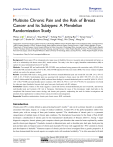 Journal of Pain Research Open Access Full Text Article ORIGINAL RESEARCH Journal of Pain Research downloaded from https://www.dovepress.com/ For personal use only. Multisite Chronic Pain and the Risk of Breast Cancer and Its Subtypes: A Mendelian Randomization Study Wanyu Li 1,2 , Jintao Liu 3 , Teng Wang 2,3 , Yudong Hou 3,4 , Jianheng Bao 2,3 , Yanyan Song 1,2 , Longbi Liu 2,3 , Shuke Ge 3 , Yaohua Shang 5 , Rongdi Wang 1 , Min Zhang 1 , Meng Xu 1 1 Department of Colorectal Surgery, Dalian University of Technology Affiliated Central Hospital (Dalian Central Hospital), Dalian, Liaoning Province, 116033, People’s Republic of China; 2Graduate School, Dalian Medical University, Dalian, Liaoning Province, 116041, People’s Republic of China; 3 Department of Thyroid Surgery, Central Hospital Affiliated to Dalian University of Technology, Dalian, Liaoning Province, 116033, People’s Republic of China; 4Graduate School, China Medical University, Shenyang, Liaoning Province, 110122, People’s Republic of China; 5The First Department of Hand and Foot Surgery, Central Hospital Affiliated to Dalian University of Technology, Dalian, Liaoning Province, 116033, People’s Republic of China Correspondence: Meng Xu, Email xumengyunhan@sina.com Background: Chronic pain (CP) is widespread and a major cause of disability. However, its genetic and environmental risk factors, as well as its relationship with breast cancer (BC), remain unclear. The study is the first to apply Mendelian randomization (MR) to explore the causal relationship between CP and BC. Methods: Two-sample MR and multivariable MR (MVMR) were performed using genome-wide association study (GWAS) data. Univariable MR assessed the effect of CP on BC, while MVMR adjusted for body mass index (BMI). The inverse variance-weighted method was used as the primary method. Results: Univariable MR found a strong genetic link between stomach/abdominal pain and overall BC risk (OR 3.411, 95% CI 1.029–11.313, P=0.045). Neck/shoulder pain was associated with Luminal_A breast cancer risk (OR 1.999, 95% CI 1.263–3.163, P=0.003). Multivariable MR, adjusting for BMI, confirmed these findings for stomach/abdominal pain to overall BC (OR 4.39, 95% CI 1.48–13.06, P=0.008) and neck/shoulder pain to Luminal_A BC (OR 2.46, 95% CI 1.24–4.87, P=0.010). No associations were found for other pain types (headache, hip pain, back pain, knee pain, facial pain) with BC subtypes. Conclusion: Genetic evidence in this study suggests a causal link between stomach/abdominal pain and overall BC, and between neck/shoulder pain and Luminal-A BC risk in Europeans. Determining the cause of this discrepancy might shed light on the complicated link between breast cancer etiology and chronic pain genetics, emphasizing the need for further investigations and potential clinical applications to enhance breast cancer prevention and management. Keywords: Mendelian randomization, chronic pain, breast cancer, BMI, confounder Introduction Chronic pain (CP) is widely defined as pain persisting beyond 3 months1,2 and can be a primary disorder or secondarily associated with injury, surgery, or a range of medical conditions. Around 30% of the global population suffers from chronic pain, with an average of three pain locations reported.3 The classification of chronic pain is a systematic categorization of multiple types of chronic pain conditions. The International Association for the Study of Pain (IASP) developed a classification of chronic pain for the International Classification of Diseases (ICD-11) Among 7 major diagnostic categories, chronic primary pain comprises chronic pain disorders that cannot be better explained by another specific chronic pain diagnosis.4 Headache, stomach or abdominal pain, neck or shoulder pain, back pain, facial pain, hip pain and knee pain are frequent causes of chronic pain in people. Previous work suggested that ~50% variation in chronic pain development is heritable.5 Numerous aspects of chronic pain have been investigated from a genetic perspective. It has been demonstrated that several aspects are complex traits with moderate heritability.6 It is often associated with both Journal of Pain Research 2025:18 2343–2357 Received: 23 September 2024 Accepted: 7 April 2025 Published: 7 May 2025 2343 © 2025 Li et al. This work is published and licensed by Dove Medical Press Limited. The full terms of this license are available at https://www.dovepress.com/terms.php and incorporate the Creative Commons Attribution – Non Commercial (unported, v4.0) License (http://creativecommons.org/licenses/by-nc/4.0/). By accessing the work you hereby accept the Terms. Non-commercial uses of the work are permitted without any further permission from Dove Medical Press Limited, provided the work is properly attributed. For permission for commercial use of this work, please see paragraphs 4.2 and 5 of our Terms (https://www.dovepress.com/terms.php). Li et al specific and non-specific medical conditions such as cancers, HIV/AIDS, fibromyalgia and musculoskeletal conditions.7– 9 Moreover, CP is associated with expensive health care costs, increasing disability and mortality.10–14 Breast cancer is a prominent cause of cancer incidence worldwide; 2.3 million people were newly diagnosed in 2020, accounting for 11.7% of all cancer cases. It is the sixth biggest cause of cancer-related mortality globally, with 685,000 deaths.15 Although the current treatment modalities, including surgical intervention, radiotherapy, chemotherapy, and targeted therapy, have significantly contributed to a reduction in breast cancer mortality rates, the etiology of this disease remains elusive. Furthermore, environmental factors such as radiation exposure and lifestyle choices alongside genetic predisposition play pivotal roles in breast cancer development.16 About 5–10% of cases of breast cancer are caused by genetic factors, such as single nucleotide polymorphisms (SNPs) in the genome an