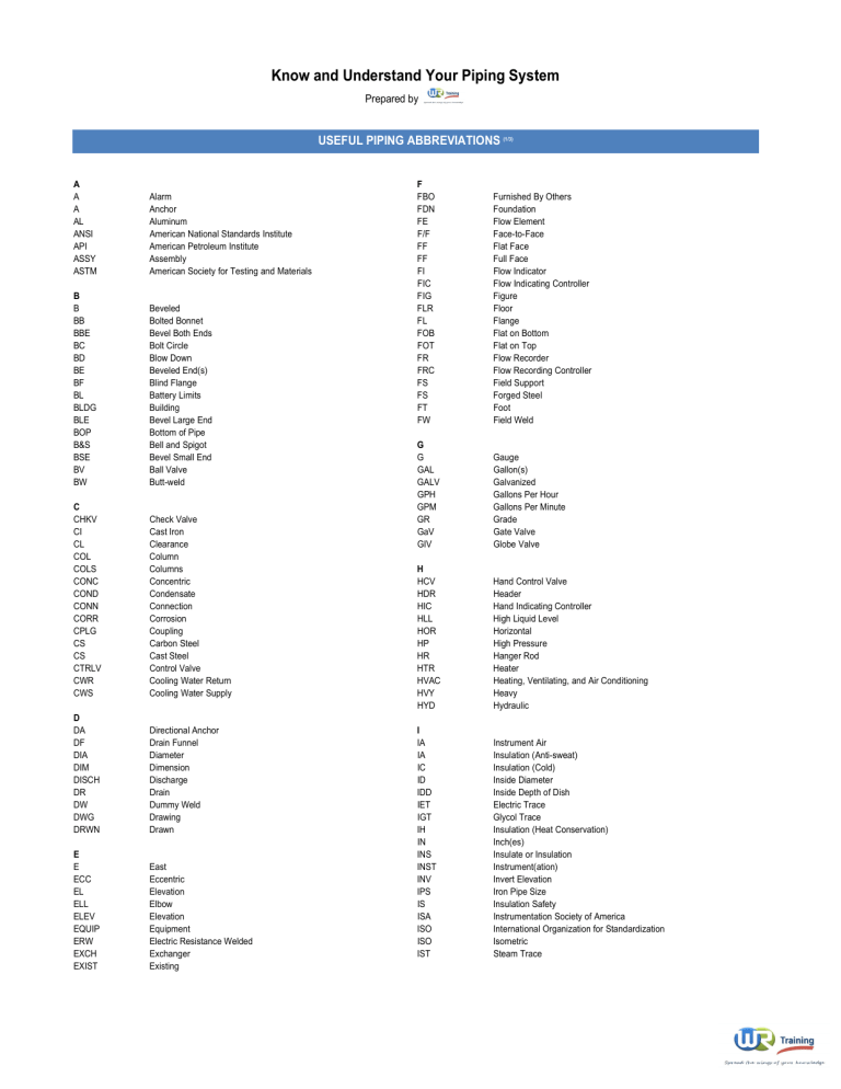 Know and Understand Your Piping System Prepared by USEFUL PIPING ABBREVIATIONS (1/3) A A A AL ANSI API ASSY ASTM Alarm Anchor Aluminum American National Standards Institute American Petroleum Institute Assembly American Society for Testing and Materials B B BB BBE BC BD BE BF BL BLDG BLE BOP B&S BSE BV BW Beveled Bolted Bonnet Bevel Both Ends Bolt Circle Blow Down Beveled End(s) Blind Flange Battery Limits Building Bevel Large End Bottom of Pipe Bell and Spigot Bevel Small End Ball Valve Butt-weld C CHKV CI CL COL COLS CONC COND CONN CORR CPLG CS CS CTRLV CWR CWS Check Valve Cast Iron Clearance Column Columns Concentric Condensate Connection Corrosion Coupling Carbon Steel Cast Steel Control Valve Cooling Water Return Cooling Water Supply D DA DF DIA DIM DISCH DR DW DWG DRWN Directional Anchor Drain Funnel Diameter Dimension Discharge Drain Dummy Weld Drawing Drawn E E ECC EL ELL ELEV EQUIP ERW EXCH EXIST East Eccentric Elevation Elbow Elevation Equipment Electric Resistance Welded Exchanger Existing F FBO FDN FE F/F FF FF FI FIC FIG FLR FL FOB FOT FR FRC FS FS FT FW Furnished By Others Foundation Flow Element Face-to-Face Flat Face Full Face Flow Indicator Flow Indicating Controller Figure Floor Flange Flat on Bottom Flat on Top Flow Recorder Flow Recording Controller Field Support Forged Steel Foot Field Weld G G GAL GALV GPH GPM GR GaV GIV Gauge Gallon(s) Galvanized Gallons Per Hour Gallons Per Minute Grade Gate Valve Globe Valve H HCV HDR HIC HLL HOR HP HR HTR HVAC HVY HYD Hand Control Valve Header Hand Indicating Controller High Liquid Level Horizontal High Pressure Hanger Rod Heater Heating, Ventilating, and Air Conditioning Heavy Hydraulic I IA IA IC ID IDD IET IGT IH IN INS INST INV IPS IS ISA ISO ISO IST Instrument Air Insulation (Anti-sweat) Insulation (Cold) Inside Diameter Inside Depth of Dish Electric Trace Glycol Trace Insulation (Heat Conservation) Inch(es) Insulate or Insulation Instrument(ation) Invert Elevation Iron Pipe Size Insulation Safety Instrumentation Society of America International Organization for Standardization Isometric Steam Trace Know and Understand Your Piping System Prepared by USEFUL PIPING ABBREVIATIONS (2/3) J JCT JS JT Junction Jack Screw Joint L L LA LAH LAL LBS LC LC LG LG LI LIC LLL LN LO LP LPG LPT LR LR LRC LS Level Level Alarm Level Alarm-High Level Alarm-Low Pounds Level Controller Lock Closed Level Gauge Level Glass Level Indicator Level Indicating Controller Low Liquid Level Line Lock Open Low Pressure Liquefied Petroleum Gas Low Point Level Recorder Long Radius Level Recording Controller Level Switch M mm M M&F MATL MAX MECH MFG MFR MI MIN MIN MISC MK MW MW millimeter Meter Male and Female Material Maximum Mechanical Manufacturing Manufacturer Malleable Iron Minimum Minute Miscellaneous Piece Mark Manway Miter Weld N N NC NEC NEG NIP NLL NO NO NOM NOZZ NPS NPSH NPT NTS North Normally Closed National Electric Code Negative Nipple Normal Liquid Level Normally Open Number Nominal Nozzle Nominal Pipe Size Net Positive Suction Head National Pipe Thread Not to Scale O OAL OD Overall Length Outside Diameter OH OPP OS&Y OVHD OWS Open Hearth Opposite Outside Screw and Yoke Overhead Oily Water Sewer P PA PA PC PCV PdRC PE PI PI PIC P&ID PLE PO POE POS PP PR PRC PS PSE PSI PSIA PSIG PSV PT Pipe Anchor Pressure Alarm Pressure Controller Pressure Control Valve Pressure Differential Recording Controller Plain End Point of Intersection Pressure Indicator Pressure Indicating Controller Piping and Instrument Diagram Plain Large End Pump Out Plain One End Positive Personnel Protection Pressure Recorder Pressure Recording Controller Pipe Support Plain Small End Pounds Per Square Inch Pounds Per Square Inch Absolute Pounds Per Square Inch Gage Pressure Safety Valve Point Q QTY QUAD QUAD Quantity Quadrant Quadruple R R REC’D RED REF REINF REQ’D REV REV RF RJ RPM RS RTJ Radius Received Reducer Reference Reinforce Required Reverse Revision Raised Face Ring-Type Joint Rotations Per Minute Rising Stem Ring Type Joint S S SC SCH SCRD SECT SH SMLS SO SO SOL SP South Sample Connection Schedule Screwed Section (SHT) Sheet Seamless Slip On Steam Out Sock-o-let Set Point Know and Understand Your Piping System Prepared by USEFUL PIPING ABBREVIATIONS (3/3) SP SPEC SQ SR STD STL STM SUCT SUPT SW SWG SWP SYS GR Specific Gravity Specification Square Short Radius Standard Steel Steam Suction Support Socket-Weld Swage Standard Working Pressure System T T TA Tan TBE TC TCV TE TEMP T&C T&G THRD TI TIC TLE TOC TOG TOL TOS TR TRC TSE T/T TW TW TYP Steam Trap Temperature Alarm Tangent Thread Both Ends Temperature Controller Temperature Control Valve Threaded End Temperature Thread and Coupled Tongue and Groove Thread Temperature Indicator Temperature Indicating Controller Thread Large End Top of Concrete Top of Grout Thread-o-let Top of Steel Temperature Recorder Temperature Recording Controller Thread Small End Tangent to Tangent Temperature Well Thermowell Typical U UA US Utility Air Utility Station V VA VA VB VC VERT VF VOL VS Valve Vent to Atmosphere Vortex Breaker Vitrified Clay Vertical Vent to Flare Volume Vent to Stack W w/ W WB WE WLD WN WOG WOL with West Welded Bonnet Weld End Weld Weld Neck Water, Oil, Gas Weld-o-let WT Weight X XH XS XXH XXS Extra Heavy Extra Strong Double Extra Heavy Double Extra Strong
