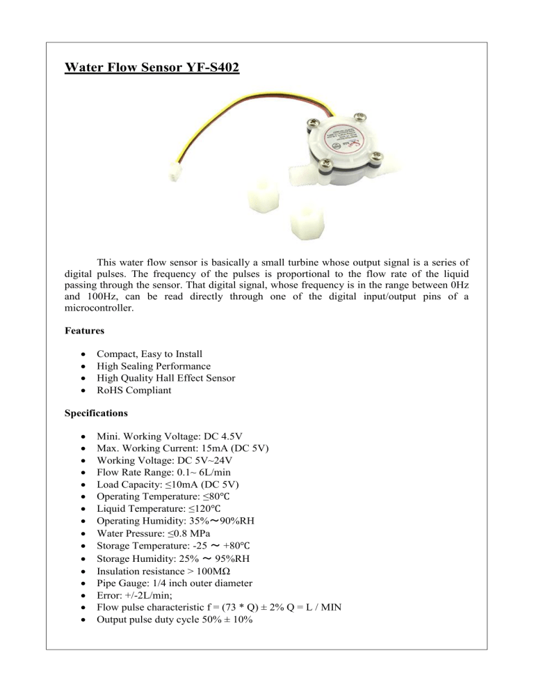 Water Flow Sensor YF-S402 This water flow sensor is basically a small turbine whose output signal is a series of digital pulses. The frequency of the pulses is proportional to the flow rate of the liquid passing through the sensor. That digital signal, whose frequency is in the range between 0Hz and 100Hz, can be read directly through one of the digital input/output pins of a microcontroller. Features Compact, Easy to Install High Sealing Performance High Quality Hall Effect Sensor RoHS Compliant Specifications Mini. Working Voltage: DC 4.5V Max. Working Current: 15mA (DC 5V) Working Voltage: DC 5V~24V Flow Rate Range: 0.1~ 6L/min Load Capacity: ≤10mA (DC 5V) Operating Temperature: ≤80℃ Liquid Temperature: ≤120℃ Operating Humidity: 35%~90%RH Water Pressure: ≤0.8 MPa Storage Temperature: -25 ~ +80℃ Storage Humidity: 25% ~ 95%RH Insulation resistance > 100MΩ Pipe Gauge: 1/4 inch outer diameter Error: +/-2L/min; Flow pulse characteristic f = (73 * Q) ± 2% Q = L / MIN Output pulse duty cycle 50% ± 10% Other Features Light weight, small, easy to install; With stainless steel axis in the wheel, abrasion resistant; Sealing ring would never leak water; All material meets RoHS standard Application Suitable for water heater, POS terminal, automatic water dispenser etc. Caution Non-violent shocks and chemical erosion. Non-throwing or collision. Install it in vertical, inclination should not beyond 5 degree; Medium temperature should not exceed 120'C. Current can not exceed 10mA, Connector Details Red Yellow Black : : : IN positive OUT signal output GND negative Dimensions / Weight Dimensions : Weight : Thread Size : 2.28 in x 1.38 in x 1.06 in (5.8 cm x 3.5 cm x 2.7 cm) 1.02 oz (29 g) G 1/4"