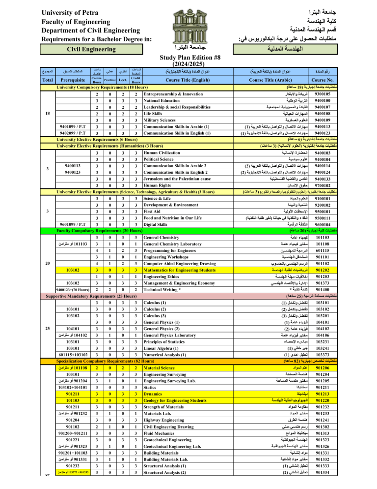 جامعة البترا كلية الهندسة قسم الهندسة المدنية University of Petra Faculty of Engineering Department of Civil Engineering :متطلبات الحصول على درجة البكالوريوس في Requirements for a Bachelor Degree in: الهندسة المدنية Civil Engineering Study Plan Edition #8 (2024/2025) المجموع المتطلب السابق Total Prerequisite ساعات عملي االتصال Comm. Practical Hours نظري Lect. الساعات المعتمدة Credit Hours )عنوان المادة (باللغة اإلنجليزية )عنوان المادة (باللغة العربية رقم المادة Course Title (English) Course Title (Arabic) Course No. University Compulsory Requirements (18 Hours) 18 3 3 2 0 2 2 Entrepreneurship & Innovation 3 0 3 3 National Education 2 0 2 2 Leadership & social Responsibilities 2 0 2 2 Life Skills 3 0 3 3 Military Sciences 9401099 / P.T 3 0 3 3 Communication Skills in Arabic (1) 9402099 / P.T 3 0 3 3 Communication Skills in English (1) University Elective Requirements (6 Hours) University Elective Requirements (Humanities) (3 Hours) 9300105 الريادة واالبتكار 9400100 التربية الوطنية 9400107 القيادة والمسؤولية المجتمعية 9400108 المهارات الحياتية 9400109 العلوم العسكرية 9400113 )1( مهارات االتصال والتواصل باللغة العربية 9400123 )1( مهارات االتصال والتواصل باللغة االنجليزية ) ساعة6( متطلبات جامعة إختيارية ) ساعات3( )متطلبات جامعة إختيارية (العلوم اإلنسانية 3 0 3 3 Human Civilization 3 0 3 3 Political Science 9400113 3 0 3 3 Communication Skills in Arabic 2 9400123 3 0 3 3 Communication Skills in English 2 3 0 3 3 Jerusalem and the Palestinian cause 3 0 3 3 Human Rights University Elective Requirements (Science, Technology, Agriculture & Health) (3 Hours) الحضارة اإلنسانية 9400103 علوم سياسية 9400104 9400114 )2( مهارات االتصال والتواصل باللغة العربية 9400124 )2( مهارات االتصال والتواصل باللغة االنجليزية القدس والقضية الفلسطينية 9400133 حقوق اإلنسان 9700102 ) ساعات3( )متطلبات جامعة إختيارية (العلوم والتكنولوجيا والصحة والفنون 3 0 3 3 Science & Life 3 0 3 3 Development & Environment 3 0 3 3 First Aid 3 0 3 3 Food and Nutrition in Our Life 9601099 / P.T 3 0 3 3 Digital Skills Faculty Compulsory Requirements (20 Hours) 3 0 3 3 3 1 0 1 4 1 2 3 3 1 0 1 20 4 1 2 3 103102 3 0 3 3 1 0 1 1 103102 3 0 3 3 9400123+(70 Hours) 2 2 0 2 Supportive Mandatory Requirements (25 Hours) أو متزامن101103 General Chemistry General Chemistry Laboratory Programming for Engineers Engineering Workshops Computer Aided Engineering Drawing Mathematics for Engineering Students Engineering Ethics Management & Engineering Economy Technical Writing * 3 0 3 3 Calculus (1) 3 0 3 3 Calculus (2) 3 0 3 3 Calculus (3) 3 0 3 3 General Physics (1) 104101 3 0 3 3 General Physics (2) أو متزامن104102 3 1 0 1 General Physics Laboratory 103101 3 0 3 3 Principles of Statistics 103101 3 0 3 3 Linear Algebra (1) 601115+103102 3 0 3 3 Numerical Analysis (1) Specialization Compulsory Requirements (82 Hours) 103101 103102 25 أو متزامن101108 103101 أو متزامن901204 103102+104101 901211 101103 901211 أو متزامن901232 901204 901102 901200+901211 901221 أو متزامن901323 901201+101103 أو متزامن901331 901232 82 ) ساعة18( متطلبات جامعة إجبارية أو متزامن103373 +901333 2 3 3 3 3 3 3 3 3 2 3 3 3 3 3 3 3 0 0 1 0 0 0 0 1 0 1 0 0 1 0 1 0 0 2 3 0 3 3 3 3 0 3 0 3 3 0 3 0 3 3 2 3 1 3 3 3 3 1 3 1 3 3 1 3 1 3 3 Material Science Engineering Surveying Engineering Surveying Lab. Statics Dynamics Geology for Engineering Students Strength of Materials Materials Lab. Highway Engineering Civil Engineering Drawing Fluid Mechanics Geotechnical Engineering Geotechnical Engineering Lab. Building Materials Building Materials Lab. Structural Analysis (1) Structural Analysis (2) العلم والحياة 9100101 التنمية والبيئة 9200102 اإلسعافات األولية 9500101 )الغذاء والتغذية في حياتنا (لغير طلبة التغذية 9500111 الثقافة الرقمية 9600104 ) ساعة20( متطلبات كلية إجبارية 101103 كيمياء عامة 101108 مختبر كيمياء عامة 601115 البرمجة للمهندسين 901101 المشاغل الهندسية 901102 الرسم الهندسي بالحاسوب 901202 الرياضيات لطلبة الهندسة 901203 أخالقيات مهنة الهندسة 901373 اإلدارة واإلقتصاد الهندسي * كتابة تقنية 901400 ) ساعة25( متطلبات مساندة الزامية 103101 )1( تفاضل وتكامل 103102 )2( تفاضل وتكامل 103201 )3( تفاضل وتكامل 104101 )1( فيزياء عامة 104102 )2( فيزياء عامة 104106 مختبر فيزياء عامة مبادىء اإلحصاء 103231 )1( جبر خطي 103241 )1( تحليل عددي 103373 ) ساعة82( متطلبات تخصص إجبارية علم المواد هندسة المساحة مختبر هندسة المساحة استاتيكا ديناميكا الجيولوجيا لطلبة الهندسة مقاومة المواد مختبر المواد هندسة الطرق رسم هندسي مدني ميكانيكا الموائع الهندسة الجيوتقنية مختبر الهندسة الجيوتقنية مواد إنشائية مختبر مواد إنشائية )1( تحليل إنشائي )2( تحليل إنشائي 901206 901204 901205 901211 901213 901220 901232 901233 901241 901302 901313 901323 901326 901331 901332 901333 901334 جامعة البترا كلية الهندسة ق