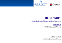 BUSI 1401 Foundations of Information Systems Lecture 3 Ch03-Ethics and Privacy Arthur So, Ph.D. ArthurSo@cunet.carleton.ca . Agenda • Recap of Week2 • Assignments 1 • Ethical Issues • Privacy • Information Security • Introduction to Excel 2 Recap Ch02 1/2 • Business Process • Competitive Advantage – cost/quality/speed • Cross Functional – required multiple areas to produce a single output, like new product design • IS & Business – executing, capturing & storing transactional data, and monitoring • Business Management Strategy • • • • Reengineering (BPR) Improvement (BPI) Management (BPM) Process modeling & activity Compare the use of BPR and BPI Recap Ch02 2/2 • Business pressures • • • Market – Globalization, diversity workforce, informed customers Technology – innovation, information overload issues (data, information, and knowledge) Societal/political/legal – social responsibility, compliances, attacks, ethical and privacy issues • Porter’s model – analysis of 5 competitive forces determining product profitability 1. 2. 3. 4. 5. Industry competition (Rivalry) Threat of new entrants Threat of substitute products Bargaining power of buyers Bargaining power of suppliers • Value Chain, Primary and supportive activities in Porter • Use Porter to evaluate new/existing products or services Ethics The principles of right and wrong actions that corporations use to make choices that guide their behaviour in a social setting • What about good and bad action? • How do you address controversy? • There are many frameworks for making ethical decisions Ethics Dilemmas • Difficult choice in between two courses of action in a decision-making process • In a corporation environment: Employees make decision that would impact on the success or profitability of the corporation • Conflict of interest: Direct and indirect interests, financial and non-financial interests Ethics Artificial Intelligence (AI) Becomes a Predicted Model Extracted from https://insightsoftware.com/blog/machine-learning-vs-traditional-programming/ Ethics Algorithms Ethics Source: Six types of ethical concerns raised by algorithms (Mittelstadt et al. 2016, 4) Privacy Overview • Privacy is the power to control what other people know about you • Personal information - Collection, Disclosure, and Usage • Personal Information Protection and Electronic Documents Act (PIPEDA) – 13 April 2000 • Personal Health Information Protection Act (PHIPA) 2004 • Office of Information and Privacy Commissioner • Good Security Good Privacy • Resource: https://www.priv.gc.ca/en/privacytopics/privacy-laws-in-canada/02_05_d_15/ Privacy • The quality or state of being apart from company or observation and seclusion or freedom from unauthorized intrusion (Merriam-Webster) • Privacy: The right to be left alone and to be free of unreasonable personal intrusions • Information privacy: The right to determine when, and to what extent, information about you can be gathered and/or communicated to others Privacy • Areas of Concern • • • • • • • • • Computing & Internet Communication Intellectual Property Copyright & Patent Unauthorized Access Data Privacy & Spamming Jurisdiction – cross-border contract law File sharing Internet Censorship Healthcare Privacy • “Personal information is data about an identifiable individual (PII). It is information that on its own or combined with other pieces of data, can identify you as an individual” (OPC, 2018, para 4) • The definition differs from the Privacy Act and PIPEDA (para 5). PII examples are: •Race, national or ethnic origin, •Driver’s license number, •Age, marital status, •Medical, education, or employment history, •DNA, •Identify numbers such as the Social Insurance Number (SIN), •Views or opinions about you as an employee •Biometrics and IP Contact Address Source: OVC, 2018. https://www.priv.gc.ca/en/privacy-topics/privacy-laws-in-canada/02_05_d_15/ Privacy Principles of Privacy • • • • • • • • • • Accountability Identifying Purposes Consent Limiting Collection Limiting Use, Disclosure, and Retention Accuracy Safeguards Openness Individual Access Challenging Compliance Privacy Privacy Codes and Policies • Privacy policies (or privacy codes) are an organization’s guidelines for protecting the privacy of its customers, clients, and employees. • Methods of informed consent: • Opt-out model permits the company to collect personal information until the customer specifically requests that the data not be collected • Opt-in model prohibits an organization from collecting any personal information unless the customer specifically authorizes it. Privacy Privacy Codes and Policies • European Directive on Data Privacy (GDPR) • Canadian Standards Association (CSA) Model Code • Canada’s Personal Information Protection and Electronic Documents Act (PIPEDA) • Approximately 50 countries have data-protection law Privacy Sources: Privacy Fines: GDPR Sanctions in 2021 Exceeded $1 Billion. Retrieved from https://www.databreachtoday.com/privacy-fines-gdpr-sanctions-in2021-exceeded-1-billion-a-18331?rf=2022-0122__SUB_DBT__Slot1_ART18331&mkt_tok=MDUxLVpYSS0yMzcAAAGCIX1RgyrBnzW5w1951fb2wRGEvYrZP2hYZJed8kxfmDNHiPYhLcTqmoifekOE2aq1njeotTqJgjUbsrHKBABWBzgLEdPiDFDkobjldygqHQIiSlm98w Privacy Data Breaches Major violations in Canada: • Laboratory testing firm LifeLabs (Oct 2019) – 8.6 M customers’ sensitive information exposed • Desjardins Group financial cooperative (June 2019) – 4.2 M members’ internal data compromised by an employee • IKEA Internal data breach (May 2022) – some customers’ personal information appeared in a generic search made by an IKEA employee. Canadian privacy law: • In 2020, Canada followed GDPR privacy regulation by proposing fines of up to 5% of the company’s global revenues or $25 M (by Innovation Minister Navdeep Bains) Sour
