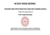 M.TECH THESIS DEFENCE OFFSHORE WIND SPEED PREDICTION USING DEEP LEARNING MODELS Under the supervision of Prof. Pradip Swarnakar DEPARTMENT OF SUSTAINABLE ENERGY ENGINEERING INDIAN INSTITUTE OF TECHNOLOGY (IIT) KANPUR, INDIA 1 Contents Introduction Methodology Results Conclusions References 2 Global Scenario for Renewable Energy Installed Capacity (2024): • Total: ~3500 GW (~30% of global electricity). • Solar PV: 1,200 GW | Wind: 950 GW | Hydropower: 1,200 GW. Top Players: • China: Leader in solar, wind, and hydropower. • USA: Rapid growth in wind, solar, and offshore wind. • EU: Aggressive Green Deal targets; offshore wind focus. • India: Fast-growing solar and wind capacity. 3 Global Scenario for Renewable Energy Investments: • $500B+ (2024) focusing on solar PV, wind, and green hydrogen. Future Outlook: • Renewables to contribute 70–80% of electricity by 2050. Challenges: • Grid integration, storage scalability, supply chain bottlenecks, and policy gaps. 4 Indian Scenario for Renewable Energy Installed Capacity: • Total renewable energy capacity: Over 125 GW (as of early 2025). • Solar energy: ~70 GW. • Wind energy: ~45 GW. • Biomass energy: ~10 GW. • Small hydro: ~5 GW. Global Standing: • India ranks 4th globally in wind power and 5th in solar energy. • Among the top renewable energy-producing countries worldwide. 5 Indian Scenario for Renewable Energy Future Prospects: 1. Target 2030: • Achieve 500 GW of non-fossil fuel energy capacity. • Generate 50% of electricity from renewables. 2. Solar Energy Growth: • Focus on large-scale solar parks and floating solar plants. • Expansion of rooftop solar programs to reach 40 GW target. 3. Wind Energy Opportunities: • Offshore wind projects: India’s first offshore wind farm is being planned in Gujarat and then in Tamil Nadu. 6 Wind Energy India is one of the global leaders in wind energy, leveraging its vast coastline and windy regions to meet renewable energy goals. Installed Capacity: • 45 GW of installed onshore wind capacity (as of 2024), making India the 4th largest wind energy producer globally. • Major contributing states: Tamil Nadu, Gujarat, Maharashtra, Karnataka, and Rajasthan. Wind Resource Potential: • Estimated potential of 302 GW at 100m hub height, primarily concentrated in the southern and western states. 7 Wind Energy Future Outlook: 1. 2030 Target: • Achieve 140 GW of wind energy capacity (onshore and offshore combined). • Offshore wind to contribute 30 GW. 2. Technology and Investment: • Increasing use of larger wind turbines and AI for predictive maintenance. • Investment from domestic and international players to scale up offshore projects. 3. Integration with Hydrogen Economy: • Wind energy to play a key role in producing green hydrogen, especially from offshore installations. 8 Offshore Wind Energy Emerging Sector: • India's offshore wind potential is estimated at 70 GW along the coasts of Gujarat and Tamil Nadu with vast coastline of about 7600 kms. Key Projects: • The First Offshore Wind Project (planned in Gujarat) will have a 1 GW capacity, under development by the Ministry of New and Renewable Energy (MNRE). This Photo by Unknown Author is licensed under CC BY-SA 9 Offshore Wind Energy Policy and Initiatives: • National Offshore Wind Energy Policy (2015): Provides guidelines for offshore wind development. • Collaborations with global entities like the International Renewable Energy Agency (IRENA) and European countries. Challenges: This Photo by Unknown Author is licensed under CC BY-SA • High upfront costs and need for advanced technologies. • Lack of infrastructure for offshore grid connectivity. 10 Why Offshore? Higher Wind Speeds: •Offshore wind speeds are generally stronger and more consistent compared to onshore locations, resulting in higher energy generation potential. Large Resource Potential: •Offshore wind offers immense untapped potential, particularly in India, with an estimated capacity of 70 GW within shallow coastal waters. Reduced Land Constraints: •Offshore wind projects avoid the challenges of land acquisition and competing land use that are common with onshore wind farms. Proximity to High Demand Centers: •Coastal areas often have high population density and energy demand. Offshore wind farms can supply power directly to these regions, reducing transmission losses. 11 Why Offshore? Less Visual and Noise Impact: • Offshore installations are far from populated areas, minimizing aesthetic and noise concerns that often arise with onshore wind farms. Scalability: • Offshore projects allow for larger turbines and expansive arrays, which are not feasible onshore due to space and logistical constraints. Support for Energy Transition Goals: • Offshore wind aligns with global and national renewable energy targets, playing a critical role in reducing reliance on fossil fuels and achieving net-zero goals. 12 Facilitating Offshore Wind in India (FOWIND) • It is a project aimed at advancing India's offshore wind energy sector. • This project is funded by the European Union and implemented by a consortium led by the Global Wind Energy Council (GWEC), in collaboration with the Center for Study of Science, Technology and Policy (CSTEP), the World Institute of Sustainable Energy (WISE), DNV GL, and other partners. 13 Facilitating Offshore Wind in India (FOWIND) Key Objectives of FOWIND: 1. Capacity Building: Enhancing the technical and institutional capabilities of stakeholders to plan and implement offshore wind projects. 2. Mapping Offshore Wind Resources: Conducting feasibility studies and wind resource assessments to identify potential offshore wind energy sites. 3. Policy and Regulatory Frameworks: Providing recommendations to support the development of policies and regulations for offshore wind energy. 4. Industry Engagement: Facilitating dialogue and collaboration between Indian and international industry players t