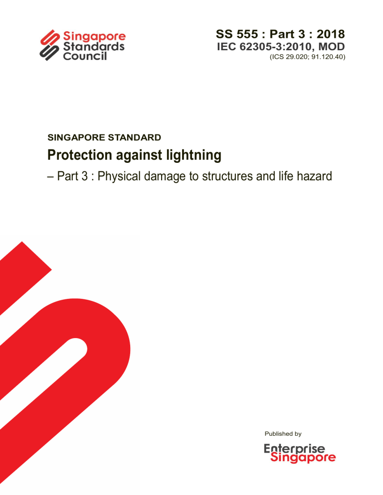 SS 555 : Part 3 : 2018 IEC 62305-3:2010, MOD (ICS 29.020; 91.120.40) SINGAPORE STANDARD Protection against lightning – Part 3 : Physical damage to structures and life hazard Published by SS 555 : Part 3 : 2018 IEC 62305-3:2010, MOD (ICS 29.020; 91.120.40) SINGAPORE STANDARD Protection against lightning – Part 3 : Physical damage to structures and life hazard All rights reserved. Unless otherwise specified, no part of this Singapore Standard may be reproduced or utilised in any form or by any means, electronic or mechanical, including photocopying and microfilming, without permission in writing from Enterprise Singapore. Request for permission can be sent to: standards@enterprisesg.gov.sg. © IEC 2010 – All rights reserved © Enterprise Singapore 2018 ISBN 978- 981-48-3503-9 SS 555 : Part 3 : 2018 This Singapore Standard was approved by Electrical and Electronic Standards Committee on behalf of the Singapore Standards Council on 13 July 2018. First published, 2010 First revision, 2018 The Electrical and Electronic Standards Committee, appointed by the Standards Council, consists of the following members: Name Capacity Chairman : Er. Peter Leong Weng Kwai Individual Capacity Deputy Chairman : Mr Andrew Chow Individual Capacity Dr Kang Cheng Guan Energy Market Authority Advisor : Mr Renny Yeo Ah Kiang Individual Capacity Secretary : Mr Jason Low Enterprise Singapore Members : Dr Ashwin Khambadkone Dr Chua Sze Wey Mr Michael Goh Chye Soon National University of Singapore Agency for Science, Technology and Research Singapore Electrical Contractors and Licensed Electrical Workers Association Nanyang Technological University Building and Construction Authority SP Group Housing & Development Board Individual Capacity Association of Consulting Engineers Singapore Individual Capacity TUV SUD PSB Pte Ltd Land Transport Authority Singapore Manufacturing Federation Singapore Civil Defence Force Individual Capacity The Institution of Engineers, Singapore National Environment Agency Enterprise Singapore Singapore Electrical Trades Association Assoc Prof Gooi Hoay Beng Er. Hashim Bin Mansoor Mr Koh Liang Hock Er. Kwang Cheok Sen Er. Lim Say Leong Er. Ling Shiang Yun Er. Kenneth Liu Mr Ng Soon Lee Mr Sim Wee Meng Mr Tan Beng Koon SAC Christopher Tan Eng Kiong Er. Tan Hak Khoon Er. Joseph Toh Siaw Hui Mr Justin Wu Chuyou Mr Andrew Yap Mr Nelson Yeap 2 COPYRIGHT SS 555 : Part 3 : 2018 The Technical Committee on Buildings Facilities and Services, appointed by the Electrical and Electronic Standards Committee and responsible for the preparation of this standard, consists of representatives from the following organisations: Name Capacity Chairman : Er. Kenneth Liu Individual Capacity Deputy Chairman : Er. Hashim Bin Mansoor Building and Construction Authority Secretary : Mr Allan Koh Enterprise Singapore Members : Mr Cai Lin Fan Mr Chua Kian Chong Mr David Goh King Siang Er. Ken Jung Gee Keong Land Transport Authority Energy Market Authority Singapore Manufacturing Federation Singapore Electrical Contractors and Licensed Electrical Workers Association Individual Capacity Association of Consulting Engineers Singapore Fire Safety Managers’ Association (Singapore) JTC Corporation Singapore Civil Defence Force National University of Singapore Singapore Institute of Architects Nanyang Technological University Housing & Development Board The Institution of Engineers, Singapore Mr K. Seshadri Er. Adeline Koh Mr Benedict Koh Yong Pheng Mr Ng Eng Sin Mr Pang Tong Teck Dr Pritam Das Mr Sim Kooi Chuan Assoc Prof So Ping Lam Er. Tan Kok Koon Dr Zhou Yi The Working Group on Lightning Protection, appointed by the Technical Committee to assist in the preparation of this standard, comprises the following experts who contribute in their individual capacity: Name Convenor : Er. Prof. Liew Ah Choy Deputy Convenor : Er. Chua Hian Koon Secretaries : Ms Karen Tan Ms Aruna Charukesi Palaninathan Members : Mr Cheong Weng Yip Mr Foo Lian Choon Mr Koh Nguang Siah Er. Lim Kwee Guan Er. Ling Teong Hui Patrick Er. Loh Teck Liang Darrick Mr Mah King Kheong Ms Mavis Ng Mr Seoh Zhi Wen Assoc Prof So Ping Lam Er. Tan Keng Swee 3 COPYRIGHT SS 555 : Part 3 : 2018 Members : Er. Teh Siaw Peng Mr Yeo Peck Chian The organisations in which the experts of the Working Group are involved are: Association of Consulting Engineers Singapore Building and Construction Authority Changi Airport Group (Singapore) Pte Ltd Defence Science and Technology Agency DSO National Laboratories Housing & Development Board Nanyang Technological University National Environment Agency National University of Singapore Nanyang Technological University PSA Corporation Ltd Singapore Manufacturing Federation SP Group The Institution of Engineers, Singapore 4 COPYRIGHT SS 555 : Part 3 : 2018 CONTENTS NATIONAL FOREWORD .................................................................................................... 10 FOREWORD ...................................................................................................................... 12 INTRODUCTION ................................................................................................................ 14 1 Scope .......................................................................................................................... 15 2 Normative references ................................................................................................... 15 3 Terms and definitions ................................................................................................... 16 4 Lightning protection system (LPS) ................................................................................ 19 5 4.1 Class of LPS ....................................................................................................... 19 4.2 Design of the LPS ............................................................................................... 20 4.3 Continuity of steelwork in reinforced concrete struct