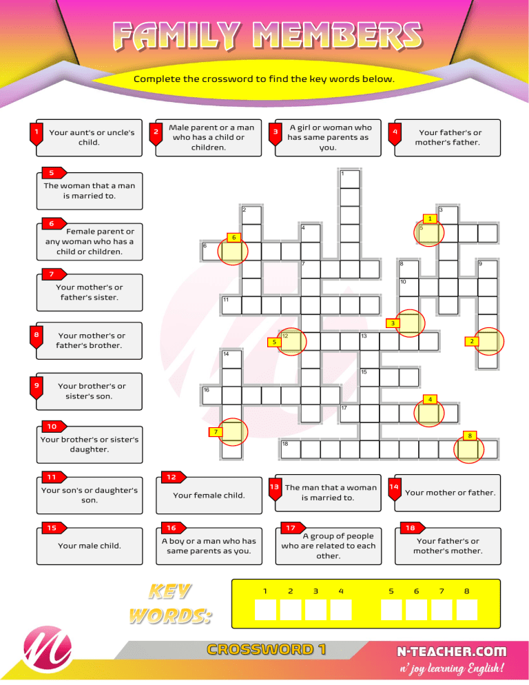 Complete the crossword to find the key words below. 1 Your aunt's or uncle's child. 2 Male parent or a man who has a child or children. 3 A girl or woman who has same parents as you. 5 4 Your father's or mother's father. 1 The woman that a man is married to. 2 3 1 6 4 Female parent or any woman who has a child or children. 5 6 6 7 8 9 7 10 Your mother's or father's sister. 11 3 8 Your mother's or father's brother. 12 13 2 5 14 15 9 Your brother's or sister's son. 16 4 17 10 7 Your brother's or sister's daughter. 8 18 EclipseCrossword.com 11 12 Your son's or daughter's son. 15 13 The man that a woman Your female child. 16 Your male child. 14 is married to. 17 18 A group of people who are related to each other. A boy or a man who has same parents as you. 1 2 3 4 Your mother or father. Your father's or mother's mother. 5 6 7 8