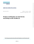 DNV-SE-0073 Edition January 2018 Amended September 2021 Project certification of wind farms according to IEC 61400-22 The PDF electronic version of this document available at the DNV website dnv.com is the official version. If there are any inconsistencies between the PDF version and any other available version, the PDF version shall prevail. DNV AS This copy of the document is intended for use by CEN 55 only. Downloaded 2025-05-28. No further distribution shall be made. SERVICE SPECIFICATION DNV service specifications contain procedural requirements for obtaining and retaining certificates and other conformity statements to the objects, personnel, organisations and/or operations in question. © DNV AS January 2018 Any comments may be sent by e-mail to rules@dnv.com This service document has been prepared based on available knowledge, technology and/or information at the time of issuance of this document. The use of this document by other parties than DNV is at the user's sole risk. DNV does not accept any liability or responsibility for loss or damages resulting from any use of this document. This copy of the document is intended for use by CEN 55 only. Downloaded 2025-05-28. No further distribution shall be made. FOREWORD The numbering and/or title of items containing changes is highlighted in red. Amendments September 2021 Topic Rebranding to DNV Reference All Description This document has been revised due to the rebranding of DNV GL to DNV. The following have been updated: the company name, material and certificate designations, and references to other documents in the DNV portfolio. Some of the documents referred to may not yet have been rebranded. If so, please see the relevant DNV GL document. No technical content has been changed. Changes January 2018 The following main changes have been made in this edition of the document: — Adding intelligent approach to determine the amount of manufacturing surveillances rather having a fixed rate — Adding IECRE requirements and information — New applicable standard on transport and installation added ST-0054 and optional service updated and added such met mast, EMC, Navigation and aviation aids, Shop Approval and Lifetime extension — Power performance and availability related ISO/IEC, IEEE standards added — Removing GL-IV-7 for substations — References updated, listing latest applicable standards, editorial adjustments e.g. of definitions, standards and figures to support better understanding and application — Approaches in reference to measurements of external conditions and ISO 17025 application elaborated Detailed list of changes The following table refers and lists the changes made in this edition of the document summarising the consequence of change. Reference Description Figure 1-2 Adjusted figure regarding the bracket for sub-structure. At the right side of Fig 1-2 the "substructure" was shown as reaching all the way to the nacelle. The } bracket is now split into two; one for "tower" above platform level and one for "sub-structure" connecting the "tower" and the "foundation". This is in line with the definitions. [3.4.3.3], 3rd para "Fatigue design documents shall be based on…" Substituted DNV-OS-J201 by DNVGLST-0145, removed GL-IV-7, reference to DNVGL-RP-0005 (= DNVGL-RP-C203) is achieved through reference to DNVGL-OS-C101, which is in DNVGL-ST-0145 as well. Service specification — DNV-SE-0073. Edition January 2018, amended September 2021 Project certification of wind farms according to IEC 61400-22 DNV AS Page 3 Changes - current This document supersedes the December 2014 edition of DNVGL-SE-0073. This copy of the document is intended for use by CEN 55 only. Downloaded 2025-05-28. No further distribution shall be made. CHANGES – CURRENT General , and after first paragraph below Figure 3-2 Inspection tool implemented: Alternatively to the fixed rate of at least 10% manufacturing surveillance a variable amount of manufacturing surveillance can be estimated by using an intelligent approach implemented in a DNV GL calculation tool. This tool is an intelligent riskbased tool to determine the required amount of manufacturing surveillances based on design, site conditions and manufacturing conditions. Throughout document, especially [3.4] Removed the GL-IV-7 from the DNVGL-SE-0073 as it has not been a request by customers to apply it so far. Throughout document, especially [3.5] Update to reference newest DNV GL standard for substations. Throughout document, mainly Table 1-3, [1.1], [2.3], [2.4] and [2.6] IEC and IECRE updates: Document setup 61400-22 vs. IECRE revisted and updated - update of language around CBC (advisory committee) [2.3], [3.7.7] Clarification sheets: Updated information on WT CAC clarification sheets and IECRE implemented. Throughout document Substituted all legacy documents such as DNV-OS-J101, DNV-RP-J301 (cable) and GL-IV-1/-2 by DNV GL documents. [3.3.6.1]Commissioning, General DNV GL shall attend the commissioning of the first two wind turbines and at least at one wind turbine for every 50 wind turbines being installed in the wind farm. Added guidance text: The witnessing should cover a representative number of wind turbines of the wind farm. A risk based approach should be applied and witnessing should take place at 20% of the quantity of the wind turbine. [1.3], "Components of a substation are..." "Components of a substation are..." onshore: transformer station, incuding installations and equipment - transformation station. Structure offshore: topside, including- installations and equipment - topside - structure, including installations and equipment. Table 1-2, "definition component" Component: main part of an asset. In this service specification, the term refers to rotornacelle-assembly, part of the support structure of the wind turbine (tower, sub-structure and foundation). For substation the term refers to topside equipment, topside structure and parts of the support structure for substa