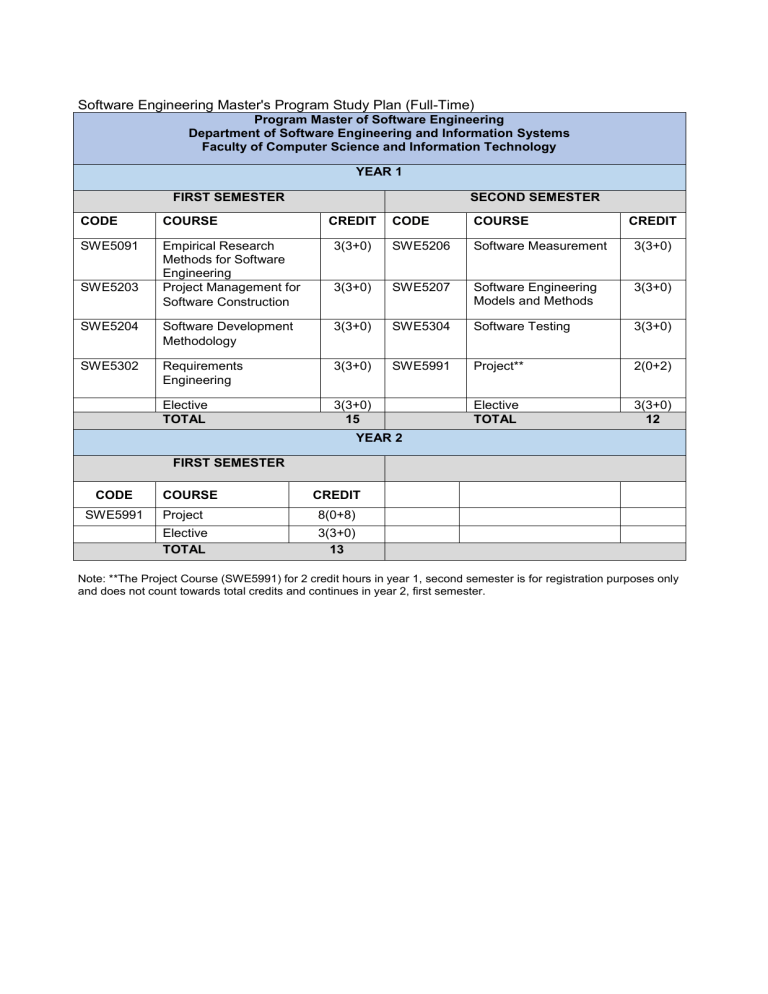 Software Engineering Master's Program Study Plan (Full-Time) Program Master of Software Engineering Department of Software Engineering and Information Systems Faculty of Computer Science and Information Technology YEAR 1 FIRST SEMESTER SECOND SEMESTER CODE COURSE CREDIT CODE COURSE CREDIT SWE5091 Empirical Research Methods for Software Engineering Project Management for Software Construction 3(3+0) SWE5206 Software Measurement 3(3+0) 3(3+0) SWE5207 Software Engineering Models and Methods 3(3+0) SWE5204 Software Development Methodology 3(3+0) SWE5304 Software Testing 3(3+0) SWE5302 Requirements Engineering 3(3+0) SWE5991 Project** 2(0+2) Elective TOTAL 3(3+0) 15 Elective TOTAL 3(3+0) 12 SWE5203 YEAR 2 FIRST SEMESTER CODE COURSE CREDIT SWE5991 Project 8(0+8) Elective TOTAL 3(3+0) 13 Note: **The Project Course (SWE5991) for 2 credit hours in year 1, second semester is for registration purposes only and does not count towards total credits and continues in year 2, first semester. Software Engineering Master's Program Study Plan (Part-Time) Program Master of Software Engineering Department of Software Engineering and Information Systems Faculty of Computer Science and Information Technology YEAR 1 FIRST SEMESTER SECOND SEMESTER CODE COURSE CREDIT CODE COURSE CREDIT SWE5091 Empirical Research Methods for Software Engineering Project Management for Software Construction TOTAL 3(3+0) SWE5206 Software Measurement 3(3+0) 3(3+0) SWE5207 Software Engineering Models and Methods TOTAL 3(3+0) SWE5203 6 6 YEAR 2 FIRST SEMESTER SECOND SEMESTER CODE COURSE CREDIT CODE COURSE CREDIT SWE5204 Software Development Methodology Requirements Engineering TOTAL 3(3+0) SWE5304 Software Testing 3(3+0) Elective 3(3+0) TOTAL 6 SWE5302 3(3+0) 6 YEAR 3 FIRST SEMESTER SECOND SEMESTER CODE COURSE CREDIT CODE COURSE CREDIT SWE5991 Project ** 2(0+2) SWE5991 Project 8(0+8) Elective Elective TOTAL 3(3+0) 3(3+0) 6 TOTAL 10 Note: **The Project Course (SWE5991) for 2 credit hours in year 3, first semester is for registration purposes only and does not count towards total credits and continues in year 3, second semester.